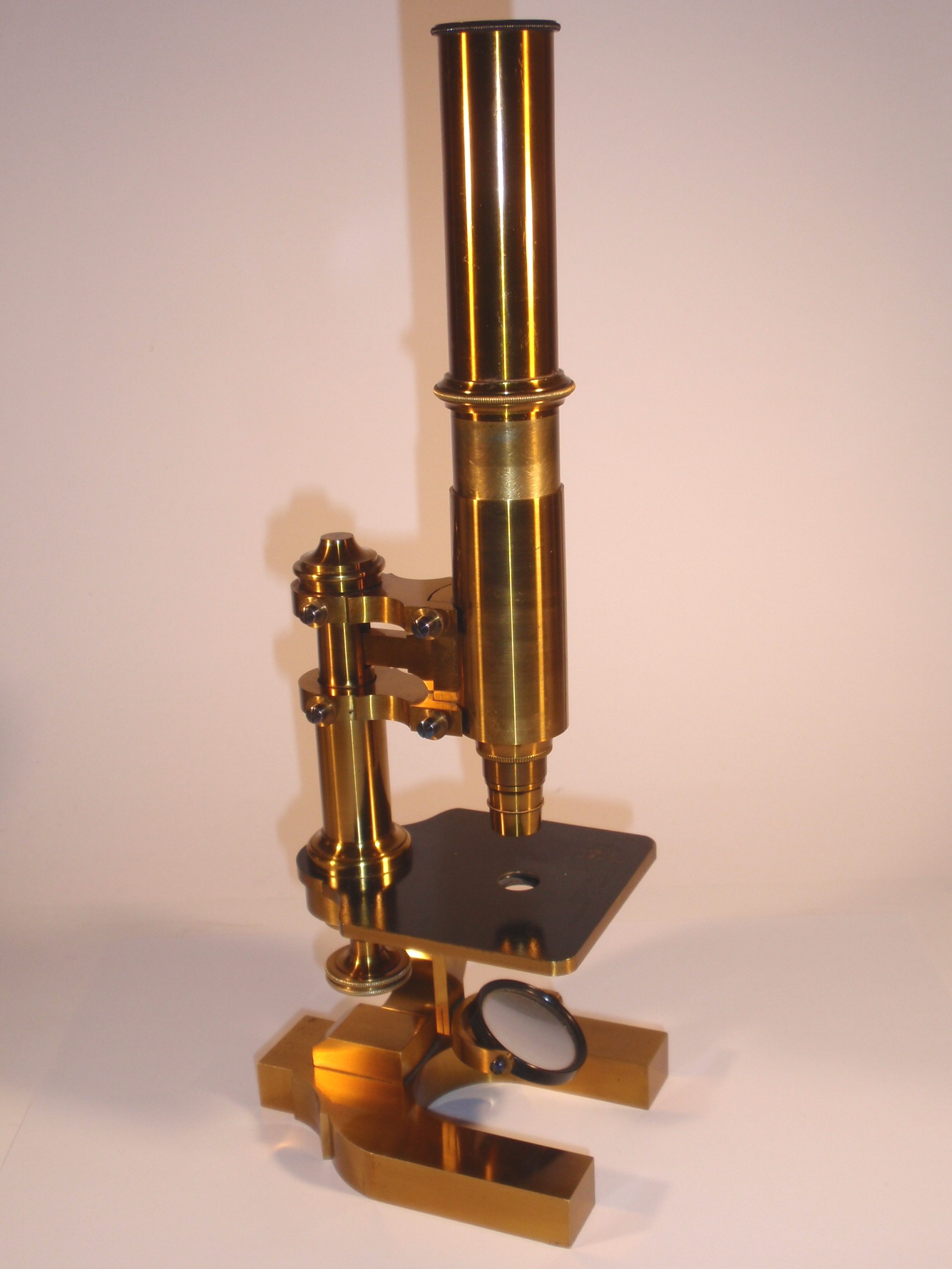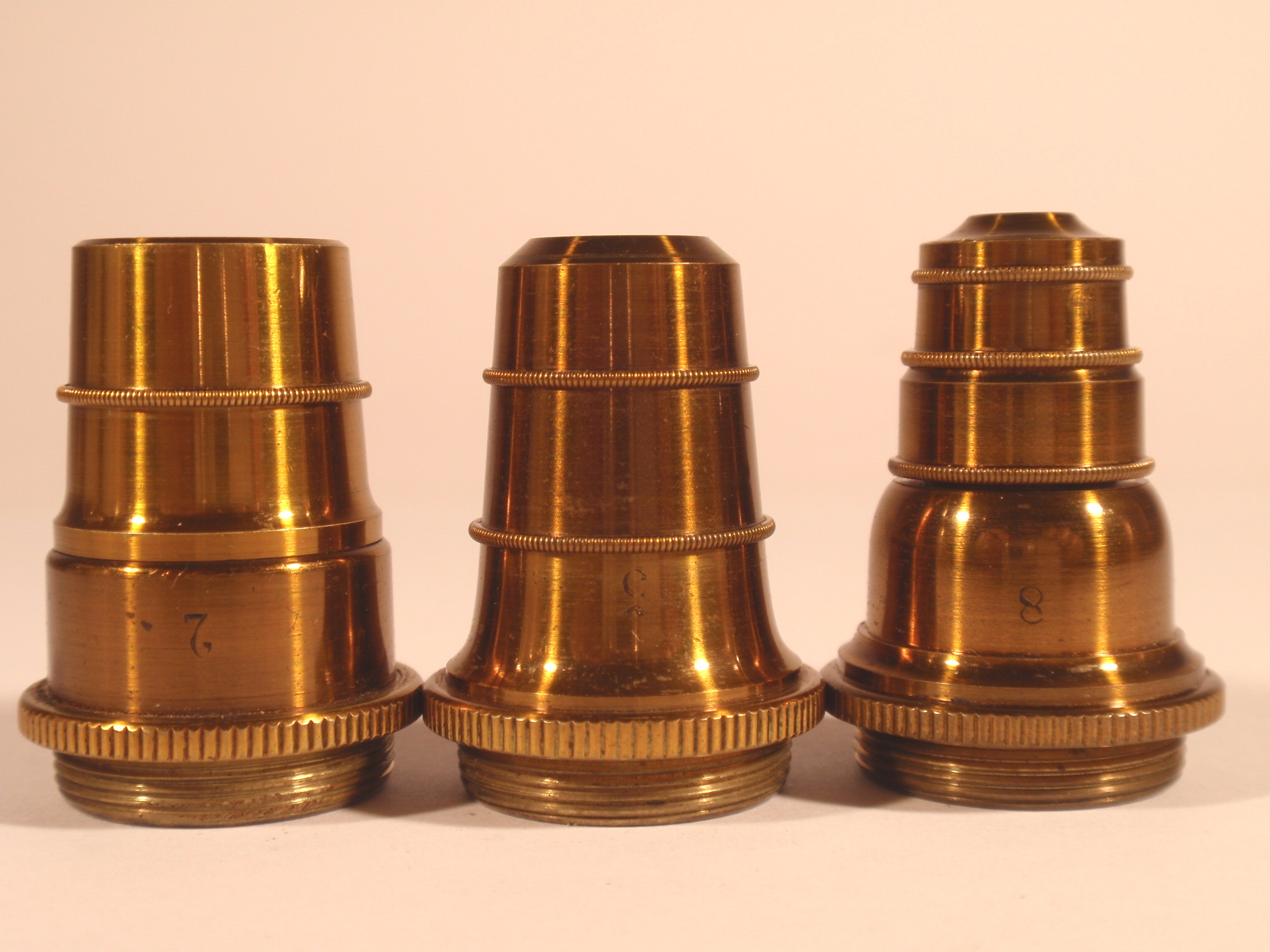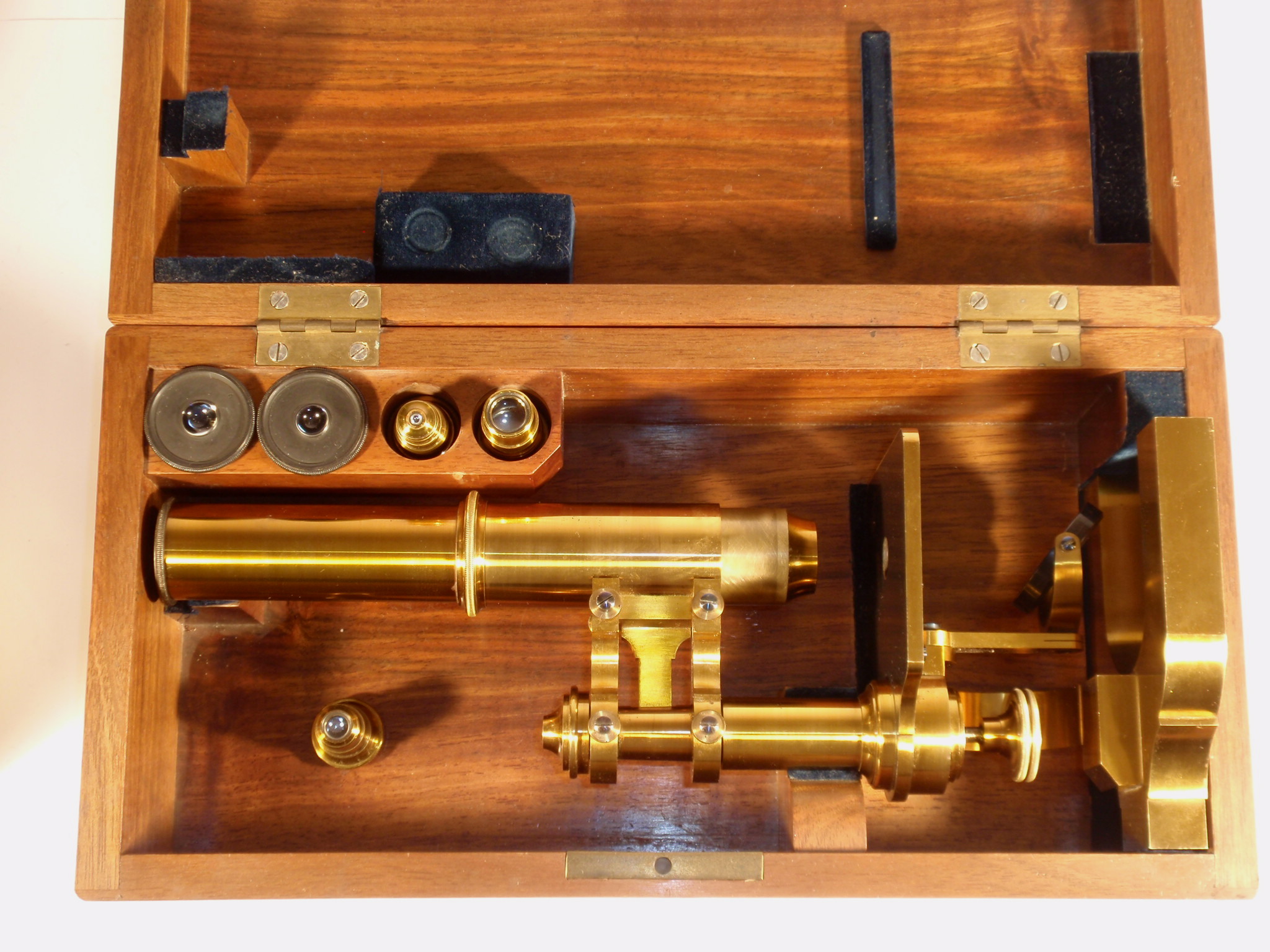 voll Messing, original zaponiert, ca. 1865 - 1867; Höhe 32 cm, 3 Okulare (Nr. 1, 2 und 3), 3 Objektive (Nr. 5, 7 und 8) - alles komplett und original! Grobeinstellung per Tubus, Feineinstellung hinten unter der Säule, Lochblendenscheibe unter dem Tisch; Signatur auf dem Tisch "Engelbert & Hensoldt Wetzlar"; unter dem Tubusträger die Nummer "692"; Mikroskop und alle Teile sind vollkommen original und sehr gut erhalten! Das Mikroskop scheint kaum benutzt worden zu sein. Mechanisch und optisch sehr gut, Erhaltung nicht zu übertreffen! Sehr schöner Kasten.