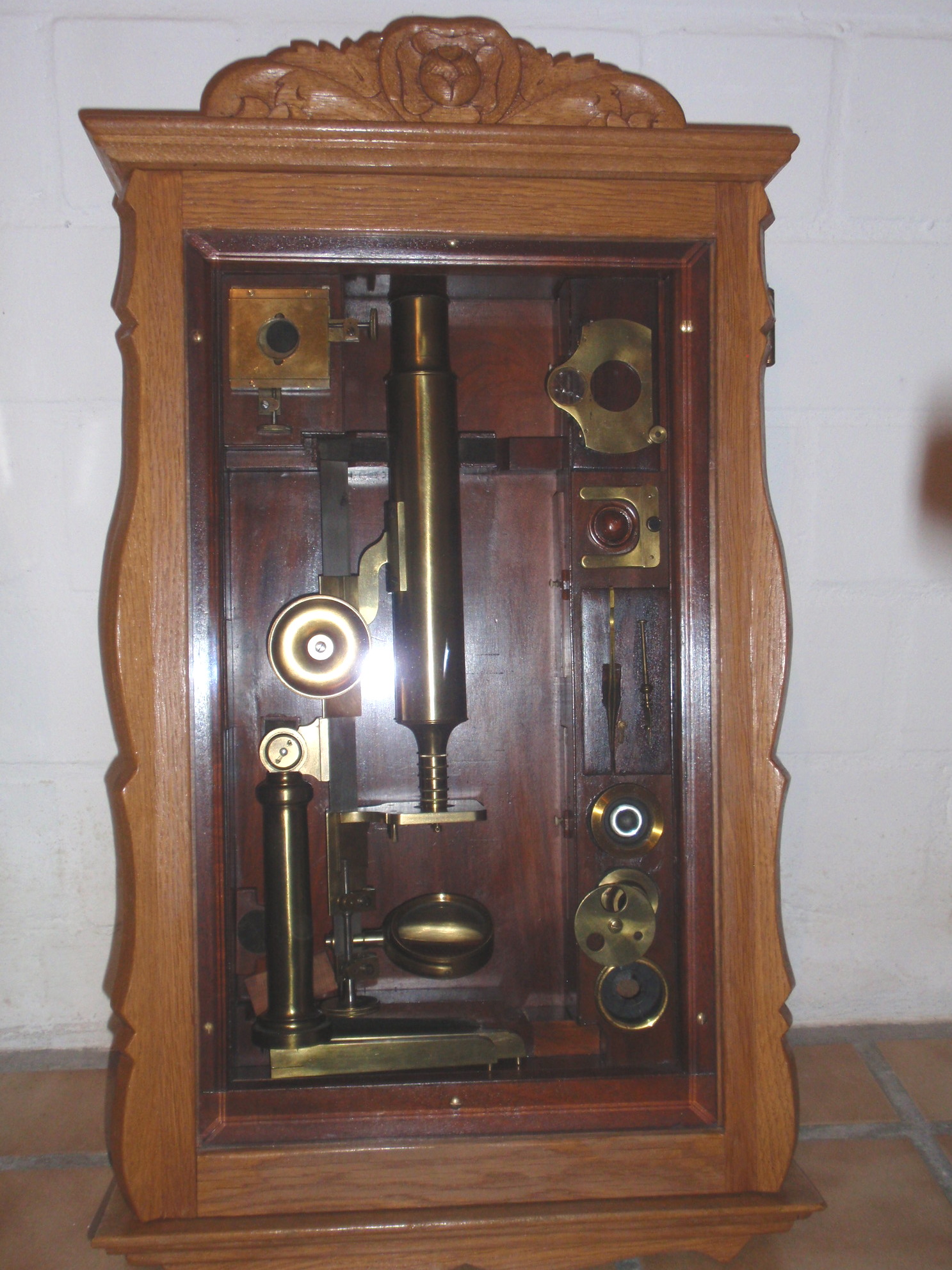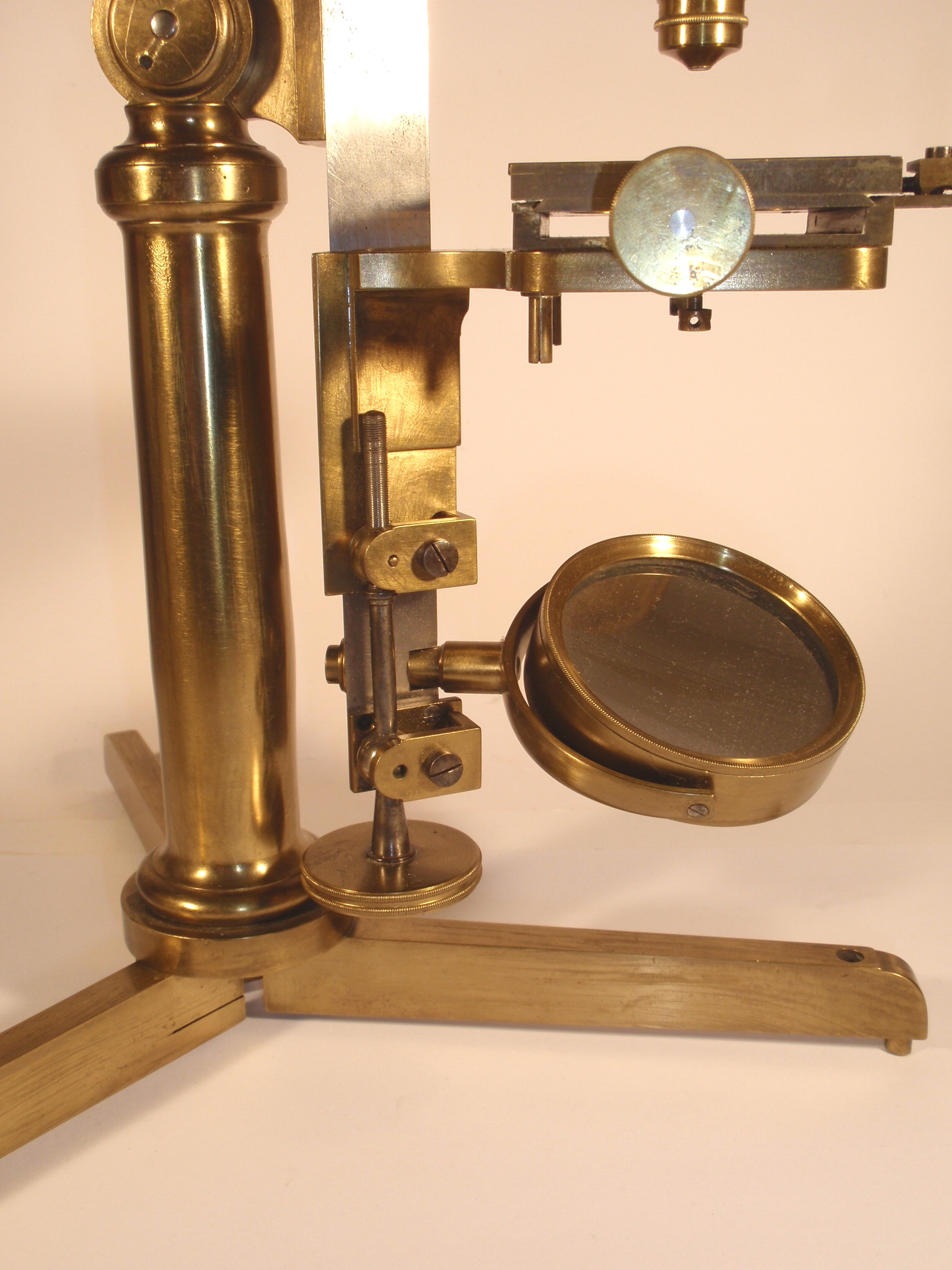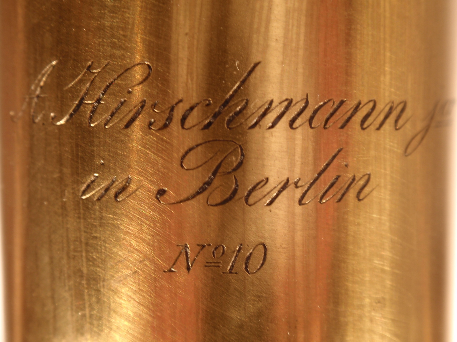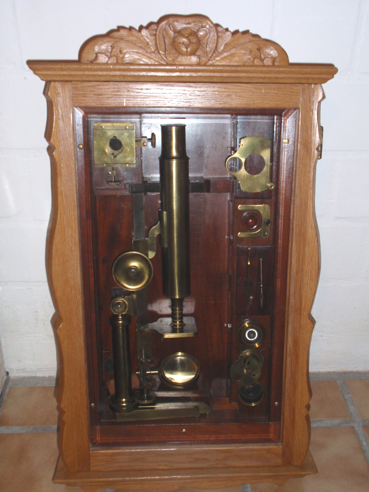 voll Messing, original zaponiert, ca. 1830 - 1832, Höhe 49 cm, 1 einschraubbares und nummeriertes Okular (Nr. 1), 1 Satzobjektiv mit 6 nummerierten und verschraubbaren Segmenten (von Nr. 1 bis Nr. 6), Grobeinstellung mit dem großen Rändelrad (der Tubus bewegt sich), Feineinstellung unten am Dreikantstab auf den Tisch wirkend; diverses Zubehör in einem Kasten mit Glastür zu Präsentationszwecken: alter Kreuztisch, Dunkelfeldkondensor, Kondensor mit Irisblende, Kondensoreinsatz mit Lochblendenscheibe, Tischpinzette, geschwungener Präparatehalter, Handpinzette; Kippstativ, Signatur auf dem Tubus "A. Hirschmann jor in Berlin No. 10"; mechanisch und optisch sehr gut, Erhaltung gut; schöner Präsentationskasten mit Glasfront. Dieser Kasten verwendet als Innenleben den Originalkasten. Die Fronttür mit Glas und Umrahmung ist eine alte Arbeit und vermutlich etwas später als das Mikroskop entstanden (kann an die Wand gehängt werden). - Hier handelt es sich um das 10. Mikroskop von Carl August Hirschmann (daher die Bezeichnung "jor, entspricht "Junior"). Sein Vater, W. Hirschmann, hat seine Mikroskope entsprechend mit "sen" signiert. Der Senior war ein Mitarbeiter von Schieck gewesen und hat später Mikroskope ähnlich in der Bauart von Schieck und Pistor hergestellt. Der Junior, Carl August Hirschmann hatte seit etwa 1830 eine eigene Werkstatt in Berlin und ist ca. 1845 gestorben. Auch diesem Mikroskop sieht man noch die große Ähnlichkeit mit den Mikroskopen Schiecks bzw. Pistors an. - Eine absolute Rarität aus Berlin!