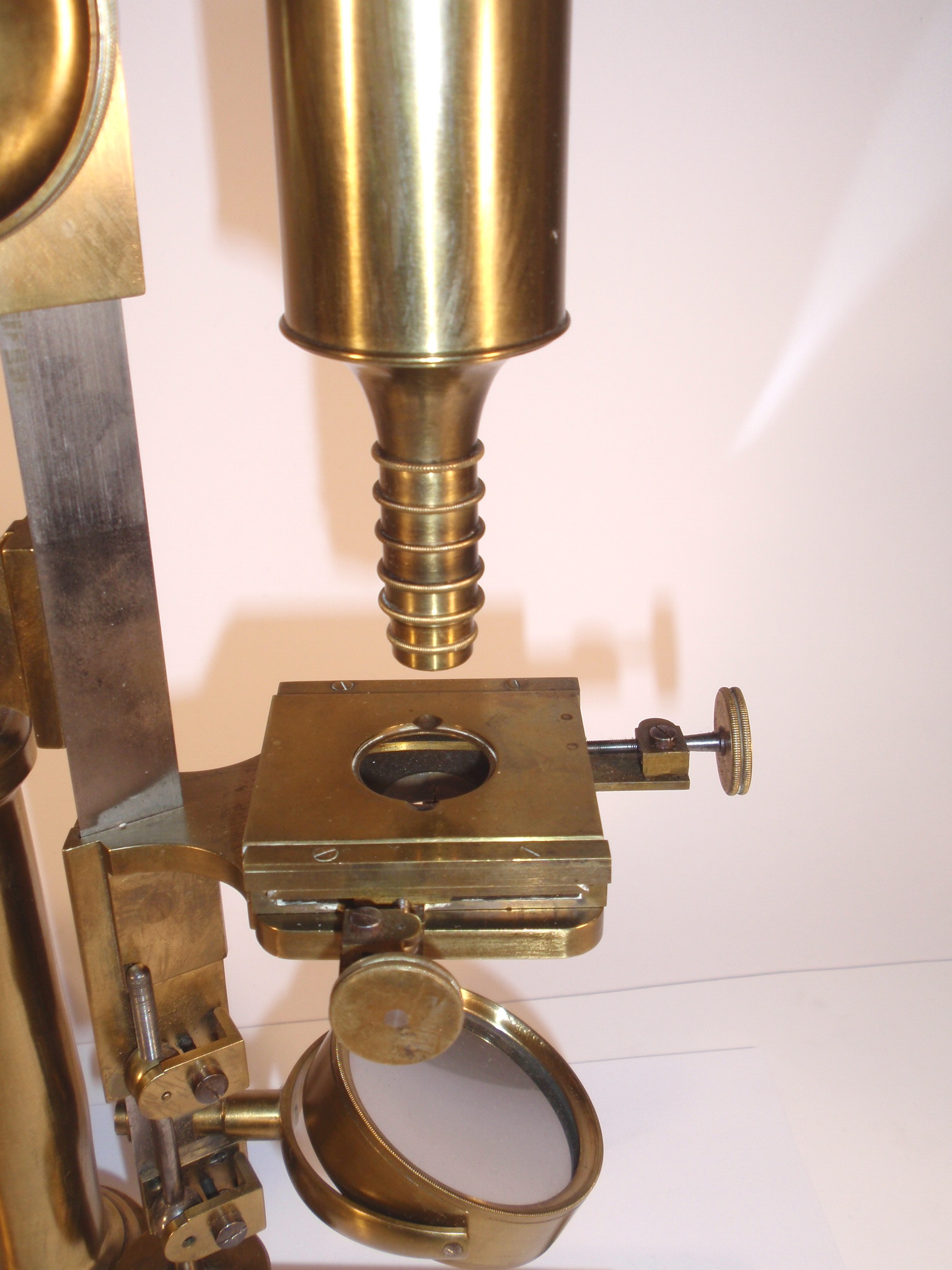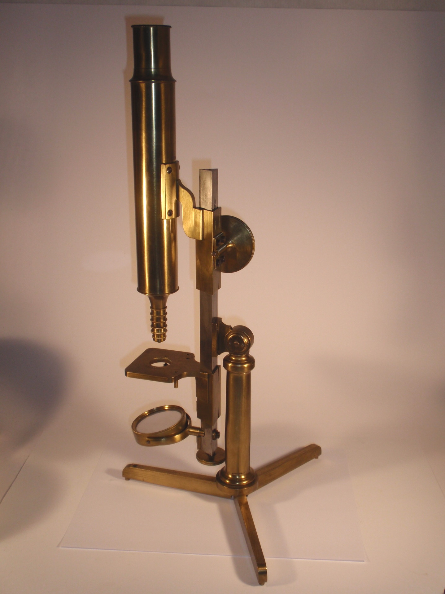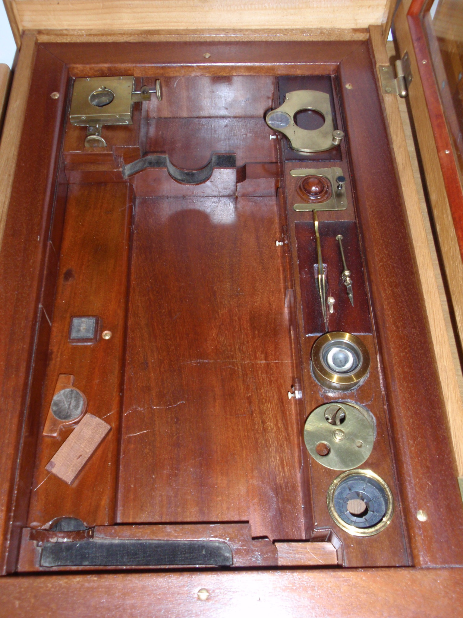 voll Messing, original zaponiert, ca. 1830 - 1832, Höhe 49 cm, 1 einschraubbares und nummeriertes Okular (Nr. 1), 1 Satzobjektiv mit 6 nummerierten und verschraubbaren Segmenten (von Nr. 1 bis Nr. 6), Grobeinstellung mit dem großen Rändelrad (der Tubus bewegt sich), Feineinstellung unten am Dreikantstab auf den Tisch wirkend; diverses Zubehör in einem Kasten mit Glastür zu Präsentationszwecken: alter Kreuztisch, Dunkelfeldkondensor, Kondensor mit Irisblende, Kondensoreinsatz mit Lochblendenscheibe, Tischpinzette, geschwungener Präparatehalter, Handpinzette; Kippstativ, Signatur auf dem Tubus "A. Hirschmann jor in Berlin No. 10"; mechanisch und optisch sehr gut, Erhaltung gut; schöner Präsentationskasten mit Glasfront. Dieser Kasten verwendet als Innenleben den Originalkasten. Die Fronttür mit Glas und Umrahmung ist eine alte Arbeit und vermutlich etwas später als das Mikroskop entstanden (kann an die Wand gehängt werden). - Hier handelt es sich um das 10. Mikroskop von Carl August Hirschmann (daher die Bezeichnung "jor, entspricht "Junior"). Sein Vater, W. Hirschmann, hat seine Mikroskope entsprechend mit "sen" signiert. Der Senior war ein Mitarbeiter von Schieck gewesen und hat später Mikroskope ähnlich in der Bauart von Schieck und Pistor hergestellt. Der Junior, Carl August Hirschmann hatte seit etwa 1830 eine eigene Werkstatt in Berlin und ist ca. 1845 gestorben. Auch diesem Mikroskop sieht man noch die große Ähnlichkeit mit den Mikroskopen Schiecks bzw. Pistors an. - Eine absolute Rarität aus Berlin!