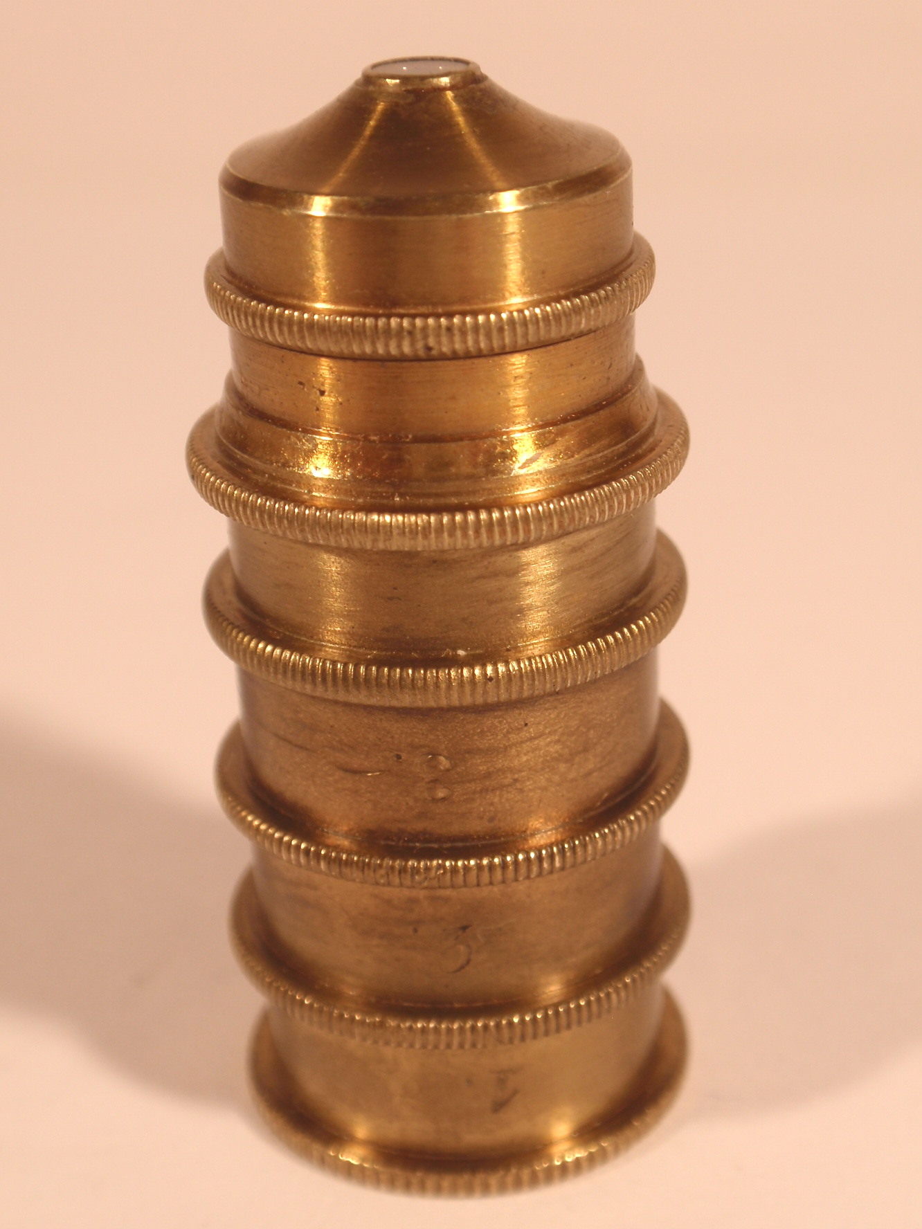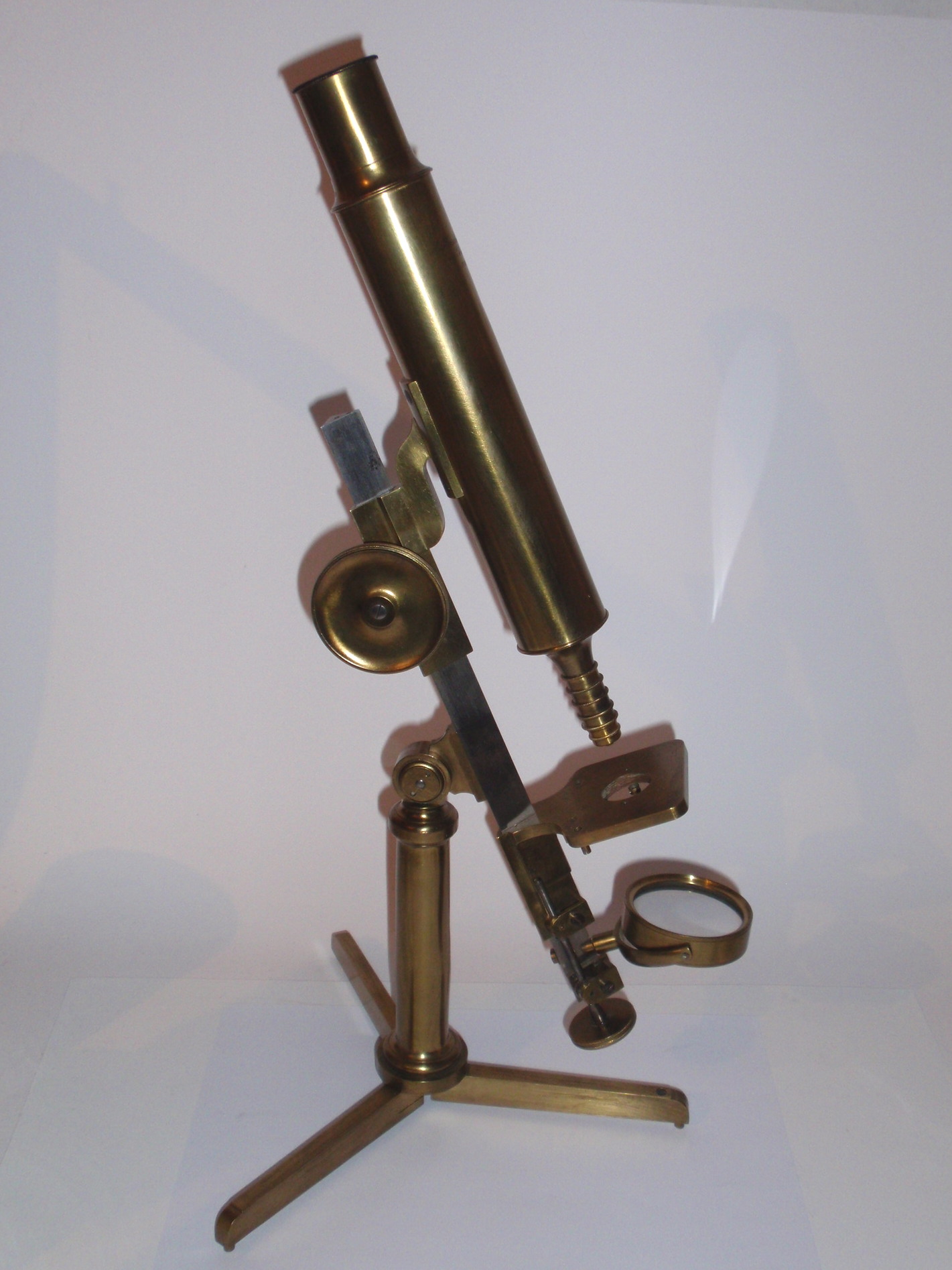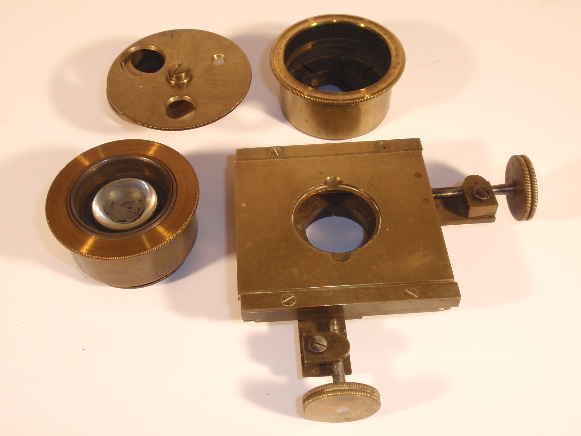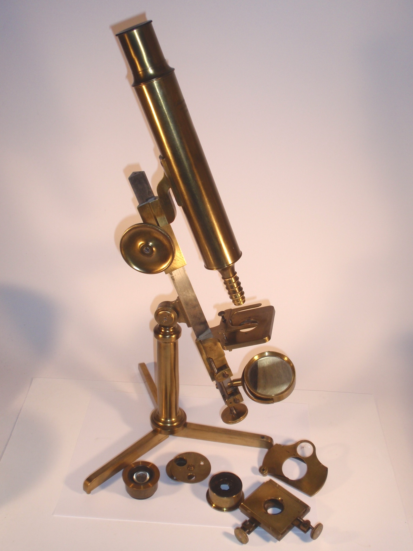 voll Messing, original zaponiert, ca. 1830 - 1832, Höhe 49 cm, 1 einschraubbares und nummeriertes Okular (Nr. 1), 1 Satzobjektiv mit 6 nummerierten und verschraubbaren Segmenten (von Nr. 1 bis Nr. 6), Grobeinstellung mit dem großen Rändelrad (der Tubus bewegt sich), Feineinstellung unten am Dreikantstab auf den Tisch wirkend; diverses Zubehör in einem Kasten mit Glastür zu Präsentationszwecken: alter Kreuztisch, Dunkelfeldkondensor, Kondensor mit Irisblende, Kondensoreinsatz mit Lochblendenscheibe, Tischpinzette, geschwungener Präparatehalter, Handpinzette; Kippstativ, Signatur auf dem Tubus "A. Hirschmann jor in Berlin No. 10"; mechanisch und optisch sehr gut, Erhaltung gut; schöner Präsentationskasten mit Glasfront. Dieser Kasten verwendet als Innenleben den Originalkasten. Die Fronttür mit Glas und Umrahmung ist eine alte Arbeit und vermutlich etwas später als das Mikroskop entstanden (kann an die Wand gehängt werden). - Hier handelt es sich um das 10. Mikroskop von Carl August Hirschmann (daher die Bezeichnung "jor, entspricht "Junior"). Sein Vater, W. Hirschmann, hat seine Mikroskope entsprechend mit "sen" signiert. Der Senior war ein Mitarbeiter von Schieck gewesen und hat später Mikroskope ähnlich in der Bauart von Schieck und Pistor hergestellt. Der Junior, Carl August Hirschmann hatte seit etwa 1830 eine eigene Werkstatt in Berlin und ist ca. 1845 gestorben. Auch diesem Mikroskop sieht man noch die große Ähnlichkeit mit den Mikroskopen Schiecks bzw. Pistors an. - Eine absolute Rarität aus Berlin!