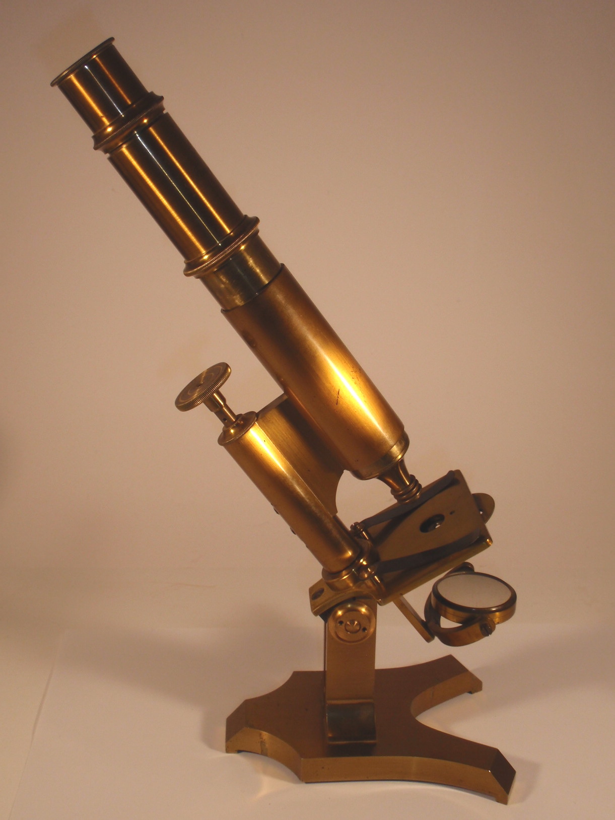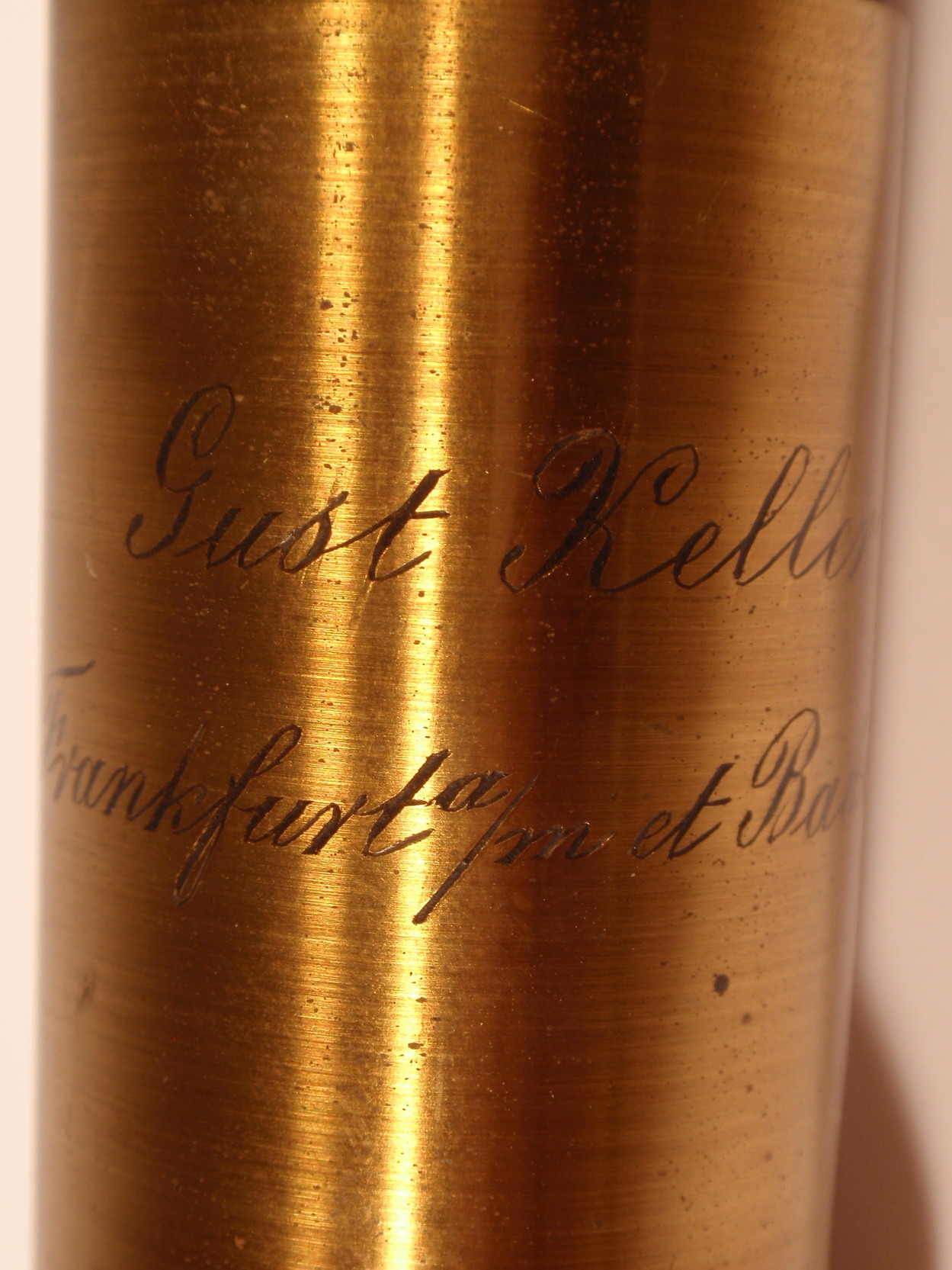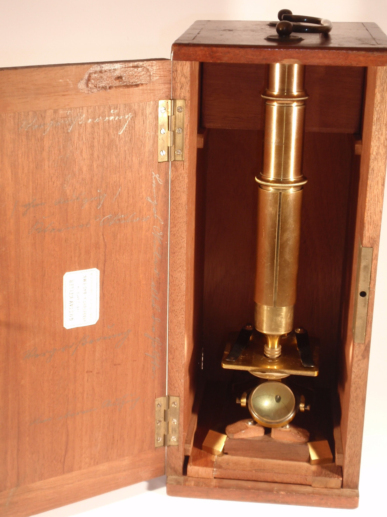 voll Messing, original zaponiert, ca. 1860. Höhe 31 cm; 1 Okular, 1 dreiteilig verschraubbares Objektiv, Grobeinstellung durch Verschieben des Tubus per Hand, Feineinstellung, Lochblendenscheibe unter dem Tisch, Kippstativ; Signatur auf dem Fuß "Gust. Keller Frankfurt a/m et Bad Ems"; mechanisch und optisch sehr gut, Erhaltung sehr gut; der Kasten enthält das Herstelleretikett "Gustav Keller Opticus Frankfurt A/M, Göthe-Platz 9, Bad-Ems Lahnstrasse 5"; ein ungewöhnliches Mikroskop eines mir bisher unbekannten Herstellers, Kasten.