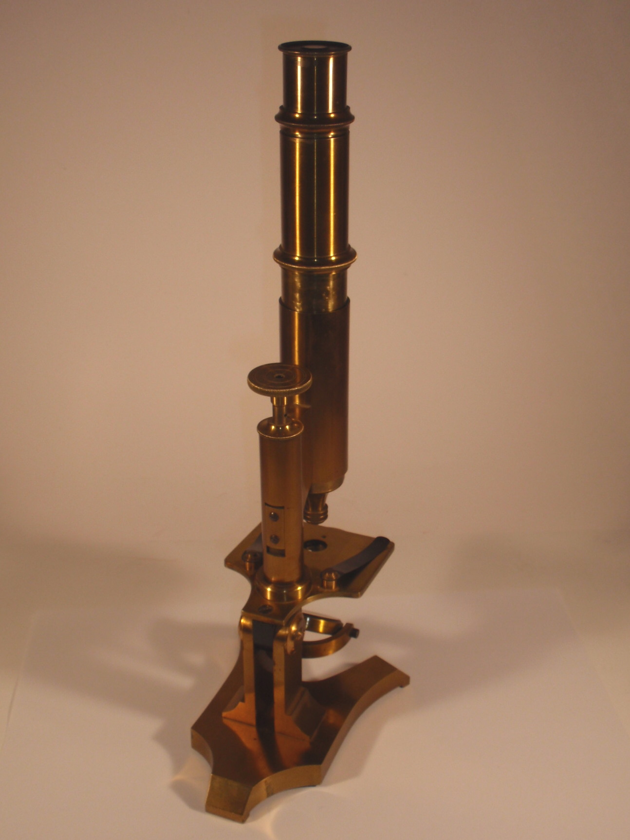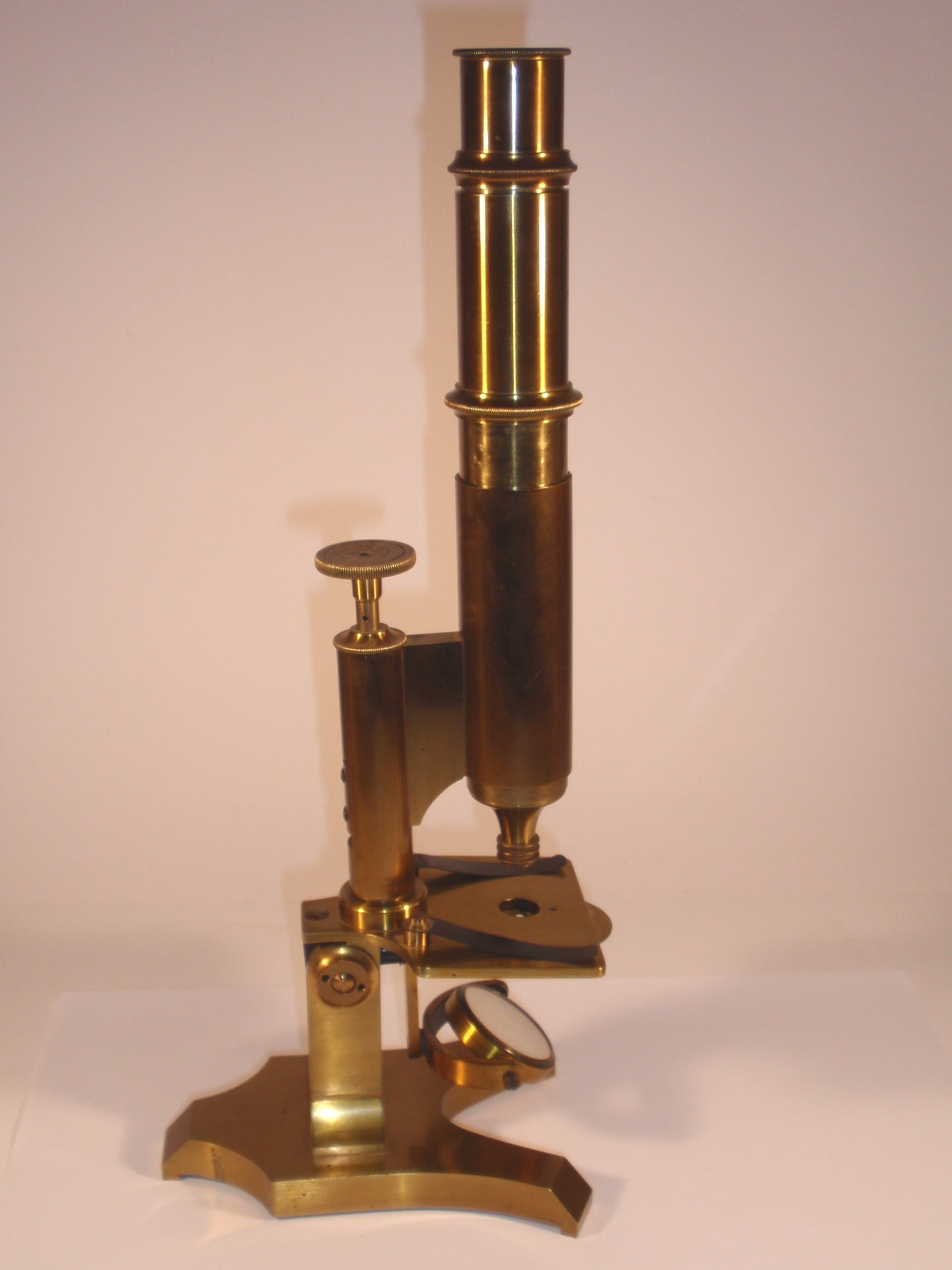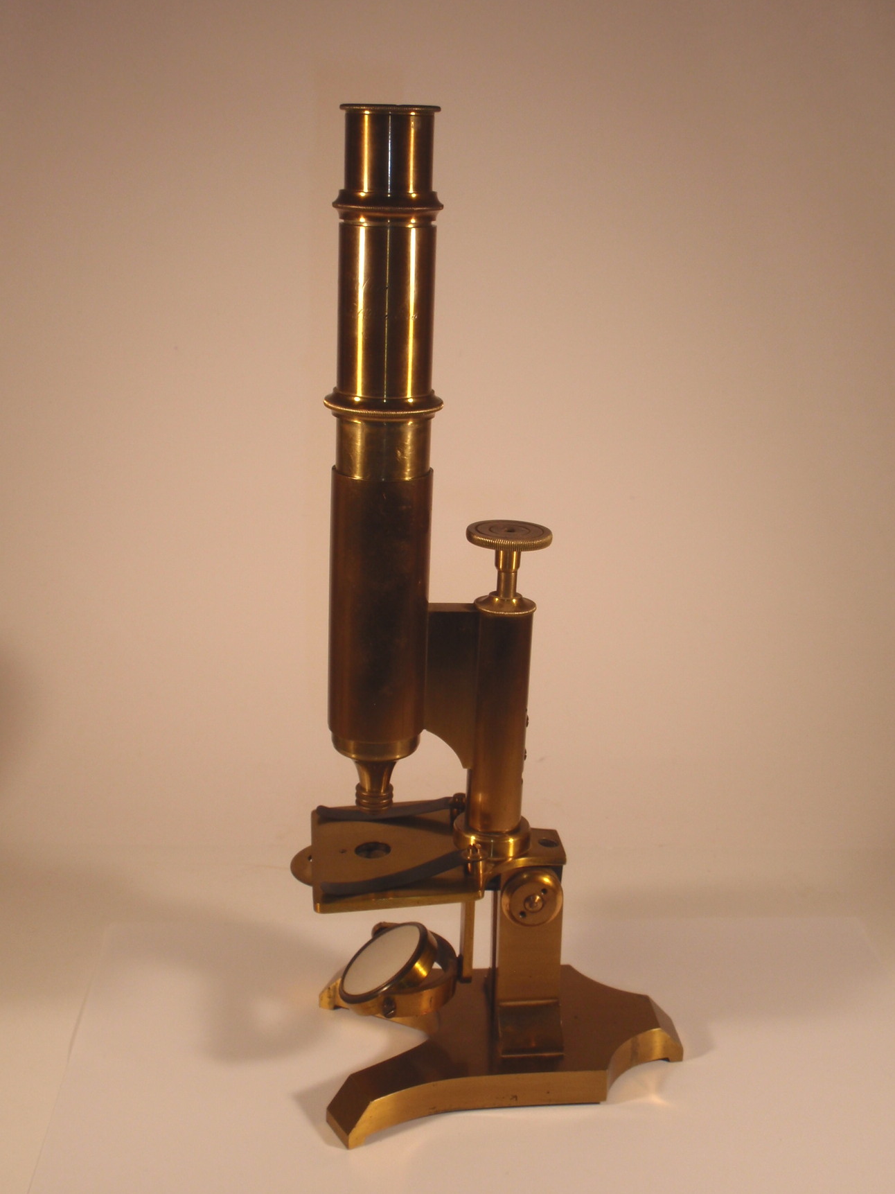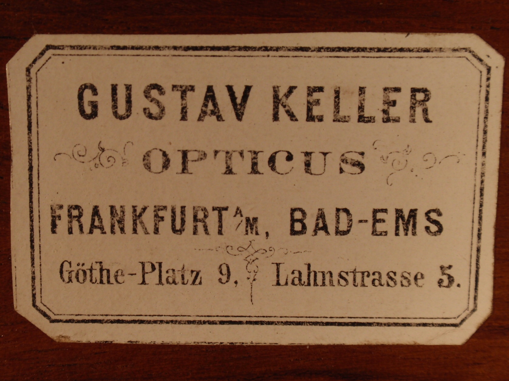 voll Messing, original zaponiert, ca. 1860. Höhe 31 cm; 1 Okular, 1 dreiteilig verschraubbares Objektiv, Grobeinstellung durch Verschieben des Tubus per Hand, Feineinstellung, Lochblendenscheibe unter dem Tisch, Kippstativ; Signatur auf dem Fuß "Gust. Keller Frankfurt a/m et Bad Ems"; mechanisch und optisch sehr gut, Erhaltung sehr gut; der Kasten enthält das Herstelleretikett "Gustav Keller Opticus Frankfurt A/M, Göthe-Platz 9, Bad-Ems Lahnstrasse 5"; ein ungewöhnliches Mikroskop eines mir bisher unbekannten Herstellers, Kasten.