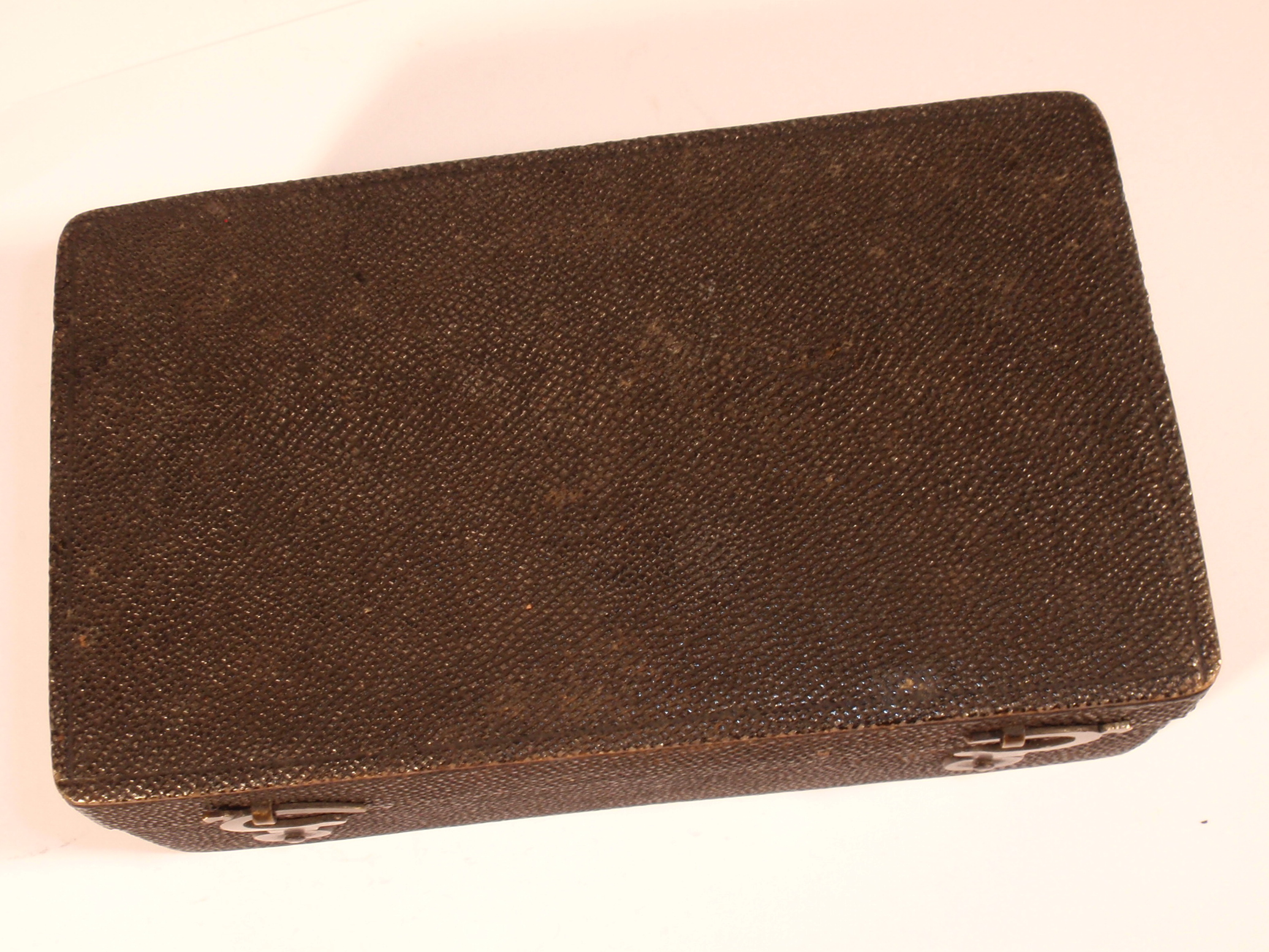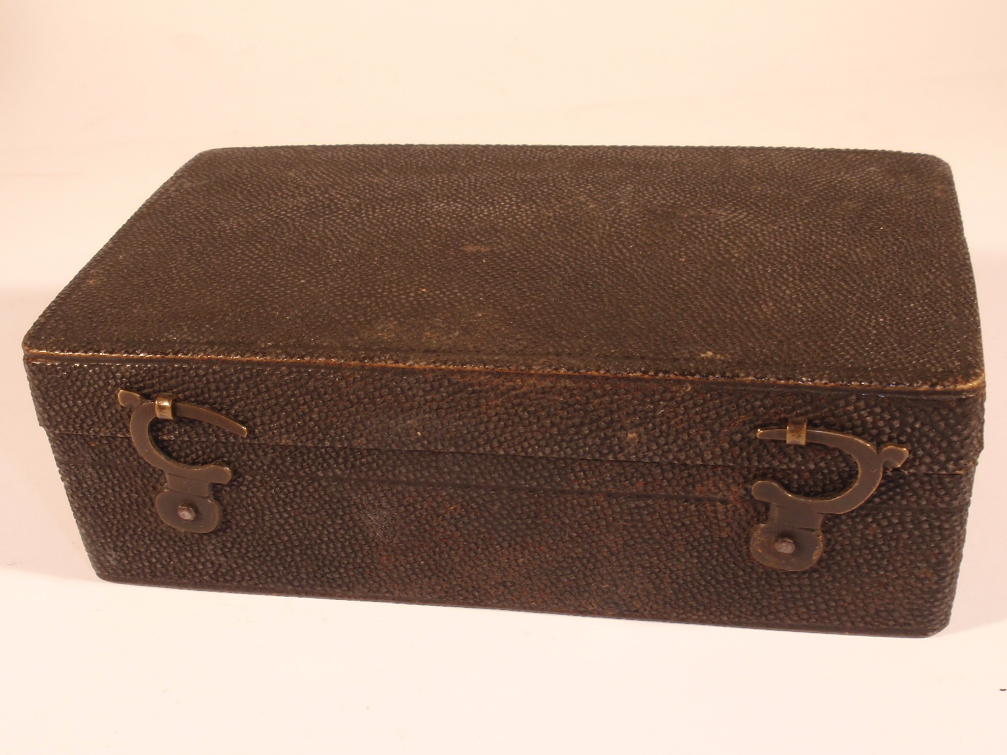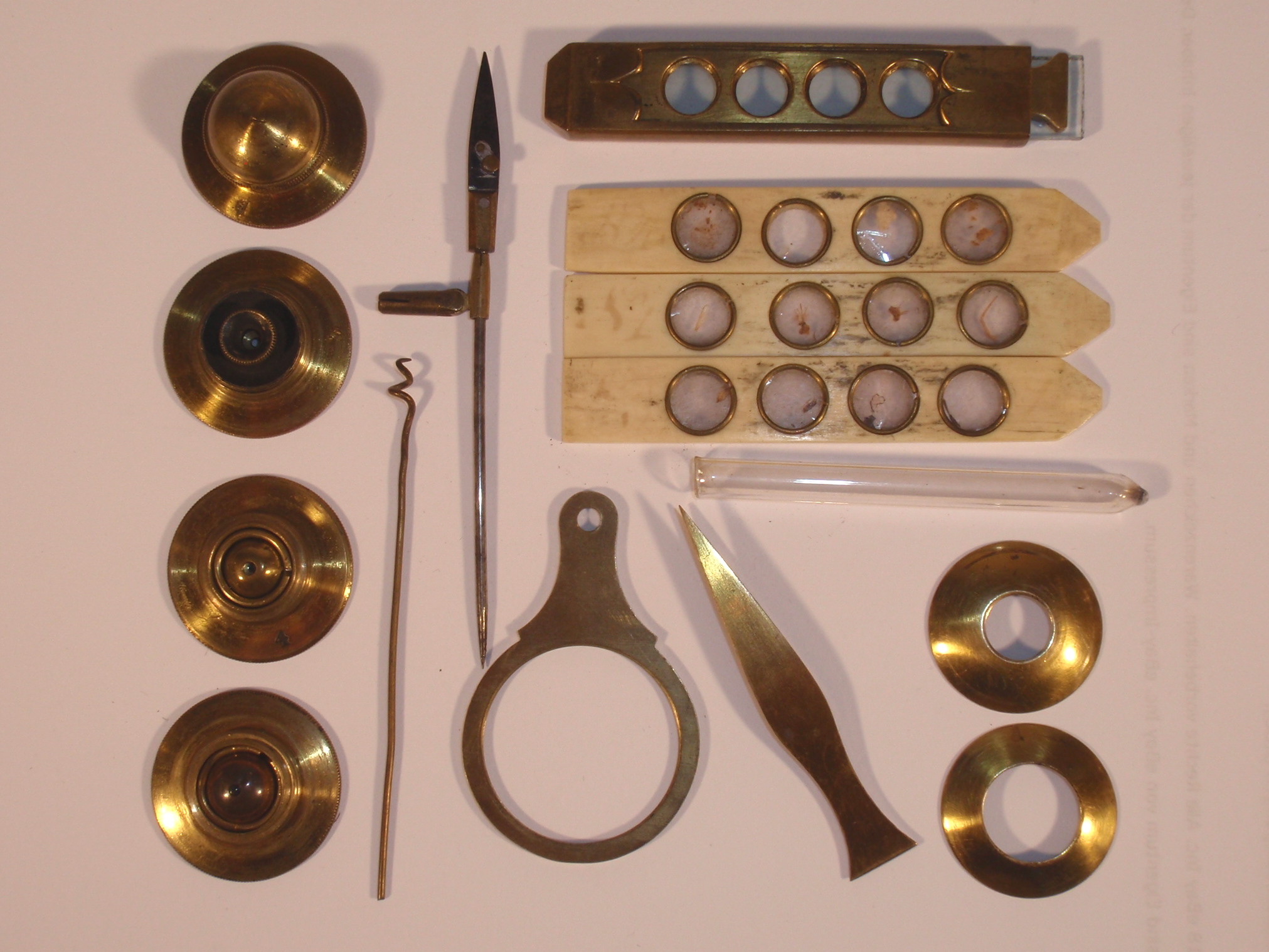 voll Messing, original zaponiert, ca. 1760 - 1780. Länge 6,0 cm; 4 Objektivlinsen in Messingfassungen zum Einschrauben (eine davon mit einer Schutzkappe aus Messing), Grob- und Feineinstellung durch Drehen in einem Gewinde, 3 Elfenbeinobjektträger, 1 Messingobjektträger ohne Präparate in einem Messingschieber, Pinzette, 2 Lieberkühnblenden; alles vollkommen original; mechanisch und optisch sehr gut, Erhaltung sehr gut (bestens erhaltene ursprüngliche Zaponierung), sehr schöner außen mit Rochenhaut bezogener und innen mit grünem Samt ausgelegter Kasten (Kastenmaße 13 x 7,5 x 4,5 cm).