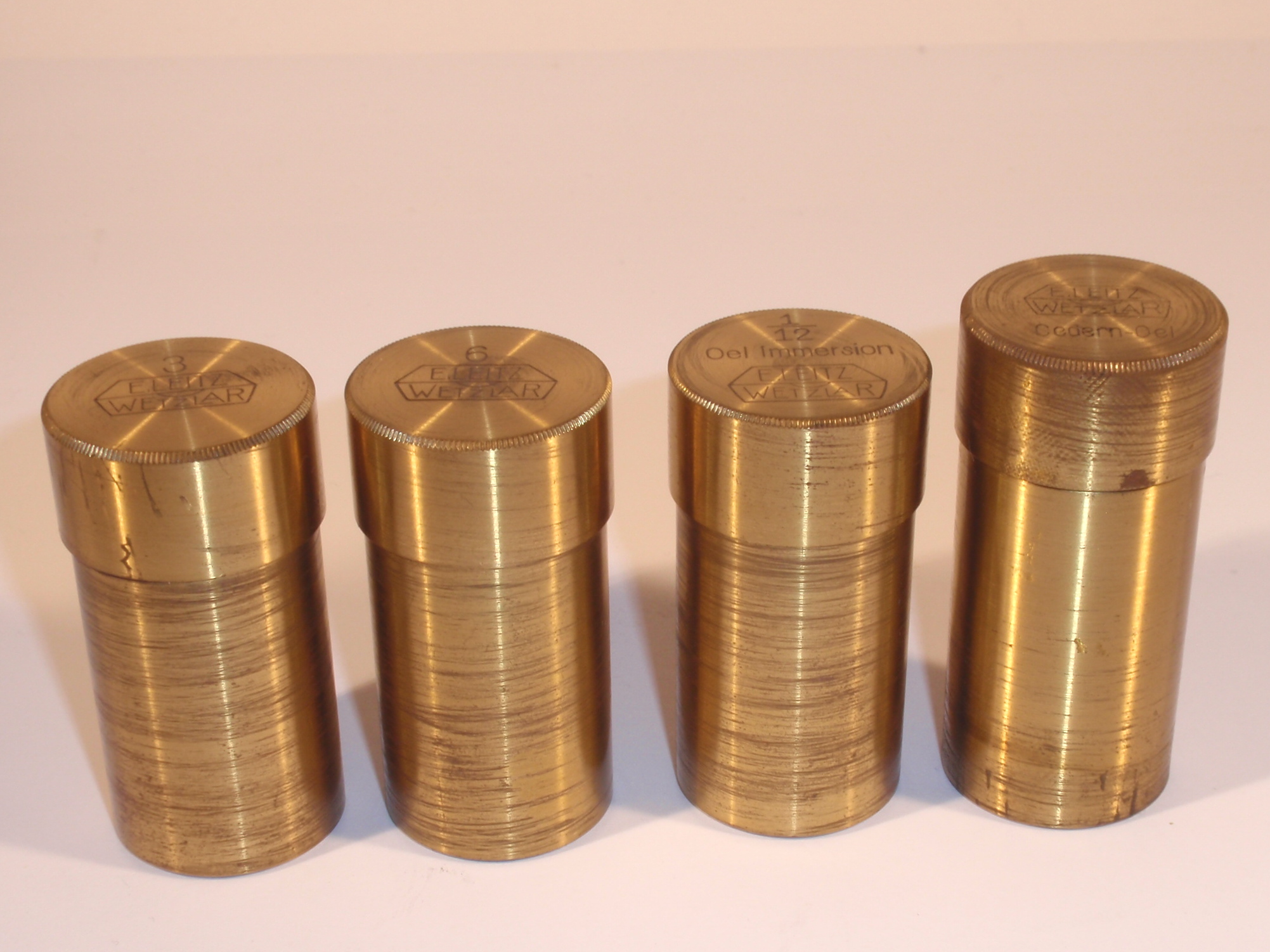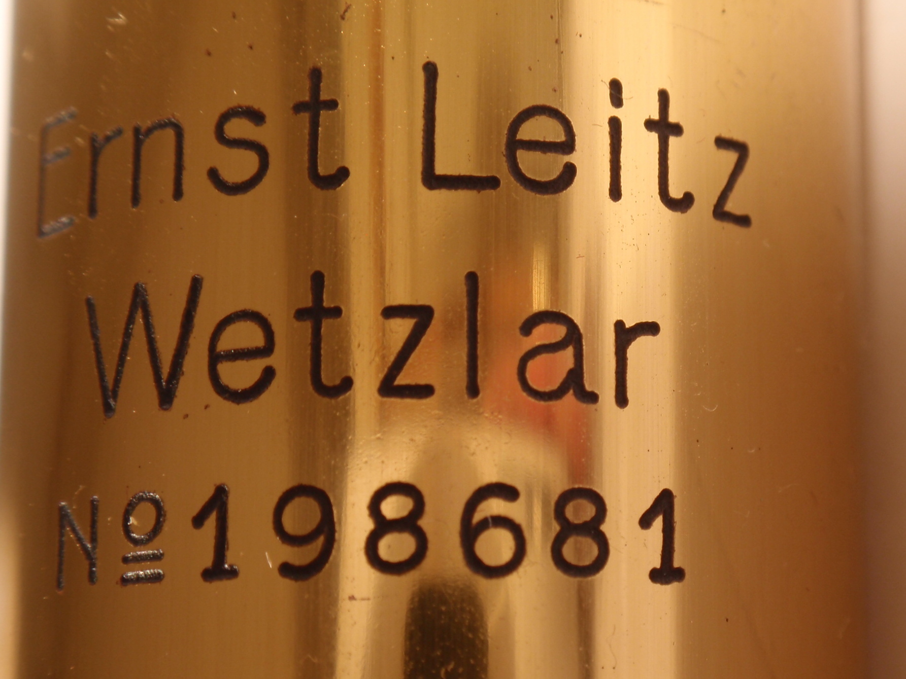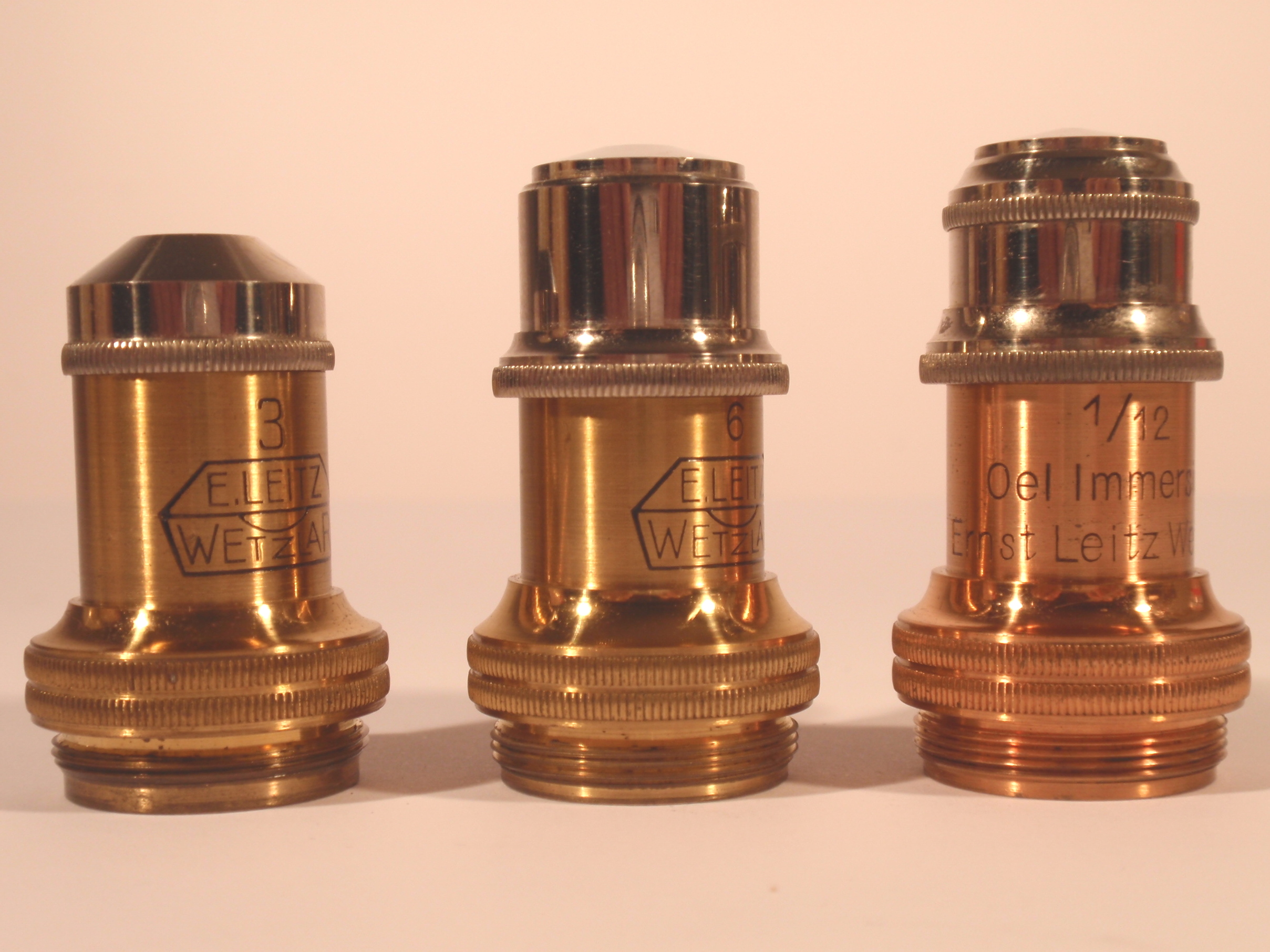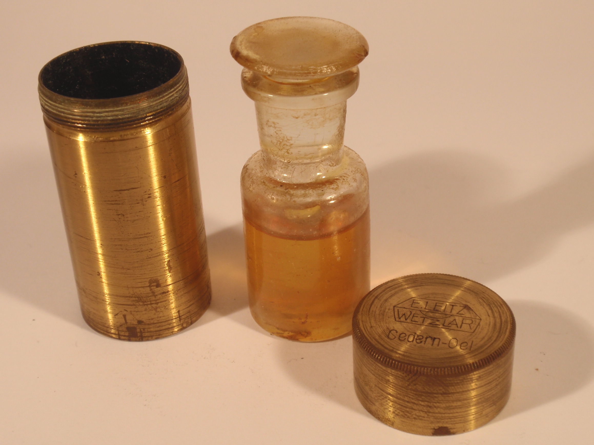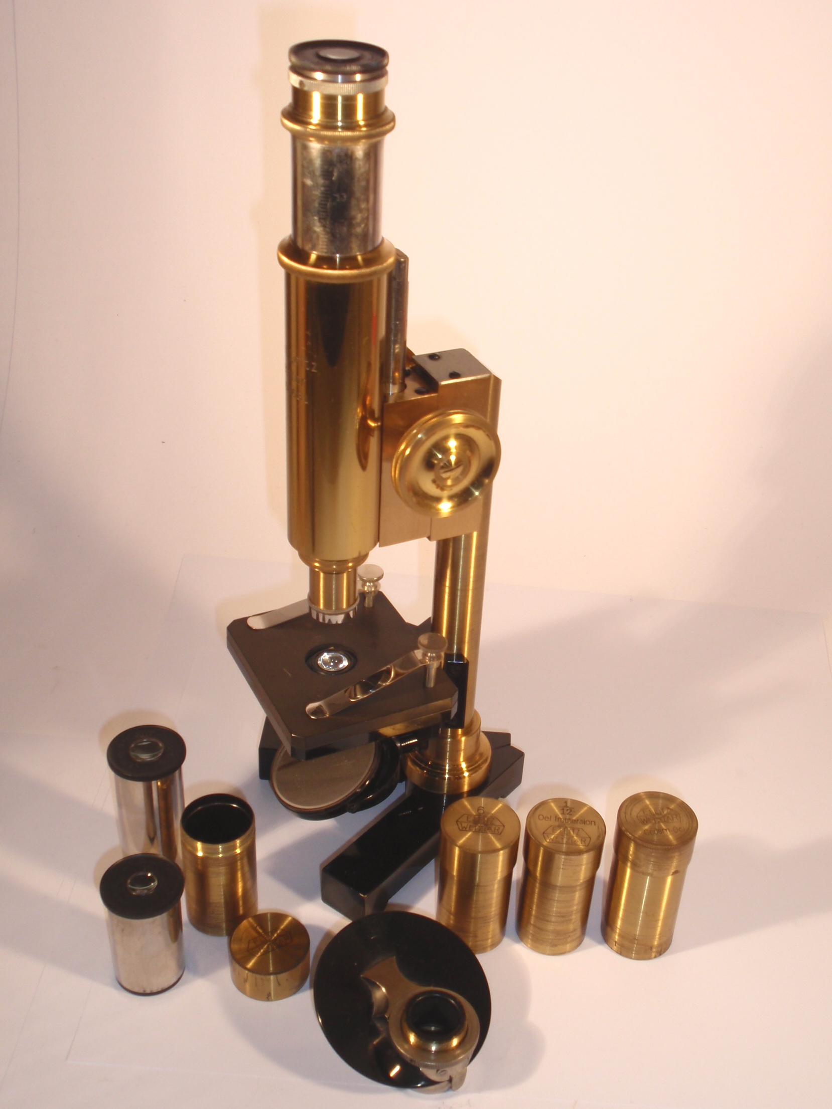 voll Messing mit geschwärztem Fuß, original zaponiert, ca. 1920/21, Höhe 29 cm, 3 signierte Okulare (Nr. 1, 3 und 6), 3 signierte Objektive (Nr. 3, 6, 1/12 Ölimmersion) in ebenfalls signierten Messingdosen, eine vierte signierte Messingdose mit der Aufschrift "Cedern-Oel" mit einer halb gefüllten kleinen Flasche; 2fach-Revolver, Grobeinstellung; Feineinstellung; Kondensor; Signatur auf dem Tubus „Ernst Leitz Wetzlar No. 189.681"; das Mikroskop passt nach dem Zusammenlegen der Füße, dem Drehen des Tisches und dem Entfernen des Spiegels in den Lederkoffer; Gerät und Zubehör befinden sich in diesem mit rotem Samt ausgeschlagenen Lederkoffer mit Metallknöpfen; die Baunummer des Mikroskops ist in das Leder eingestanzt; mechanisch und optisch sehr gut, Erhaltung sehr gut (offenbar kaum benutzt!), sehr schöner Lederkasten mit Schlüssel; in diesem Superzustand und mit dieser Ausstattung ein Glücksfall!