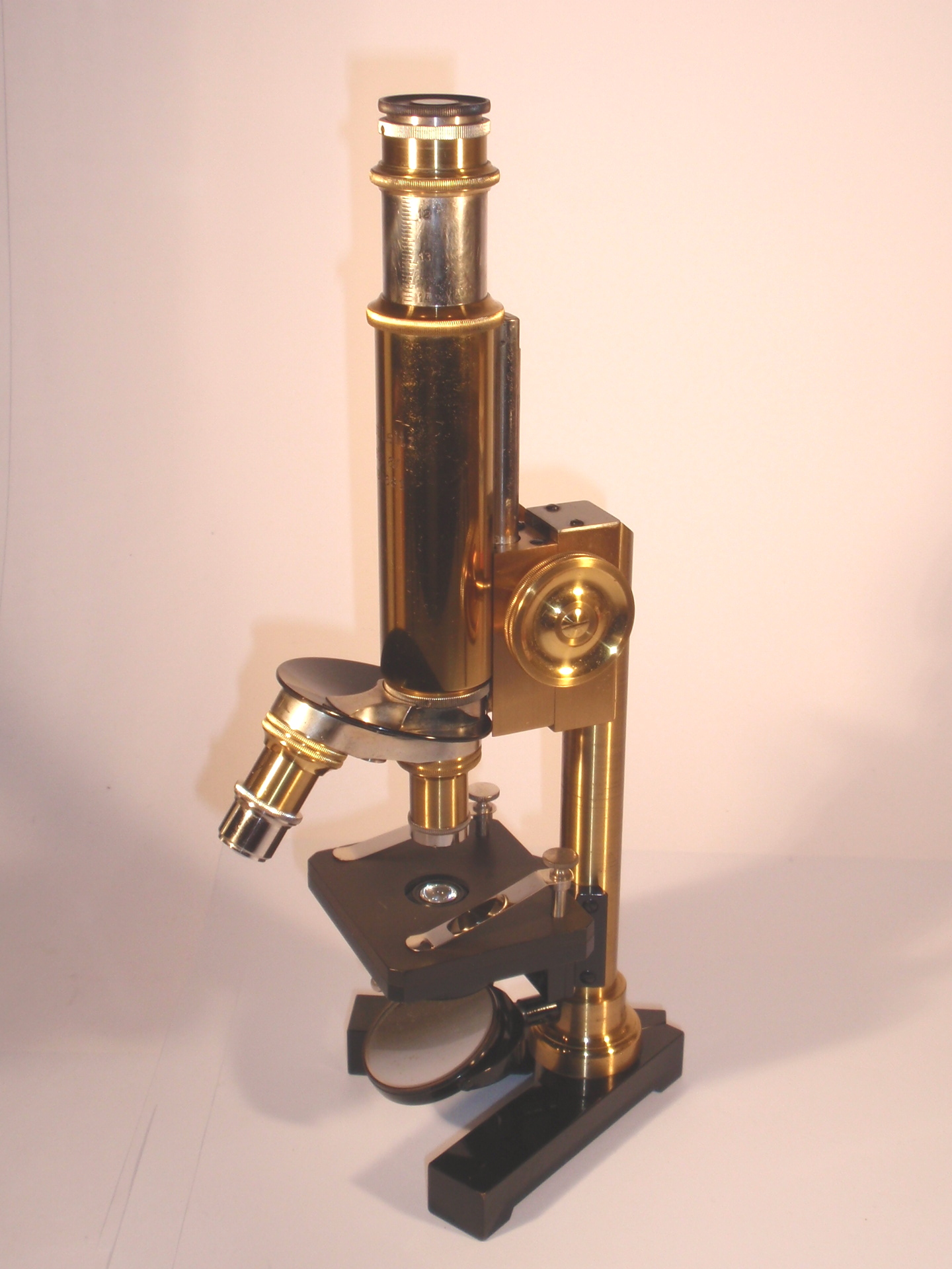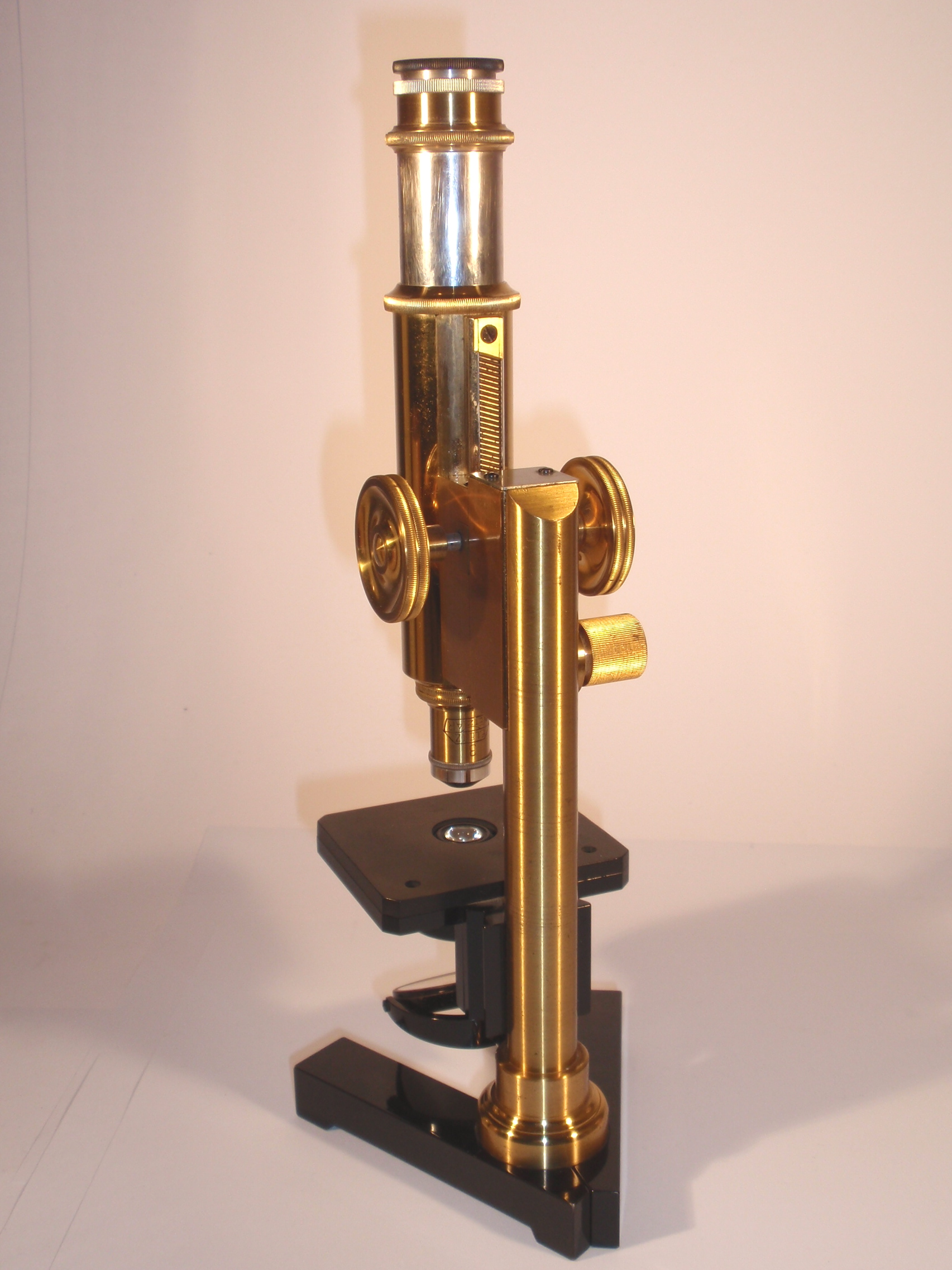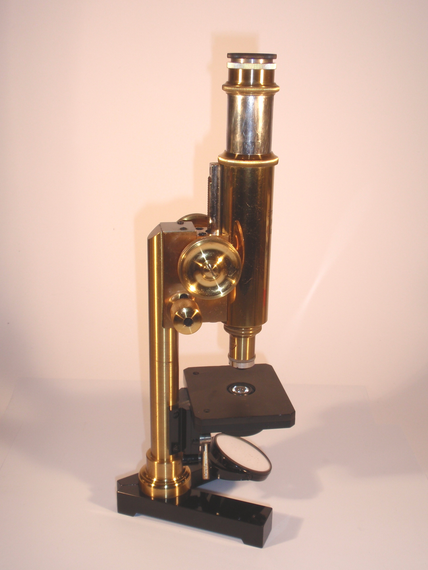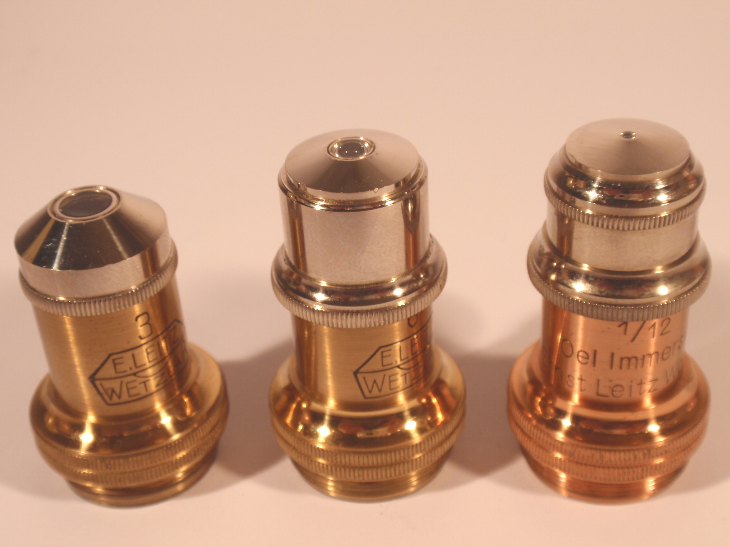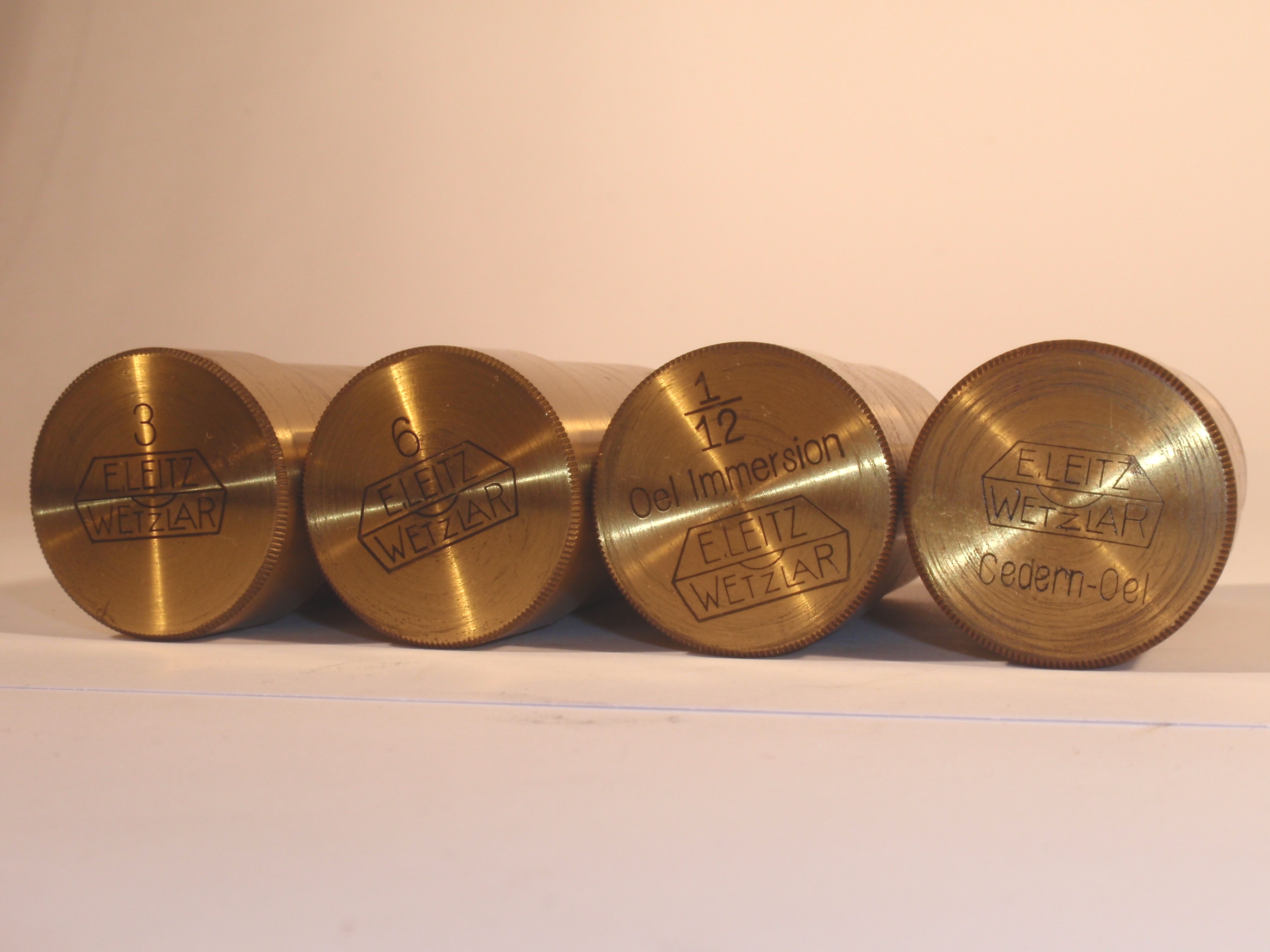 voll Messing mit geschwärztem Fuß, original zaponiert, ca. 1920/21, Höhe 29 cm, 3 signierte Okulare (Nr. 1, 3 und 6), 3 signierte Objektive (Nr. 3, 6, 1/12 Ölimmersion) in ebenfalls signierten Messingdosen, eine vierte signierte Messingdose mit der Aufschrift "Cedern-Oel" mit einer halb gefüllten kleinen Flasche; 2fach-Revolver, Grobeinstellung; Feineinstellung; Kondensor; Signatur auf dem Tubus „Ernst Leitz Wetzlar No. 189.681"; das Mikroskop passt nach dem Zusammenlegen der Füße, dem Drehen des Tisches und dem Entfernen des Spiegels in den Lederkoffer; Gerät und Zubehör befinden sich in diesem mit rotem Samt ausgeschlagenen Lederkoffer mit Metallknöpfen; die Baunummer des Mikroskops ist in das Leder eingestanzt; mechanisch und optisch sehr gut, Erhaltung sehr gut (offenbar kaum benutzt!), sehr schöner Lederkasten mit Schlüssel; in diesem Superzustand und mit dieser Ausstattung ein Glücksfall!