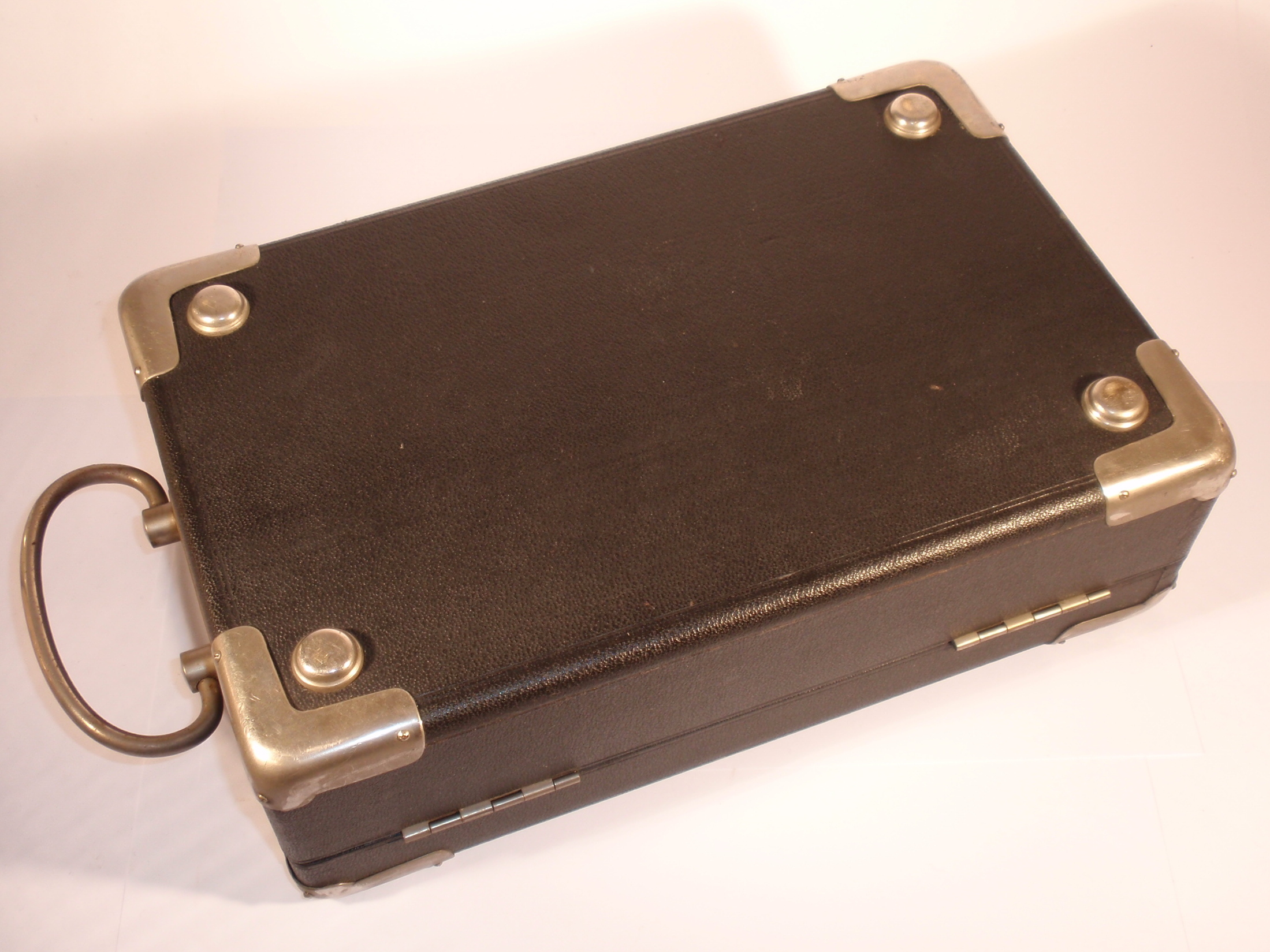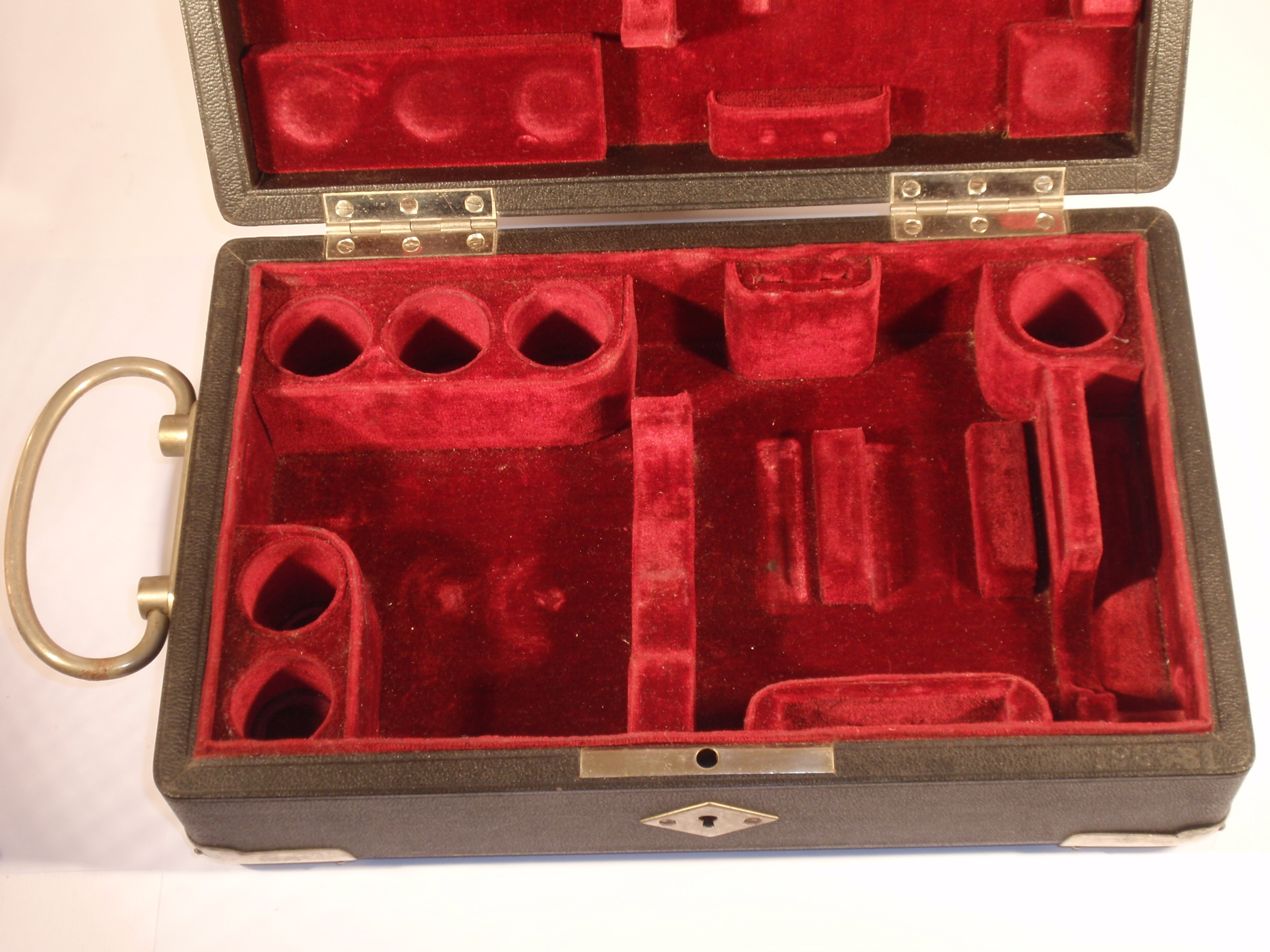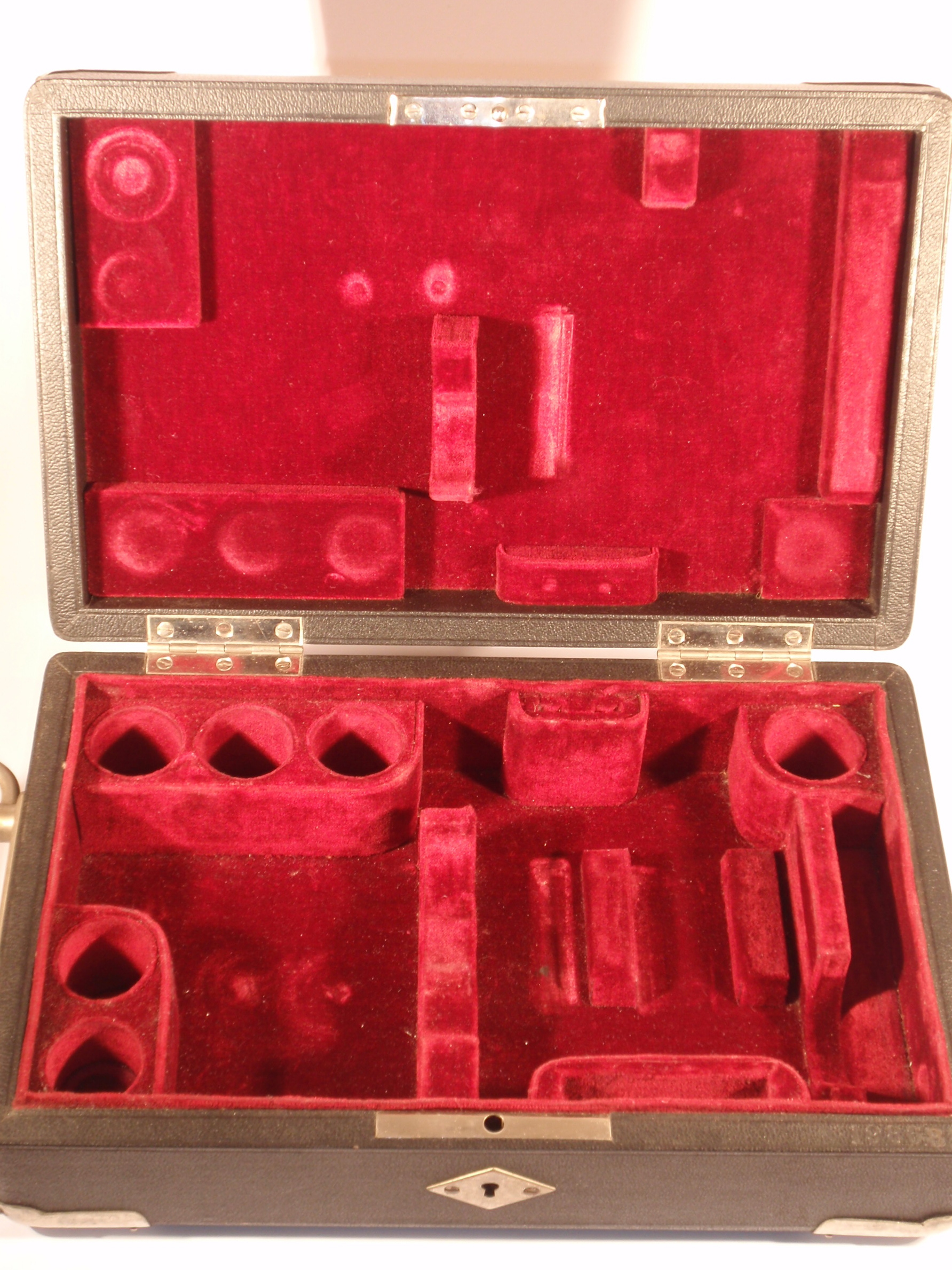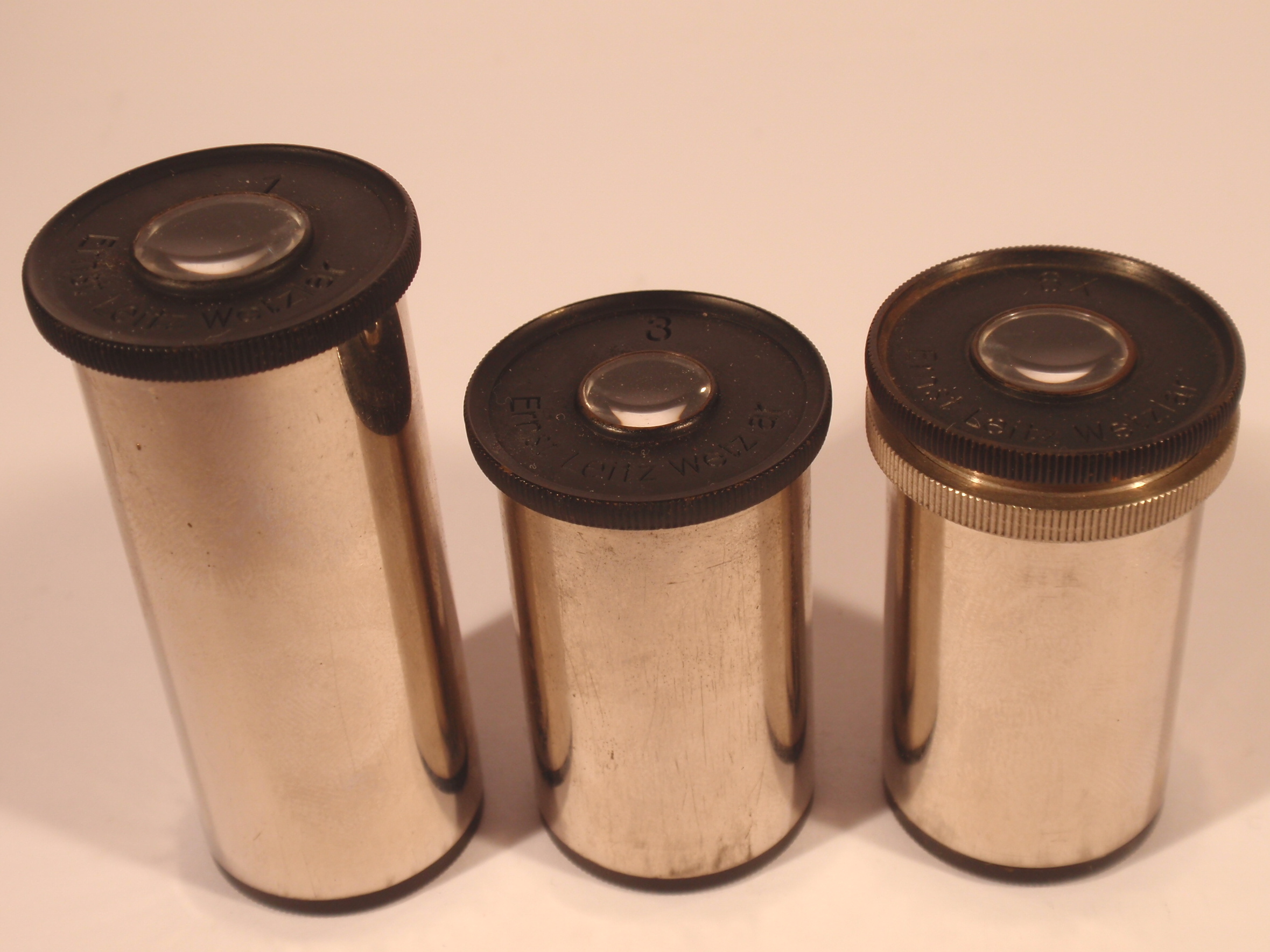 A Fine Travel Microscope from Leitz Wetzlar, original lacquered, ca. 1920/21, hight 29 cm, 3 signed okulars (No. 1, 3, and 6) , 3 signed objectives in signed brass cannisters (No. 3, 6, and 1/12 oil-immersion) , another signed brass cannister with a bottle of cedar oil; double nosepiece, course focusing, fine focusing, sub stage condenser, signature on the tube „Ernst Leitz Wetzlar No. 189.681"; very impressive red velvet lined leather covered case with the number of the microscope and the key; all parts and accessories are complete and original! Mechanical and optical very good, cosmetically splendid condition (obviously scarcely used). The condition of this microscope is a stroke of luck!