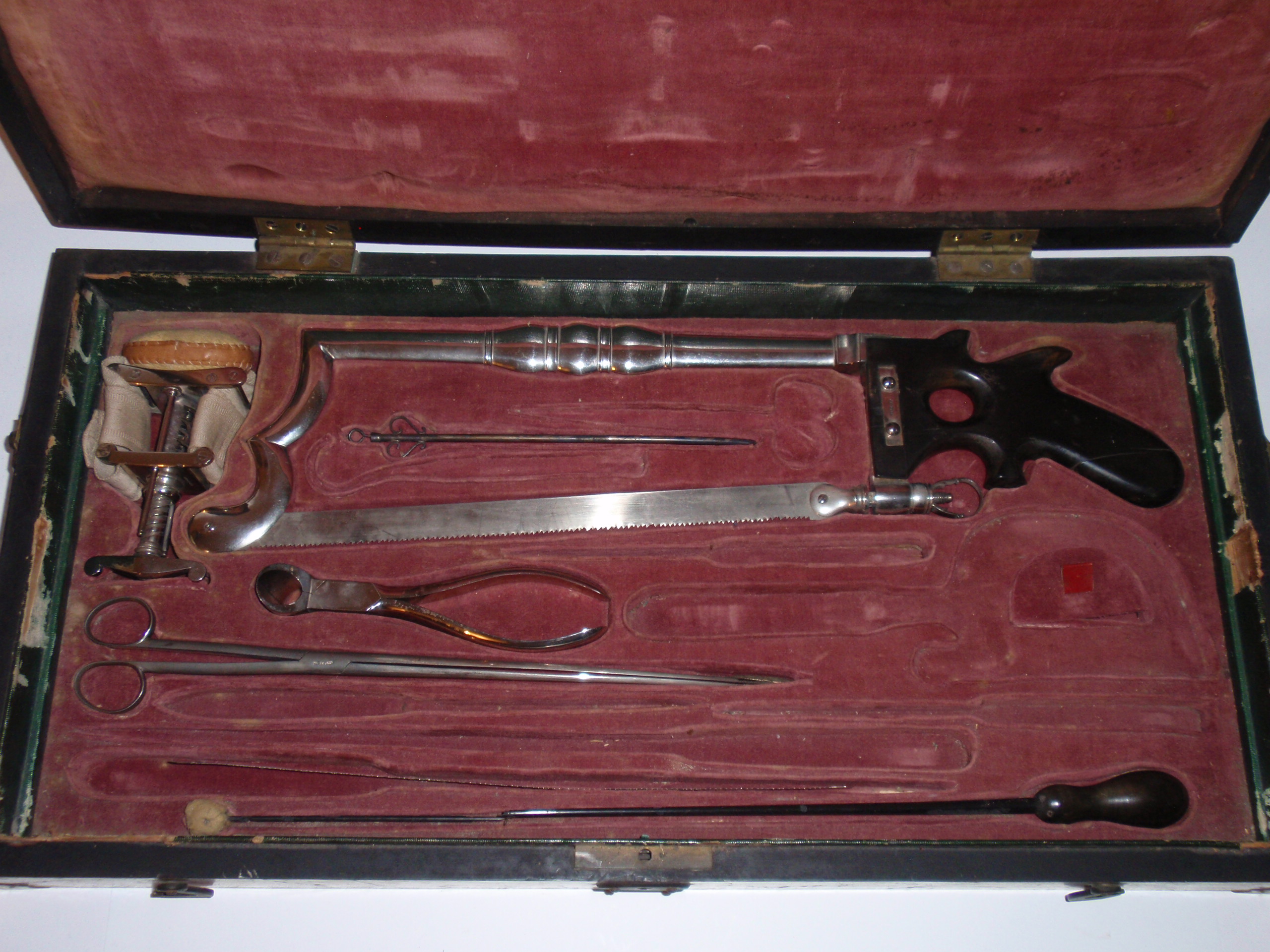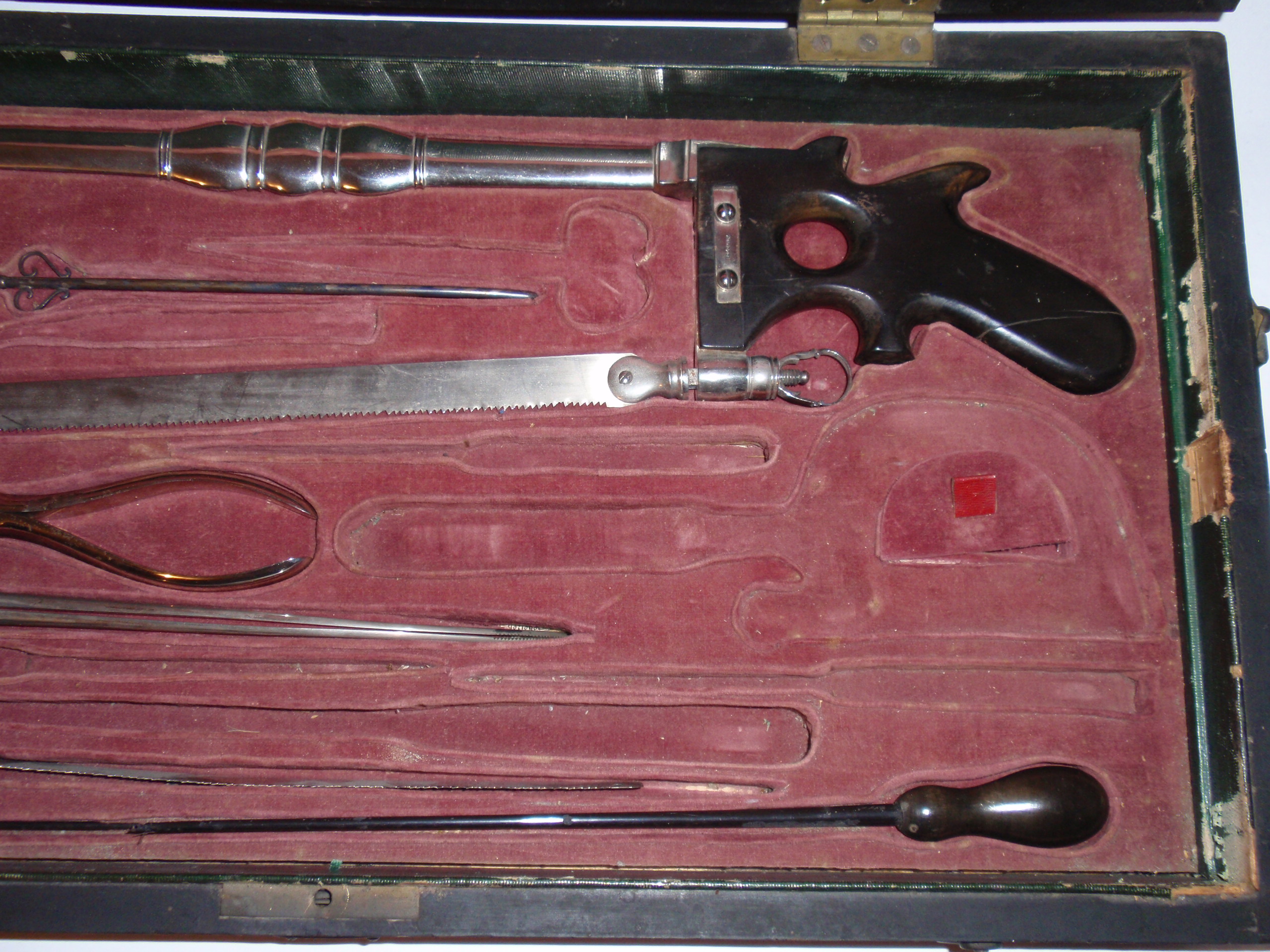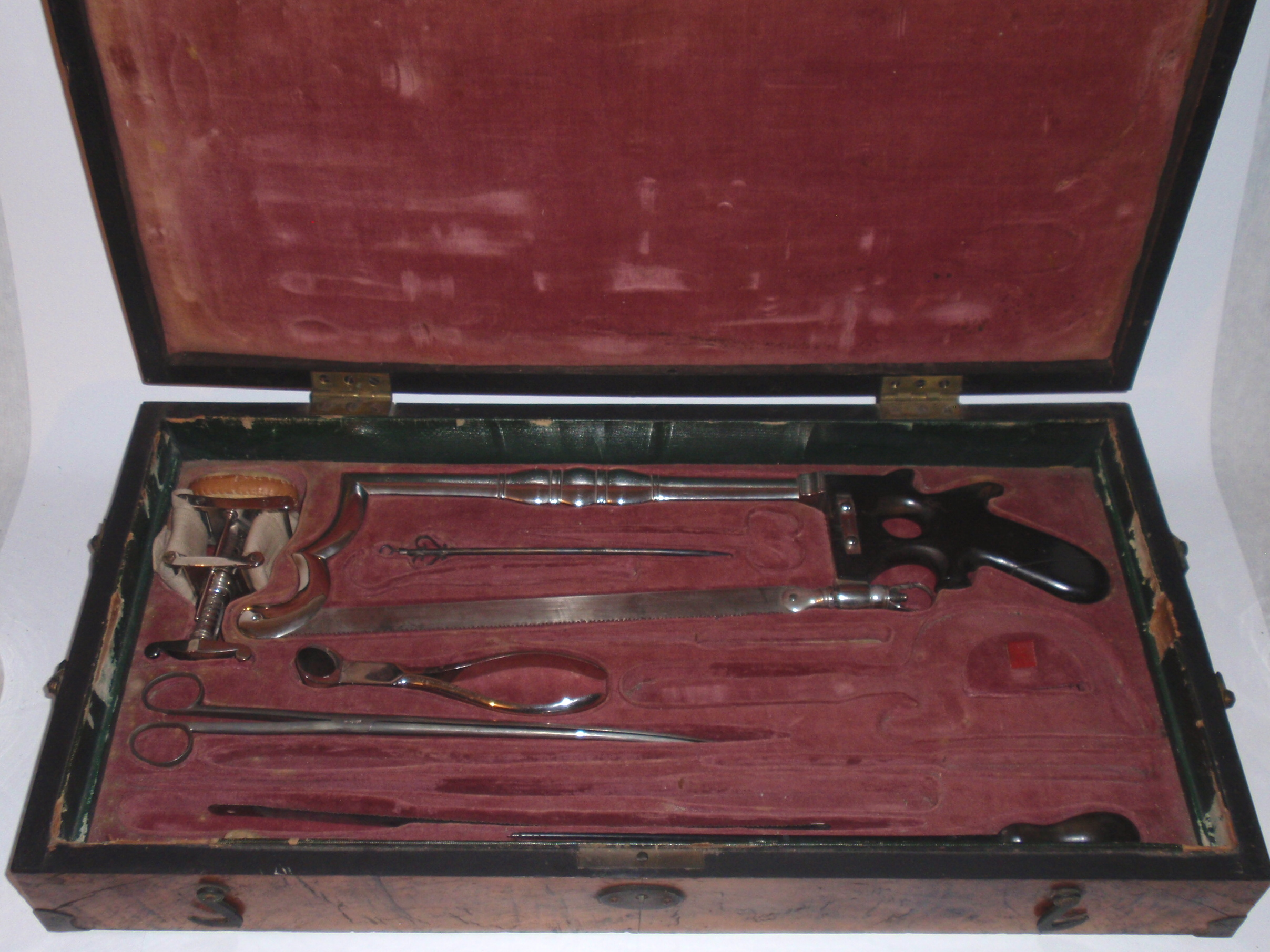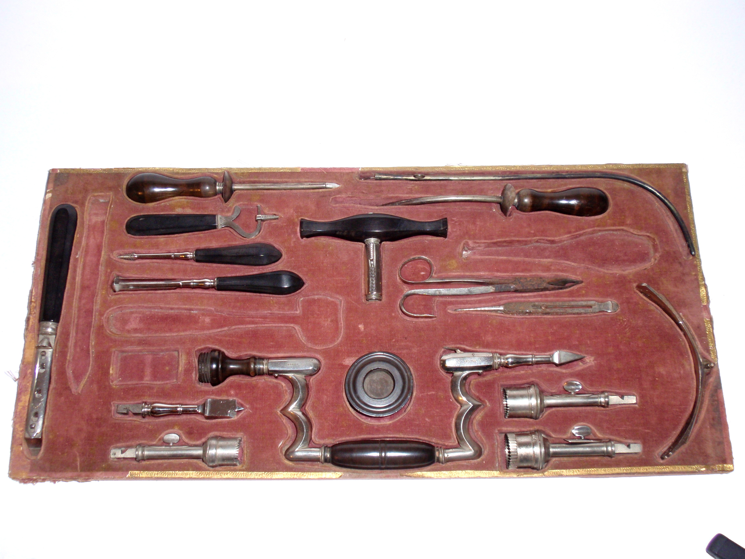 ca. 1810 bis 1840, Kastenmaße 53 x 27 x 8,5 cm; einige Instrumente fehlen; die im Kasten vorhandenen Instrumente sind alle sind original (keine Fremdinstrumente)! Auf dem großen Trepanbohrer, auf der Zange, dem Torniquet, der Säge und 3 anderen Instrumenten findet sich die Herstellersignatur "Hölzlin Friburg"; die großen Instrumente einschließlich Handbohrer haben einen Griff aus Ebenholz; der Drillbohrer hat Horngriffe; ansonsten sind die Instrumente aus poliertem Stahl; Drillbohrer mit 5 Bohreinsätzen; wenige kleine Instrumente sind leicht korrodiert, alles andere befindet sich in einem sehr guten Zustand! Der etwas verzogene Kasten ist mit rosa Samt ausgelegt. An einer Ecke (siehe Bild) sollte das Holz geleimt werden.