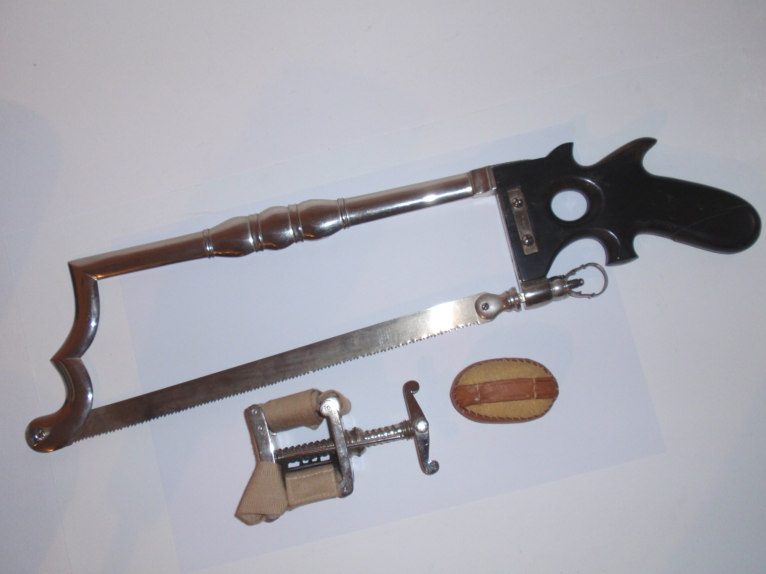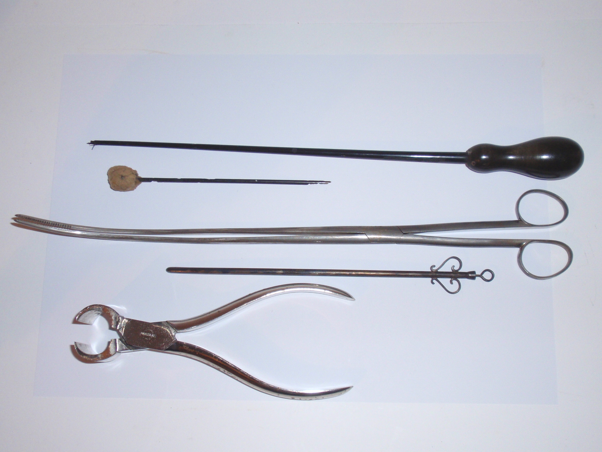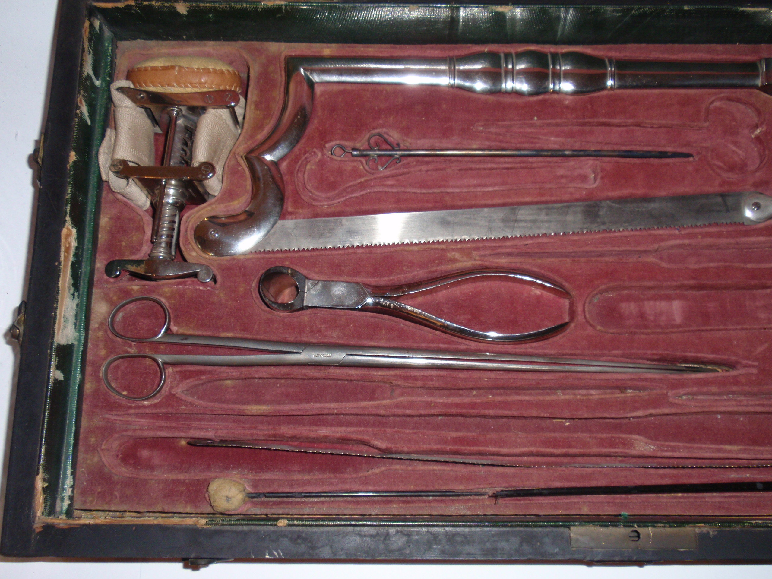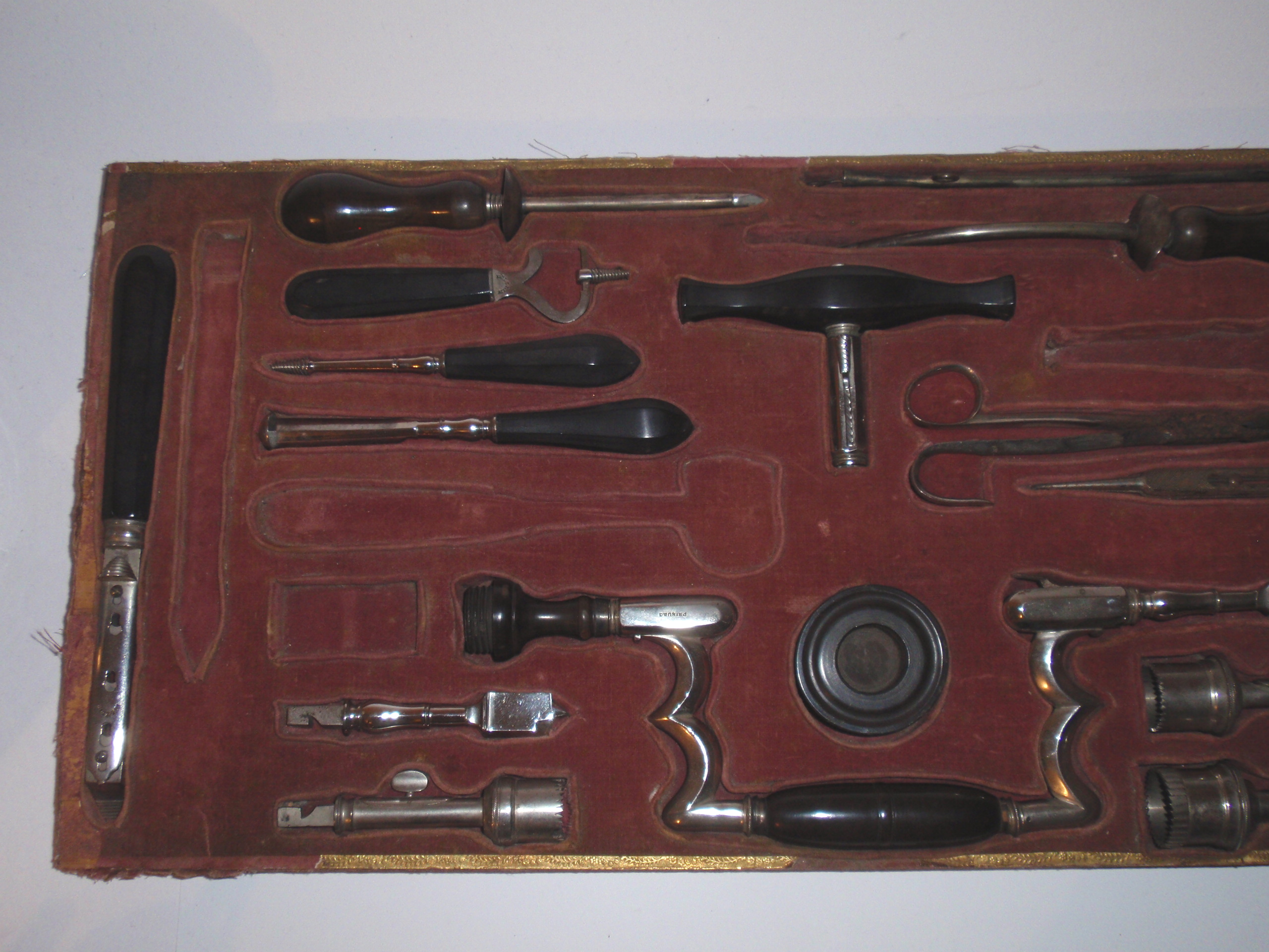 ca. 1810 bis 1840, Kastenmaße 53 x 27 x 8,5 cm; einige Instrumente fehlen; die im Kasten vorhandenen Instrumente sind alle sind original (keine Fremdinstrumente)! Auf dem großen Trepanbohrer, auf der Zange, dem Torniquet, der Säge und 3 anderen Instrumenten findet sich die Herstellersignatur "Hölzlin Friburg"; die großen Instrumente einschließlich Handbohrer haben einen Griff aus Ebenholz; der Drillbohrer hat Horngriffe; ansonsten sind die Instrumente aus poliertem Stahl; Drillbohrer mit 5 Bohreinsätzen; wenige kleine Instrumente sind leicht korrodiert, alles andere befindet sich in einem sehr guten Zustand! Der etwas verzogene Kasten ist mit rosa Samt ausgelegt. An einer Ecke (siehe Bild) sollte das Holz geleimt werden.