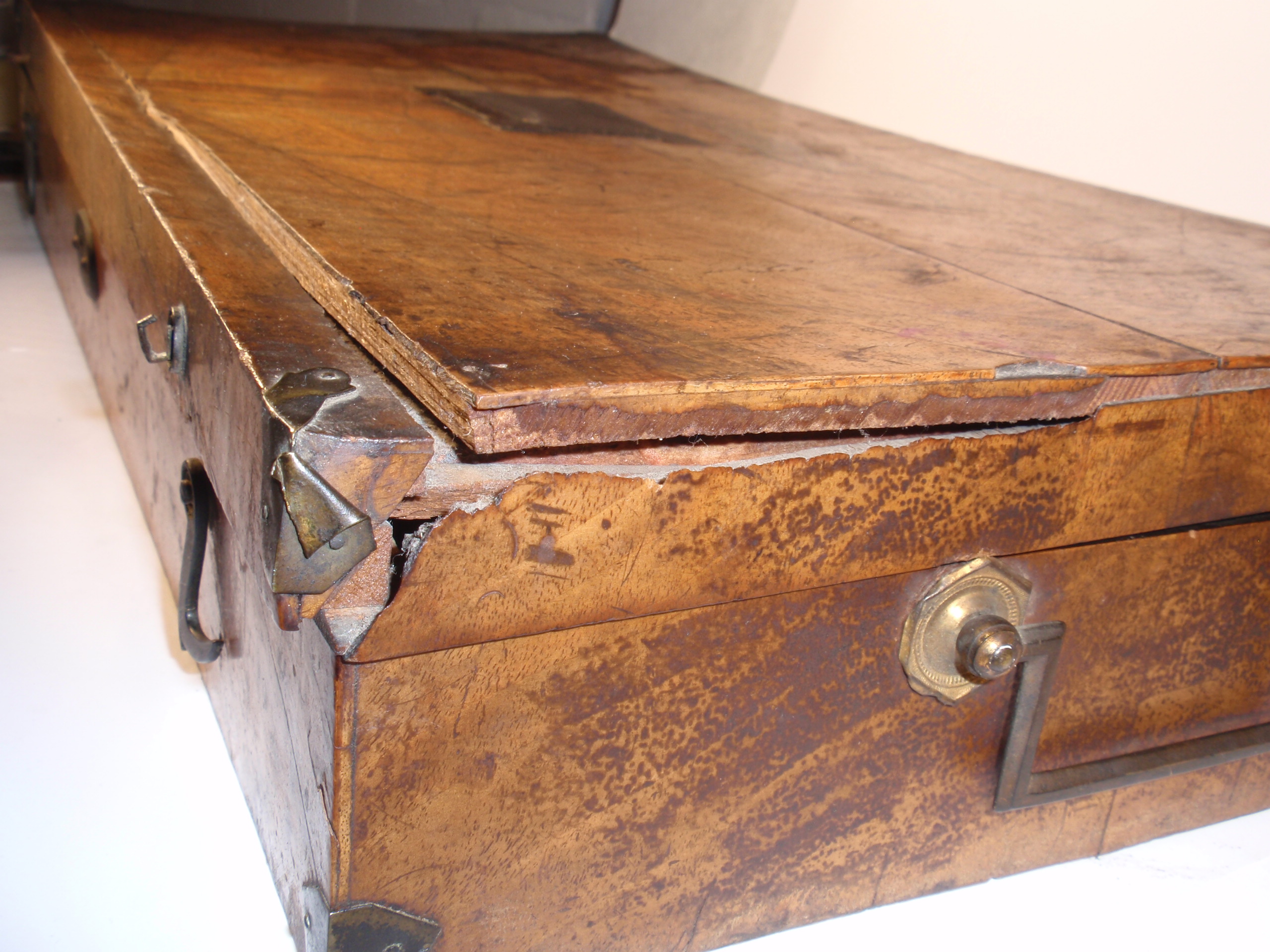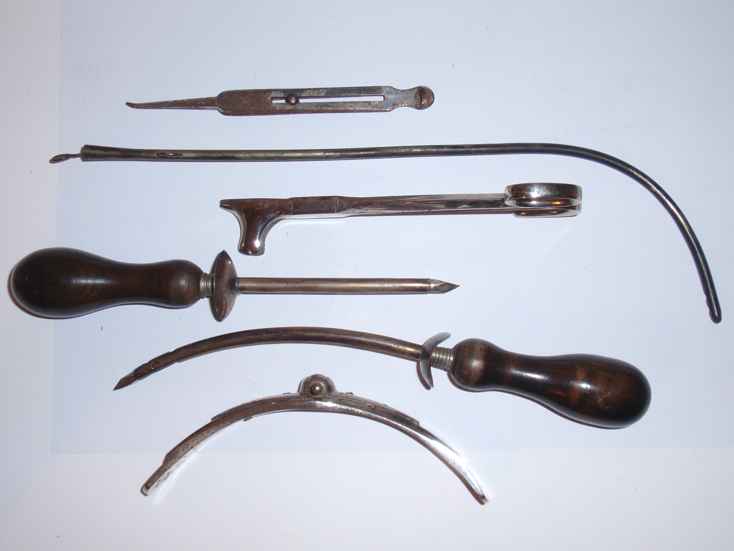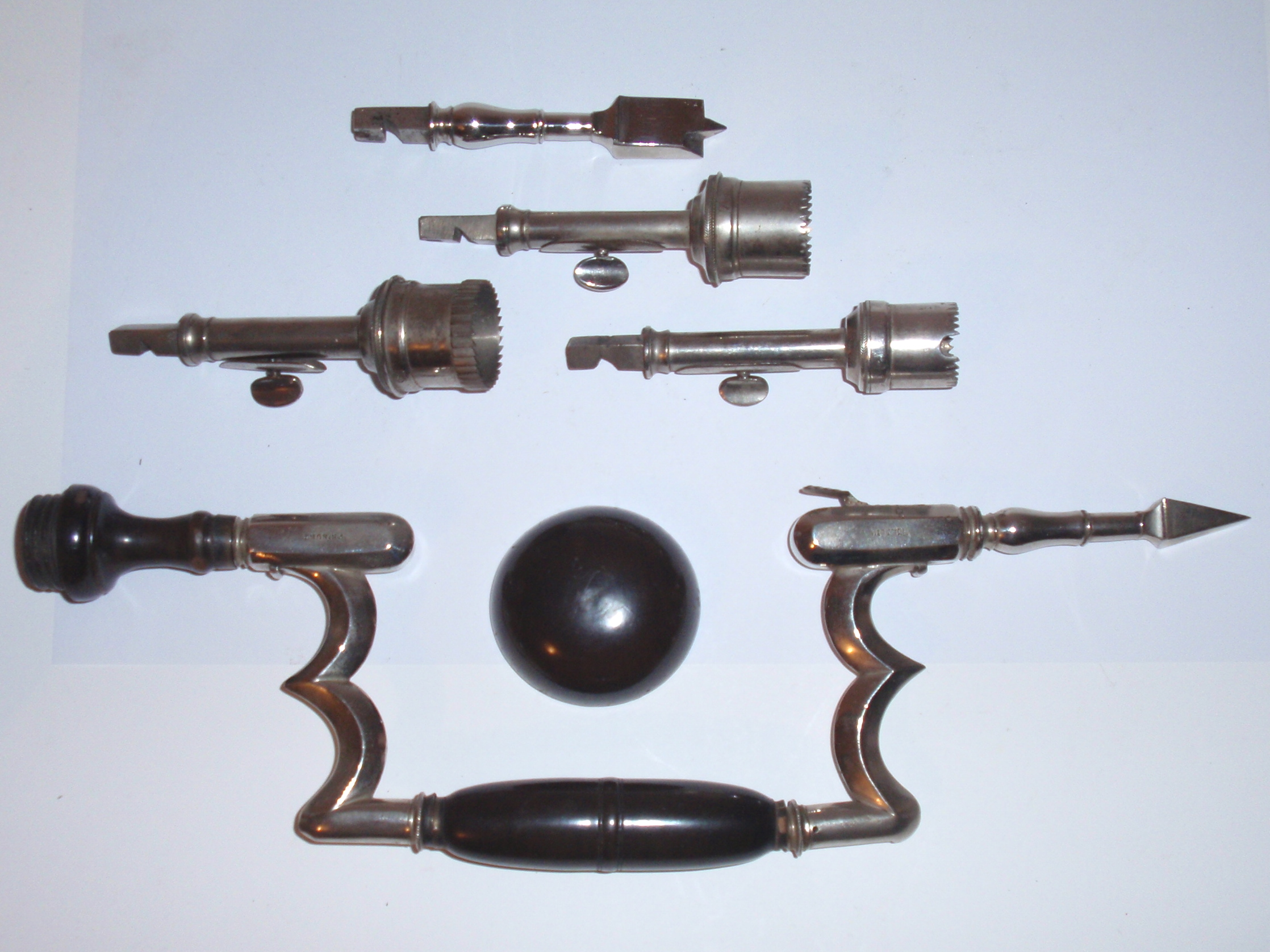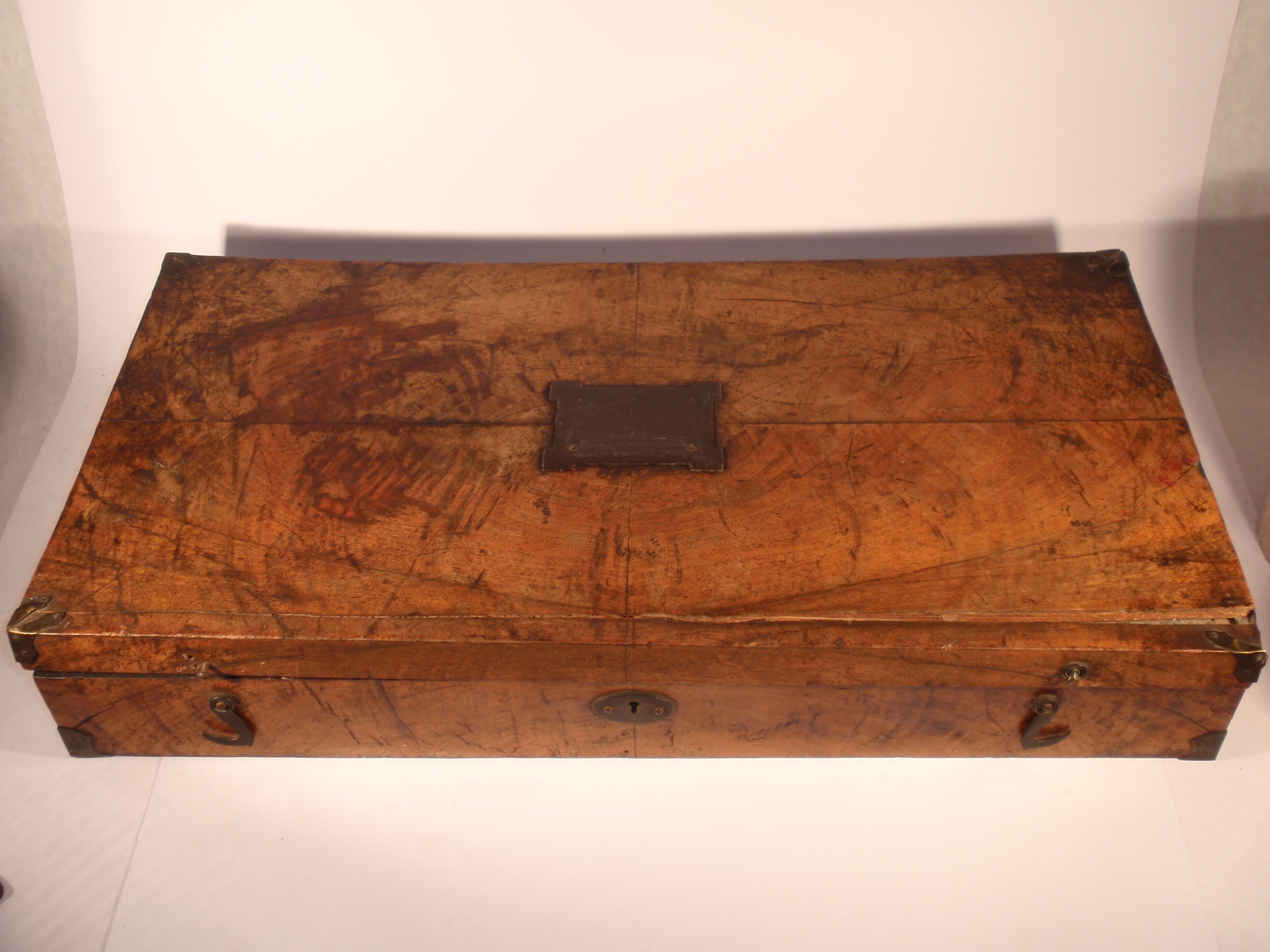 ca. 1810 bis 1840, Kastenmaße 53 x 27 x 8,5 cm; einige Instrumente fehlen; die im Kasten vorhandenen Instrumente sind alle sind original (keine Fremdinstrumente)! Auf dem großen Trepanbohrer, auf der Zange, dem Torniquet, der Säge und 3 anderen Instrumenten findet sich die Herstellersignatur "Hölzlin Friburg"; die großen Instrumente einschließlich Handbohrer haben einen Griff aus Ebenholz; der Drillbohrer hat Horngriffe; ansonsten sind die Instrumente aus poliertem Stahl; Drillbohrer mit 5 Bohreinsätzen; wenige kleine Instrumente sind leicht korrodiert, alles andere befindet sich in einem sehr guten Zustand! Der etwas verzogene Kasten ist mit rosa Samt ausgelegt. An einer Ecke (siehe Bild) sollte das Holz geleimt werden.