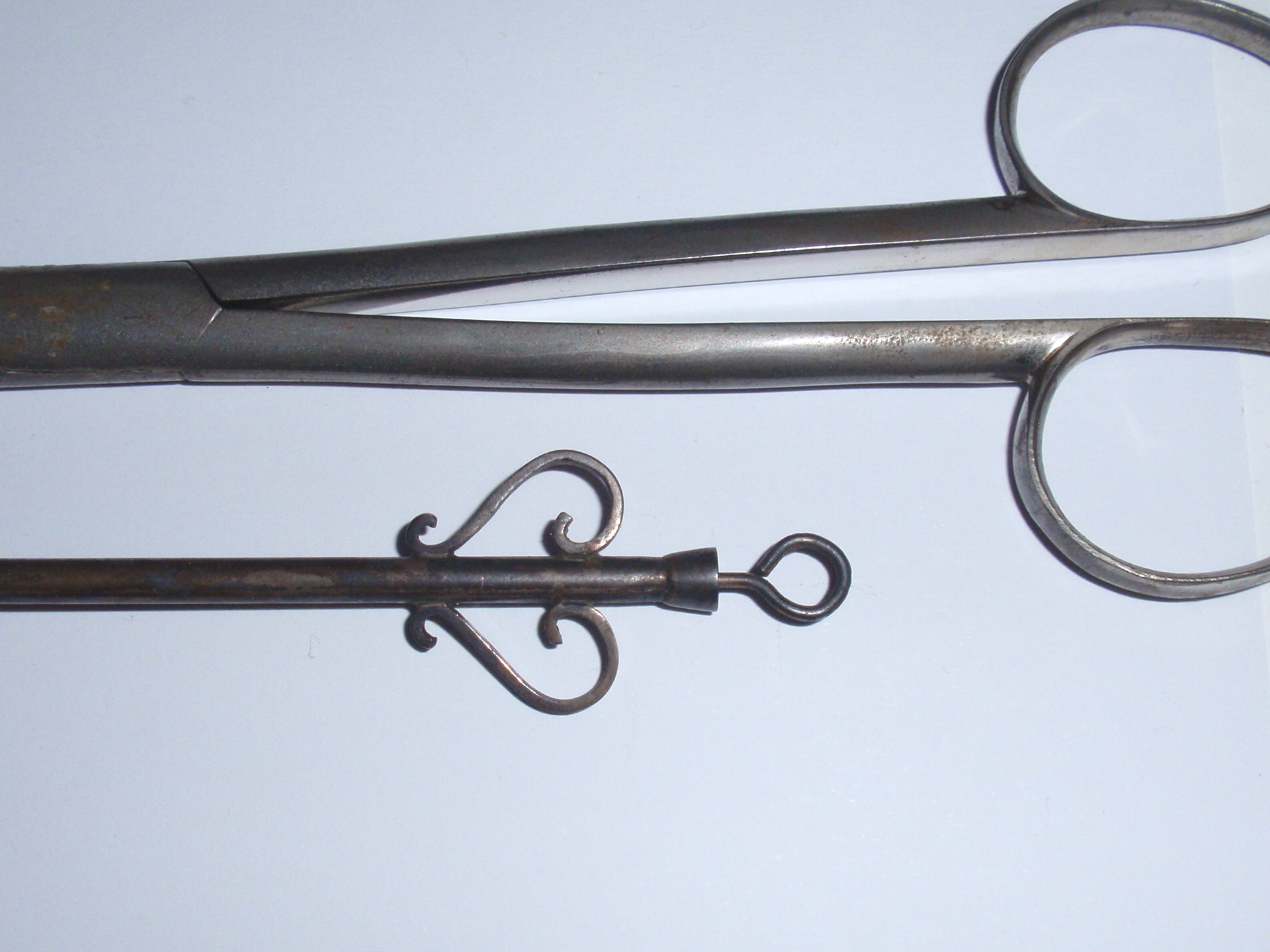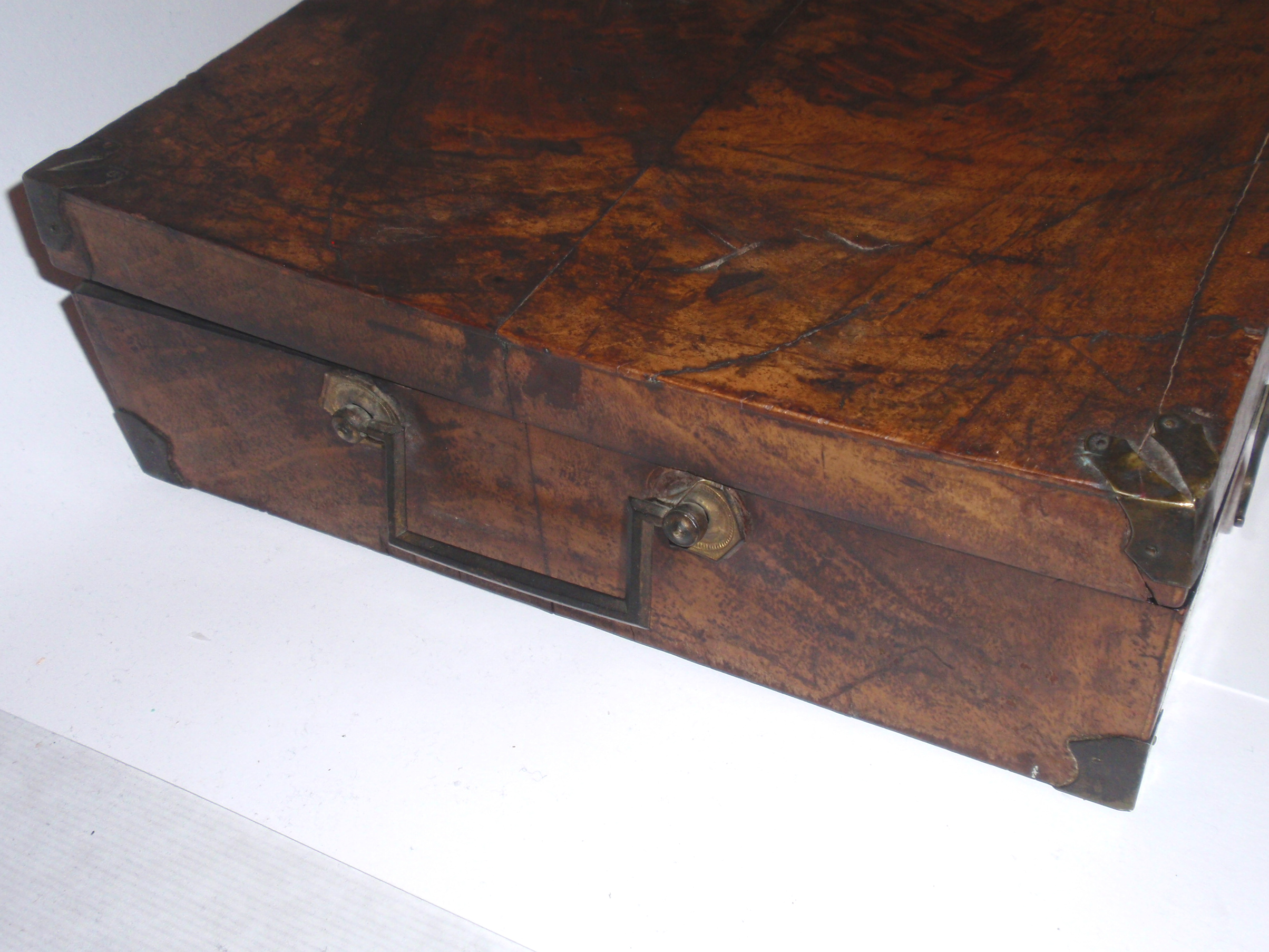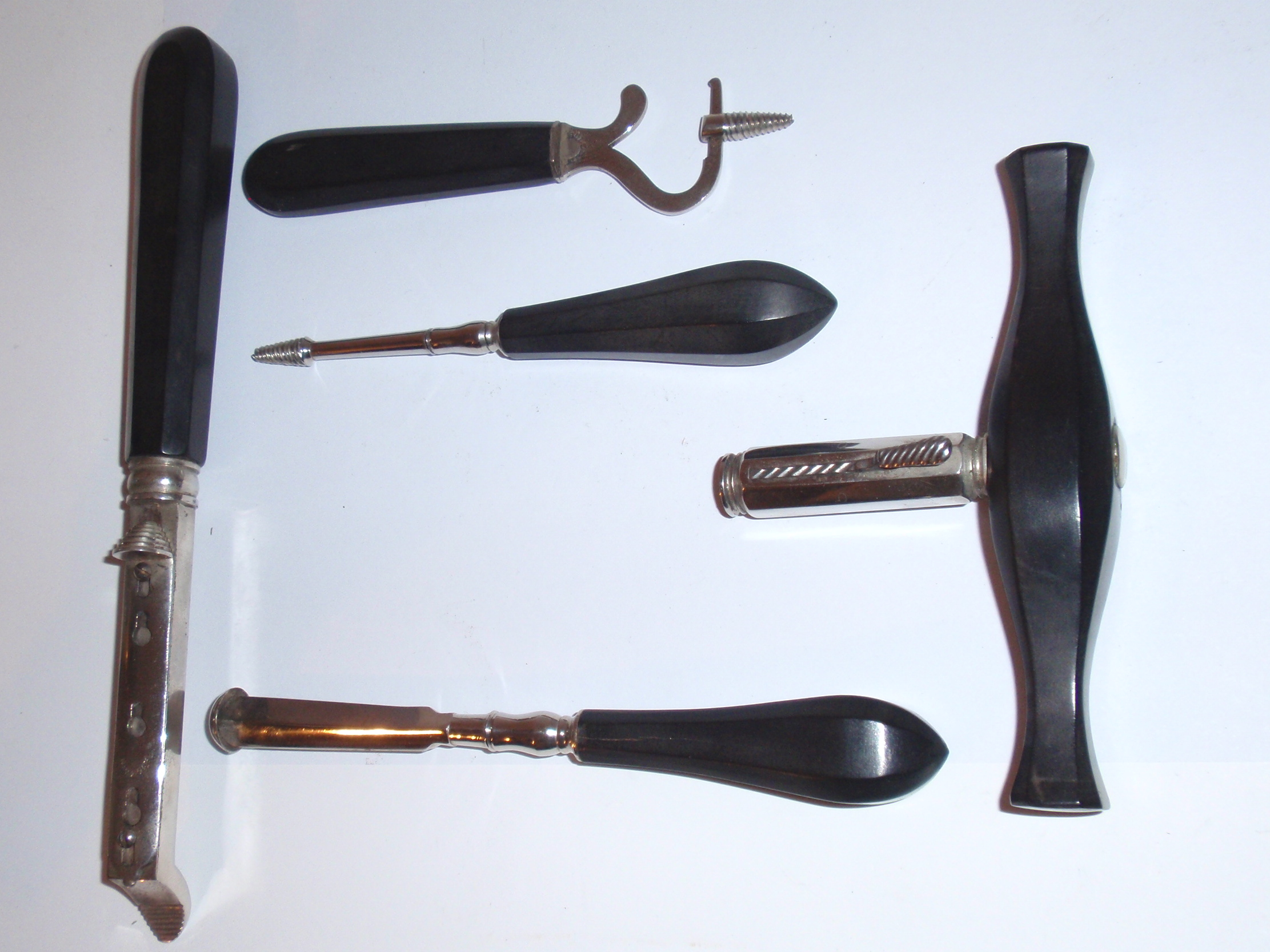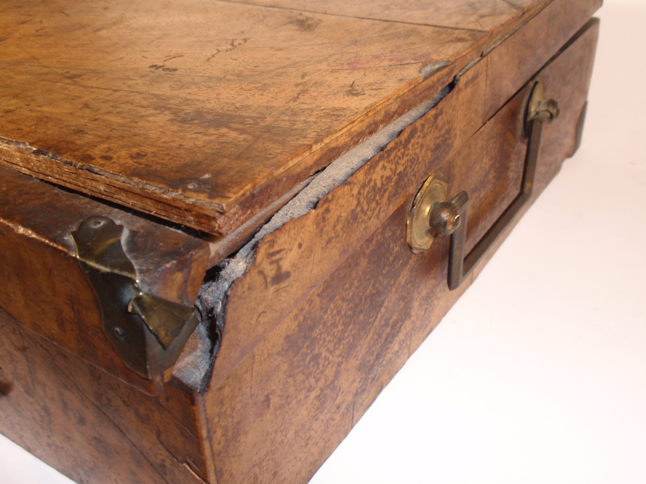 ca. 1810 bis 1840, Kastenmaße 53 x 27 x 8,5 cm; einige Instrumente fehlen; die im Kasten vorhandenen Instrumente sind alle sind original (keine Fremdinstrumente)! Auf dem großen Trepanbohrer, auf der Zange, dem Torniquet, der Säge und 3 anderen Instrumenten findet sich die Herstellersignatur "Hölzlin Friburg"; die großen Instrumente einschließlich Handbohrer haben einen Griff aus Ebenholz; der Drillbohrer hat Horngriffe; ansonsten sind die Instrumente aus poliertem Stahl; Drillbohrer mit 5 Bohreinsätzen; wenige kleine Instrumente sind leicht korrodiert, alles andere befindet sich in einem sehr guten Zustand! Der etwas verzogene Kasten ist mit rosa Samt ausgelegt. An einer Ecke (siehe Bild) sollte das Holz geleimt werden.