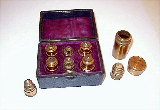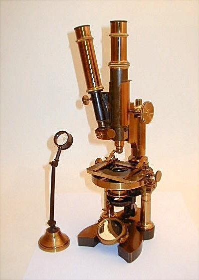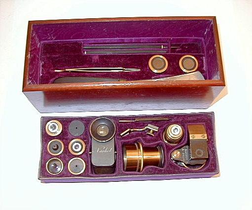 Großes und reichhaltig ausgestattetes Mikroskop mit Doppelsäule von Nachet, voll Messing, original zaponiert, ca. 1875. Höhe 38 cm, 1 Okularpaar für den Binokulartubus (bezeichnet mit A und B), 3 weitere Okulare für den Monokulartubus; 8 original Nachet-Objektive (!), 6 davon in einem extra Lederkasten, es handelt sich um folgende Nummern: 2, 3, 5, 6, 7 (signiert, mit Mikrometer), 8, 9 (signiert, mit Mikrometer) und eine 1/12 Immersion signiert in einer signierten Messingdose; 3fach-Revolver; der Binokulartubus läßt sich per Rändel-schraube an den Augenabstand anpassen; zusätzlich ein zweiter (Monokular-)Tubus mit 2fach-Revolver; Grobeinstellung, Feineinstellung, abfahrbarer und schwenkbarer schnell verstellbarer Kondensor unter dem Tisch, schöner früher Kreuztisch mit zweifacher Mikrometer-einteilung; der Spiegel befindet sich an einem mehrgliedrigen Arm; schweres Kippstativ, das Mikroskop ist um die optische Achse drehbar; separate schwere Auflichtlupe mit 2 Lupeneinsätzen; schöne Signatur auf dem Fuß "Nachet et Fils 17, rue St. Severin, Paris". Fine Nachet microscope with an elaborate array of accessories, made of polished lacquered brass, 38 cm high, rack & pinion coarse and fine focussing; the foot is very heavy with 2 columns; full mechanical stage; complete with all accessories! 8 original and signed objectives! 1 monocular and 1 binocular tube; polarisation microscope with polarizer and analyzer; the entire substage apparatus is raised and lowered along a dovetail rail by means of lever; freestanding bulls-eye condenser; the outfit of this impressive microscope is original and complete; the compendium packs into its original fitted, dovetailed brass-bound mahogany case with a working key; three fitted stacking trays hold most of the accessories; the condition of the stand is very fine (all original clear lacquer finish); the condition of the accessories and the optics is excellent! The big fitted mahogany case is also in a very good overall condition. Accessories include: binocular head with 2 oculars monocular tube with 3 oculars 8 signed objectives; 2, 3, 5, 6, 7, 8, 9, (6 in a fitted leather box) and one oil-immersion in a signed brass canister analyser and polarizer stage micrometer brass floating stage with clips signed Erecting-Prism double nosepiece signed Camera Lucida substage condenser.