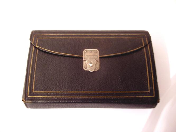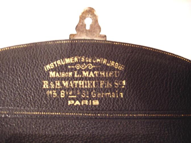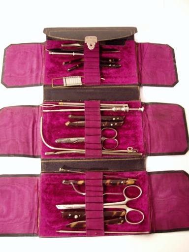 Schönes chirurgisches Reisebesteck von Mathieu in Paris, Ledertasche zum Aufklappen, ca. 1860 bis 1870, Maße geöffnet 35 X 30 cm; Maße ungeöffnet 17 X 11 X 4 cm; insgesamt 21 Instrumente: 7 schöne und signierte Skalpelle und Lanzetten mit oder in Hornscheiden, Katheter männlich und weiblich, 2 Scheren (u. U. späteren Datums), 3 Sonden, große Nadel, Aderlasslanzette, Pinzette, Punktionsnadel in Hülse, 2 mir unbekannte Instrumente; Signatur in Golddruck innen "Instruments de Chirurgie Maison L. Mathieu R. & H. Mathieu Fils Ses. 113 Bvard. St. Germein Paris"; sehr gut erhaltenen schwarze Ledertasche mit Goldpunkten als Umrandung; innen violetter Samt; versilbertes Schloss; ein seltenes militärisches medizinisches Besteck! Guter bis sehr guter Zustand.