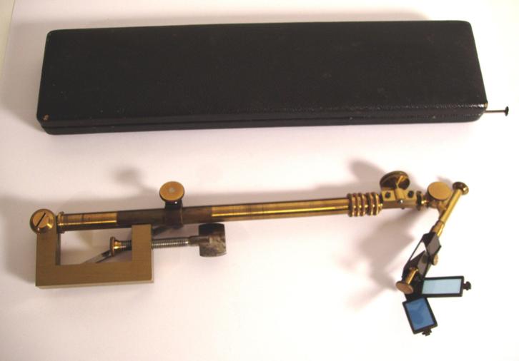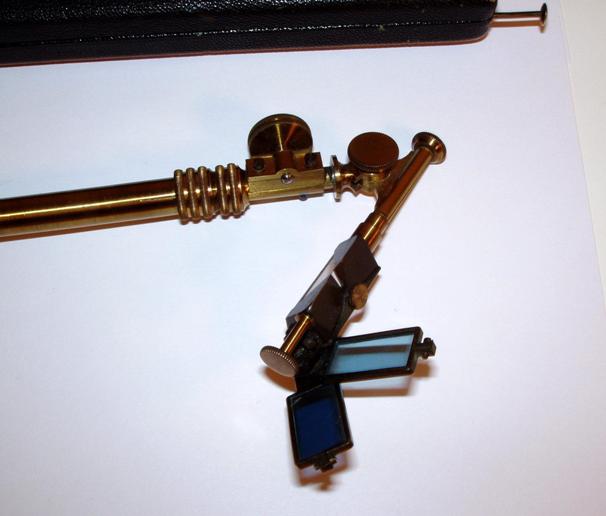 Sehr schöne Camera Lucida, ca. 1900, Länge des Etuis 28 cm; Breite 6 cm; außen schwarzes Leder und innen roter Samt; die Camera Lucida ist sehr gut erhalten und voll funktionsfähig; 6 linsenähnliche Glasplättchen lassen sich in eine Halterung des Prismenarmes schieben (offenbar ist das Etui für ca. 12 Glasplättchen eingerichtet); das Prisma ist bestens erhalten; das Gerät ist ausziehbar und mehrfach verstellbar; Signatur "Chambre Claire Universelle P. Berville 25, Chaussee d´Antin, Paris"; im Kasten mit Golddruck ein Logo "P. Berville Paris"; Etui und Instrument sind komplett und voll funktionsfähig! Alles befindet sich in einem sehr guten Zustand! A very well working camera lucida in a very good condition; length of the small velvet lined leather covered box 28 cm, 6 changeable glas lenses (instead of 12), the prism in in a super condition; there are several adjustments; makers name "Chambre Claire Universelle P. Berville 25, Chaussee d?Antin, Paris"; box and instrument are in a fine condition.