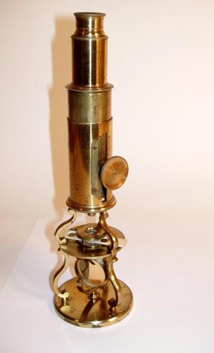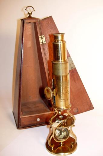 voll Messing, original zaponiert, ca. 1800 - 1820; Höhe 28 cm, 1 verschraubtes Okular, 4 nummerierte Objektive, Grob- und Feineinstellung über einen Trieb; gute Ausstattung mit: Bonnani-Tisch, Pinzette, Fischplatte, Elfenbeindose mit Sprengringen, 3 Elfenbeinobjektträger; das komplette und absolut originale Zubehör befindet sich in der Schublade unten im Kasten; mechanisch und optisch sehr gut, Erhaltung für ein Gerät dieses Alters sehr gut, schöner konisch zulaufender original Kasten. Fine small Culpepper type microscope, brass, original laquered, first quarter 19th century, height 11 inch. (28 cm), 1 ocular, 4 numbered objektives, spring stage, stage forceps, fish plate, ivory talc box, 3 bone specimen slides; all accessories are in the drawer of the original pyramidal wooden case; very good condition of the instrument and the case!