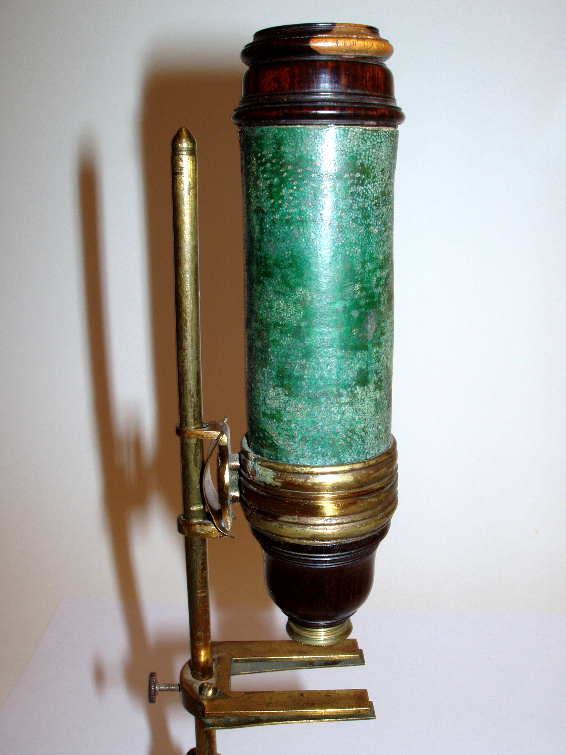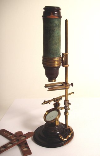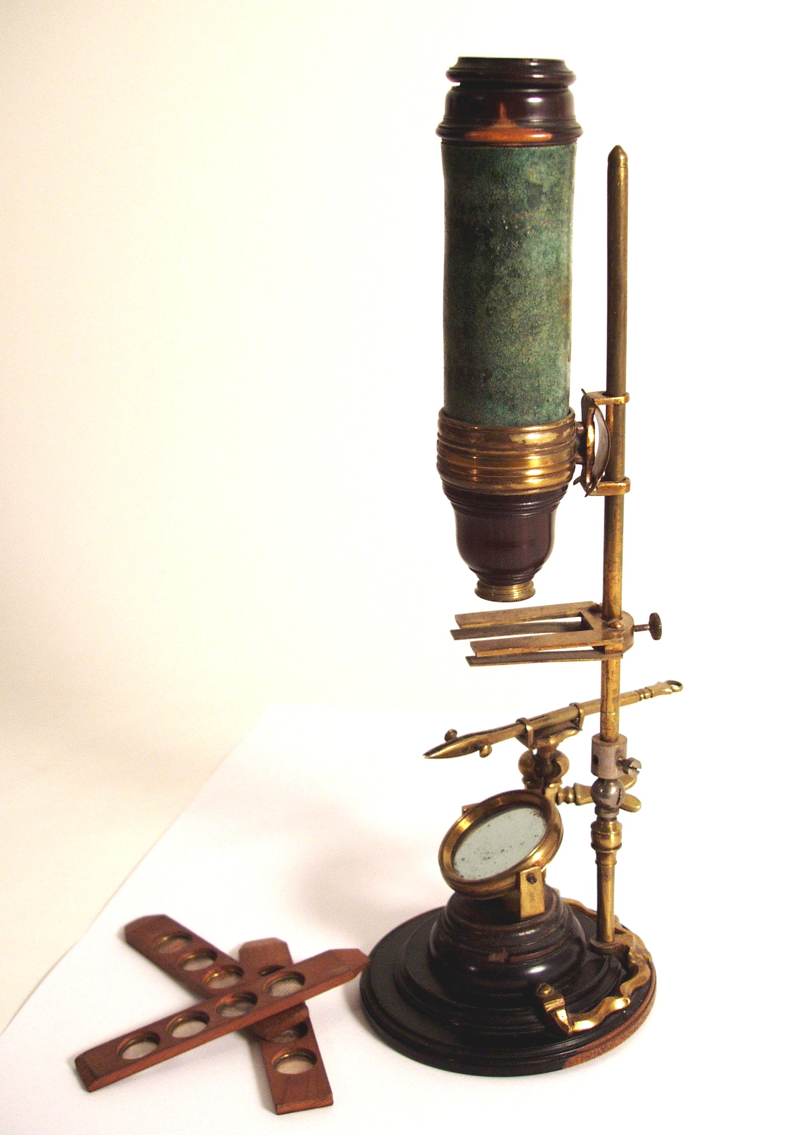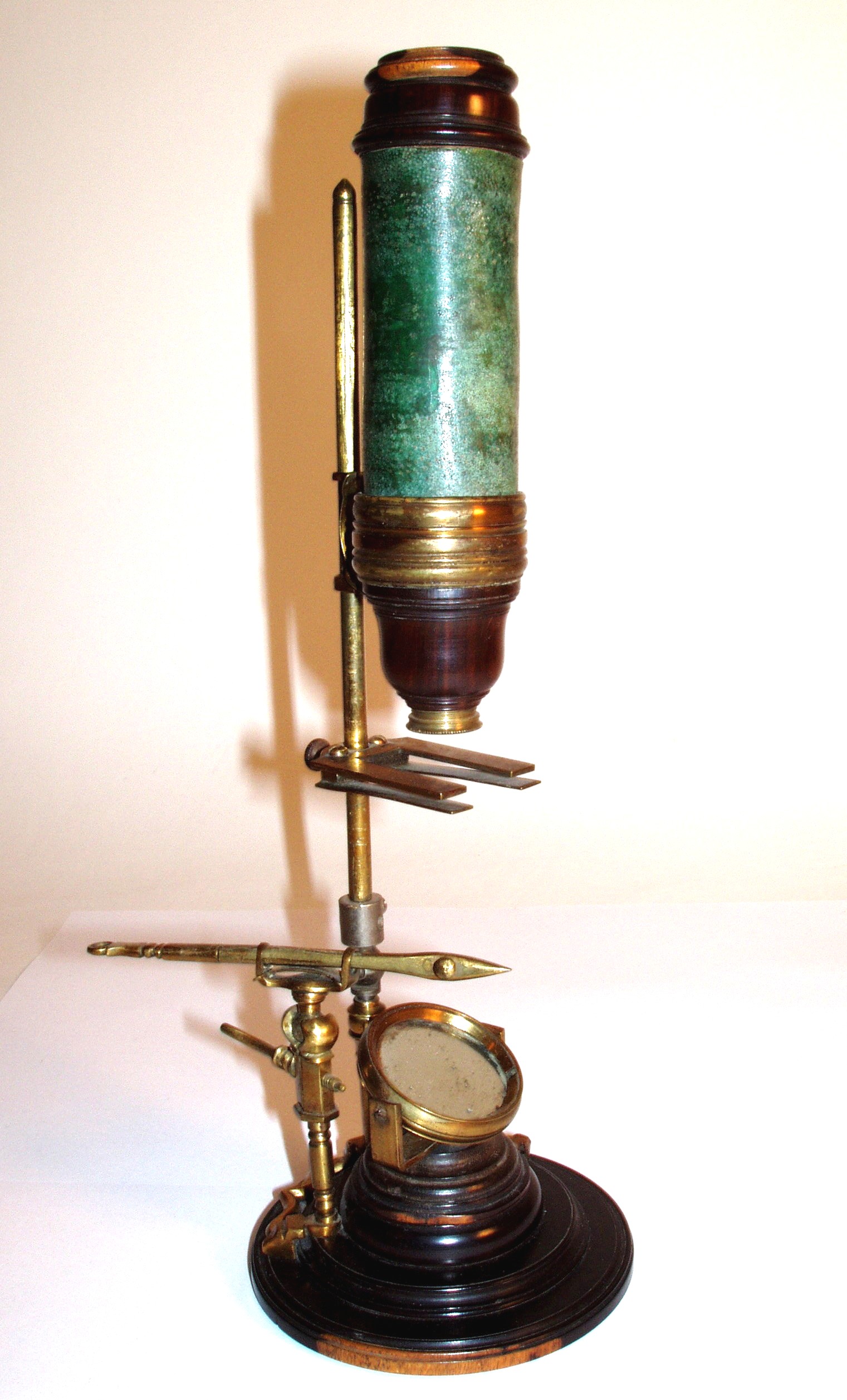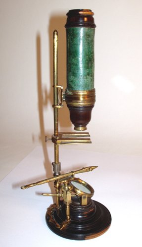 Messing mit Holz und Leder, original zaponiert, ca. 1720 - 1750. Höhe 27 cm; 1 Objektiv, 1 Okular; der lederummantelte Tubus muß per Hand mit Hilfe einer sehr alten Feststellkonstruktion an der schlanken Stativsäule verschoben werden; Objektiv und Okular befinden sich in Hornfassungen; die schlanke Säule ist auf dem gedrehten Holzfuß (Durchmesser 9 cm) mit geschwungenen "Auslegern" stabil befestigt; an einem dieser Ausleger ist eine Pinzette mit einem feststellbaren Kugelgelenk montiert; in den Tisch können die vorhandenen 3 Holzpräparate eingeklemmt werden, er lässt sich ebenfalls in der Höhe verstellen; es einige Mängel sind zu erwähnen: die Schraube zur Verstellung des Tisches ist neueren Datums; zudem wurde die schlanke Stativsäule - vermutlich schon vor Jahrzehnten - mit einem Kugelgelenk aus Eisen versehen; dadurch lässt sich diese Säule in der Neigung verstellen; trotz der beschriebenen Mängel handelt es sich um ein einmaliges Mikroskop! Alter und Art machen es zu einem herausragenden Objekt! Die optische Funktion ist erstaunlich gut! Der Zustand ist gut bis sehr gut. Die alte Zaponierung ist komplett erhalten. Museumsqualität! Rare and very early continental microscope, brass, wood, and leather, original laquered, first quarter 18th century, 1 objective, 1 ocular, with side mounted forceps, 3 wooden specimen slides, height of the microscope 10 ½ ´´; good function and condition of the instrument, museum quality!
