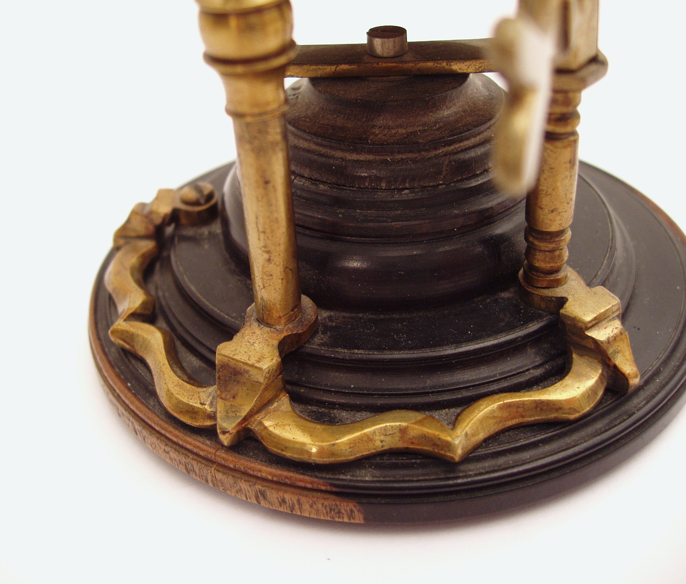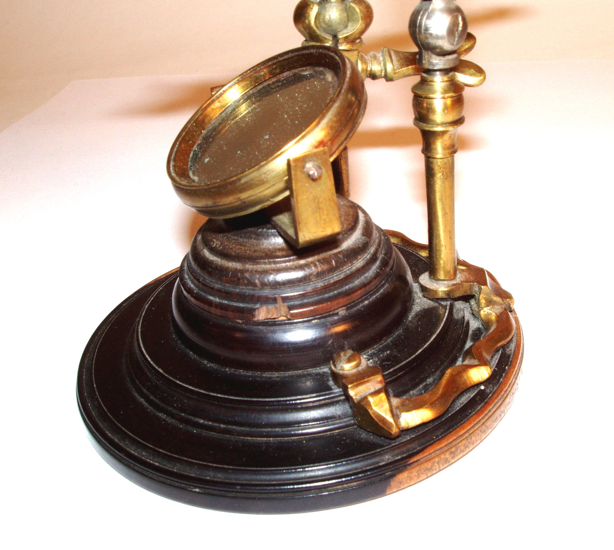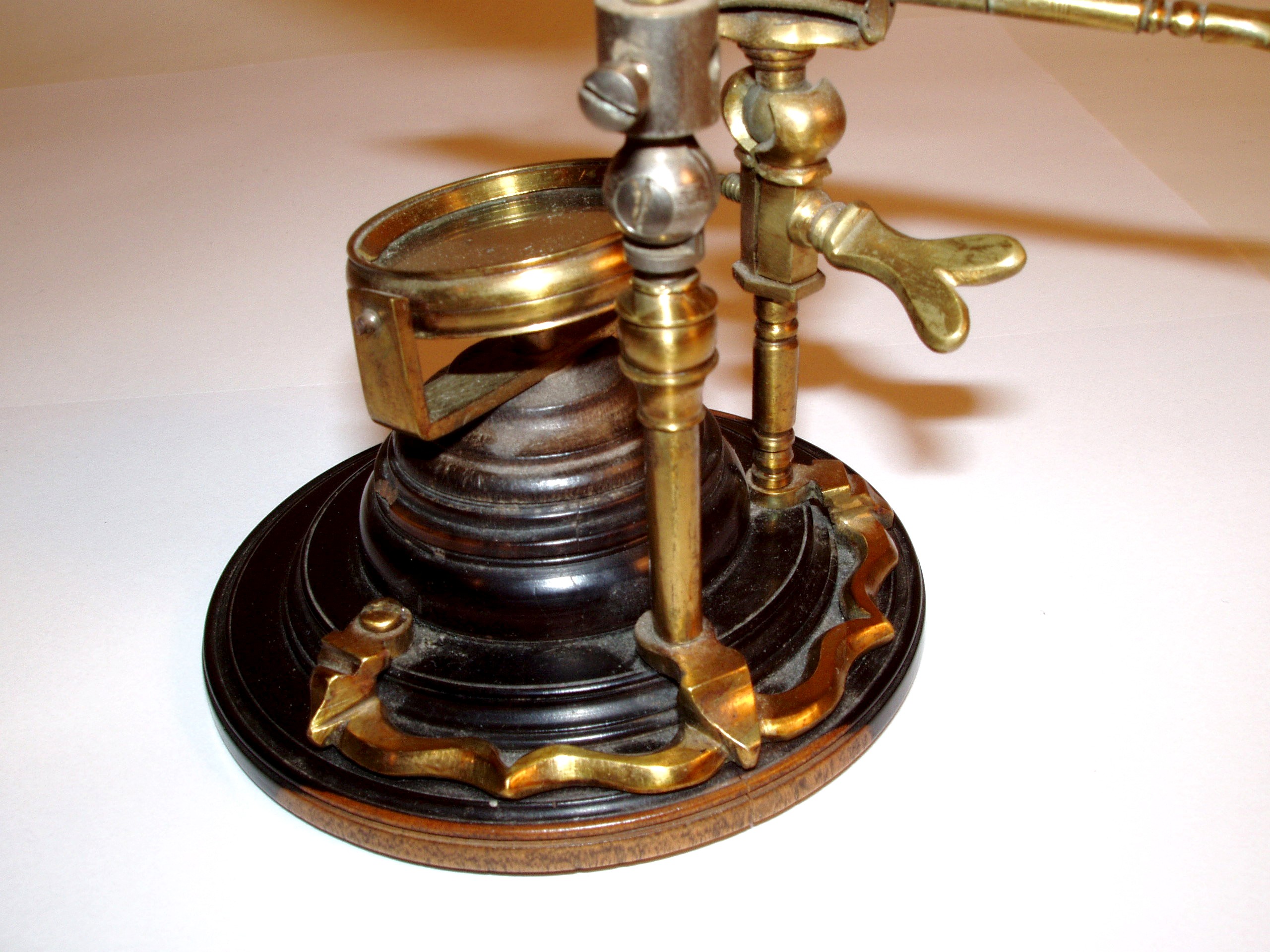 Messing mit Holz und Leder, original zaponiert, ca. 1720 - 1750. Höhe 27 cm; 1 Objektiv, 1 Okular; der lederummantelte Tubus muß per Hand mit Hilfe einer sehr alten Feststellkonstruktion an der schlanken Stativsäule verschoben werden; Objektiv und Okular befinden sich in Hornfassungen; die schlanke Säule ist auf dem gedrehten Holzfuß (Durchmesser 9 cm) mit geschwungenen "Auslegern" stabil befestigt; an einem dieser Ausleger ist eine Pinzette mit einem feststellbaren Kugelgelenk montiert; in den Tisch können die vorhandenen 3 Holzpräparate eingeklemmt werden, er lässt sich ebenfalls in der Höhe verstellen; es einige Mängel sind zu erwähnen: die Schraube zur Verstellung des Tisches ist neueren Datums; zudem wurde die schlanke Stativsäule - vermutlich schon vor Jahrzehnten - mit einem Kugelgelenk aus Eisen versehen; dadurch lässt sich diese Säule in der Neigung verstellen; trotz der beschriebenen Mängel handelt es sich um ein einmaliges Mikroskop! Alter und Art machen es zu einem herausragenden Objekt! Die optische Funktion ist erstaunlich gut! Der Zustand ist gut bis sehr gut. Die alte Zaponierung ist komplett erhalten. Museumsqualität! Rare and very early continental microscope, brass, wood, and leather, original laquered, first quarter 18th century, 1 objective, 1 ocular, with side mounted forceps, 3 wooden specimen slides, height of the microscope 10 ½ ´´; good function and condition of the instrument, museum quality!