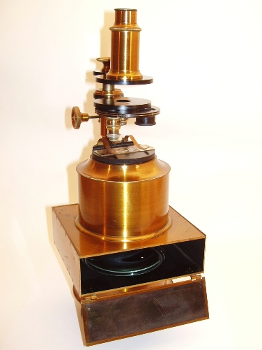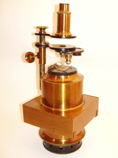 voll Messing, original zaponiert, ca. 1870 - 1880, Höhe 37 cm, 3 Objektive in einem großen 3fach-Revolver; 1 fest eingeschraubtes Okular, Grob- und Feinstellung durch einen Trieb; 2 große Linsen unterhalb des Messingkastens mit einem Durchmesser von je 10 cm projizieren ein Bild auf eine Wand; die Bedeutung des Messingkastens (Maße 16 x 16 x 5,5 cm) bleibt unklar; der Kasten hat an einer Seite eine Klappe; mechanisch und optisch sehr gut, Erhaltung gut bis sehr gut, bestens erhaltene Zaponierung; ein imposantes und außergewöhnliches Mikroskop!