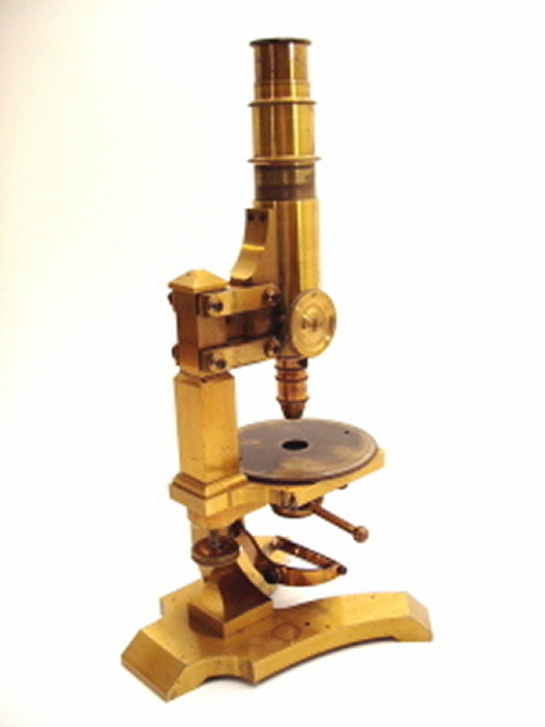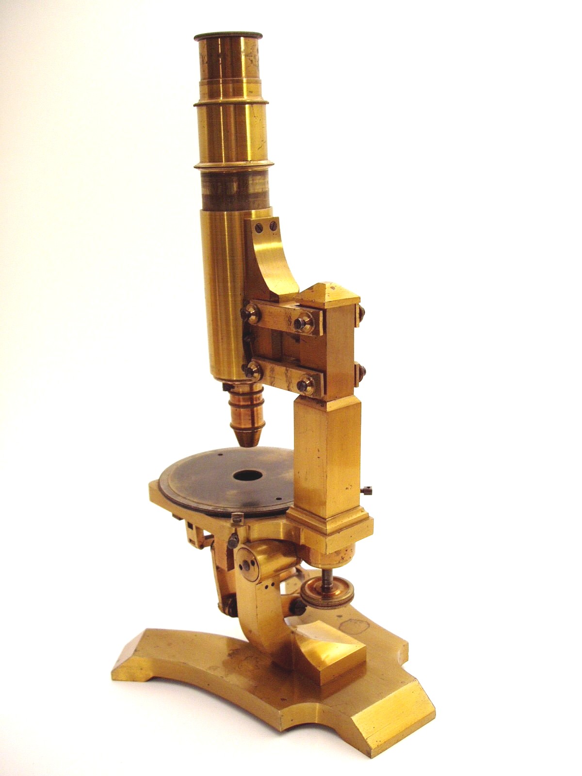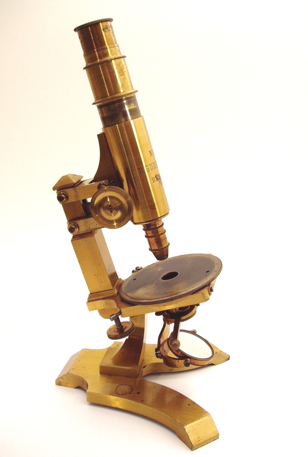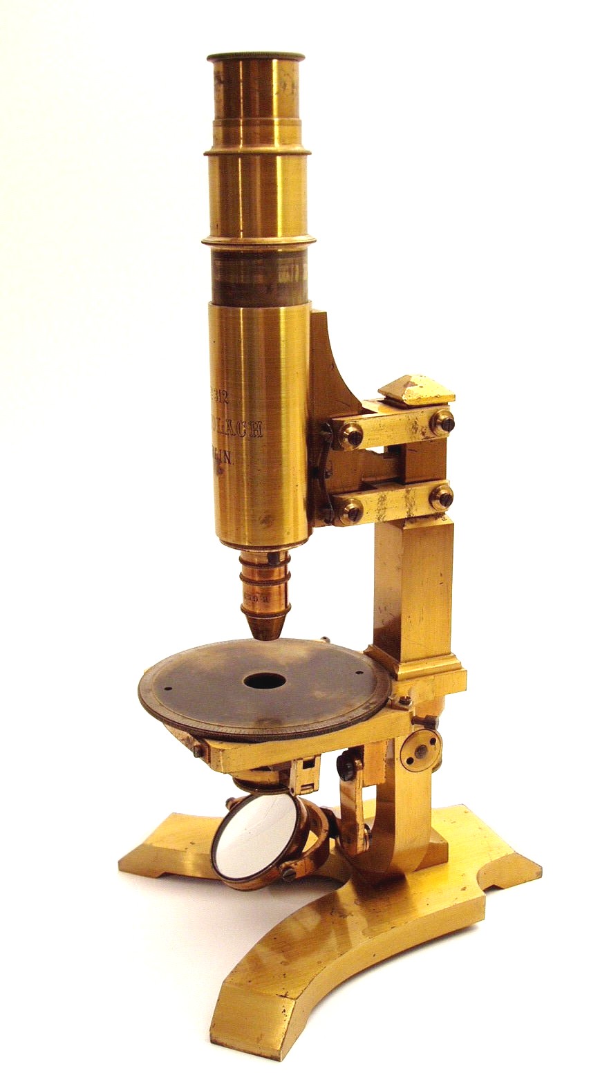 Großes und frühes Polarisations-Mikroskop von Gundlach in Berlin, voll Messing, original zaponiert, ca. 1865. Höhe 32 cm, 3 nummerierte Okulare (I, II, II), ein zu- sätzliches Okular mit verstellbaren Lichteinlaß; nur 1 signiertes Objektiv, eigentümlicher 4fach-Revolver, Grobeinstellung, Feineinstellung hinten unter der Säule (sichelförmiges Stativunterteil); dieses Bauprinzip hat Seibert später fortgeführt; Polarisator, Analisator mit Mikrometereinteilung; Tisch mit Mikrometereinteilung; Kondensorhülse in Schwalbenschwanzführung mit einem Hebel verstellbar; Kippstativ; sehr schöne Signatur auf dem Tubus "Gundlach Berlin No. 312"; mechanisch und optisch gut, Erhaltung gut, schöner großer liegender Kasten; mit nummerierter Vergrößerungstabelle. Very rare compound polarization microscope from Gundlach, fully made of brass, ori- ginal lacquered, hight 12,5" ( 32 cm), 3 numbered oculars, 1 signed objective, rotating quadruple nosepiece, rack and pinion coarse focusing, fine focusing beneath the pillar; early mechanical stage, polarizer, analizer with micrometer; mechanical and optical good, condition good (the microscope retains all its original lacquer, some minor spot- ting, mainly on the base,), mechanics work well, a rare instrument with nearly all accessories in a beautiful fitted mahogany box. E. Gundlach produced less than 1.000 microscopes; because of economic problems he sold his firm in 1872 and went to the USA; he worked some time for Bausch & Lomb Rochester N. Y.