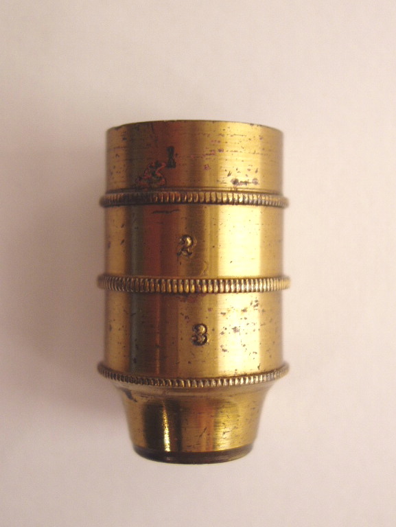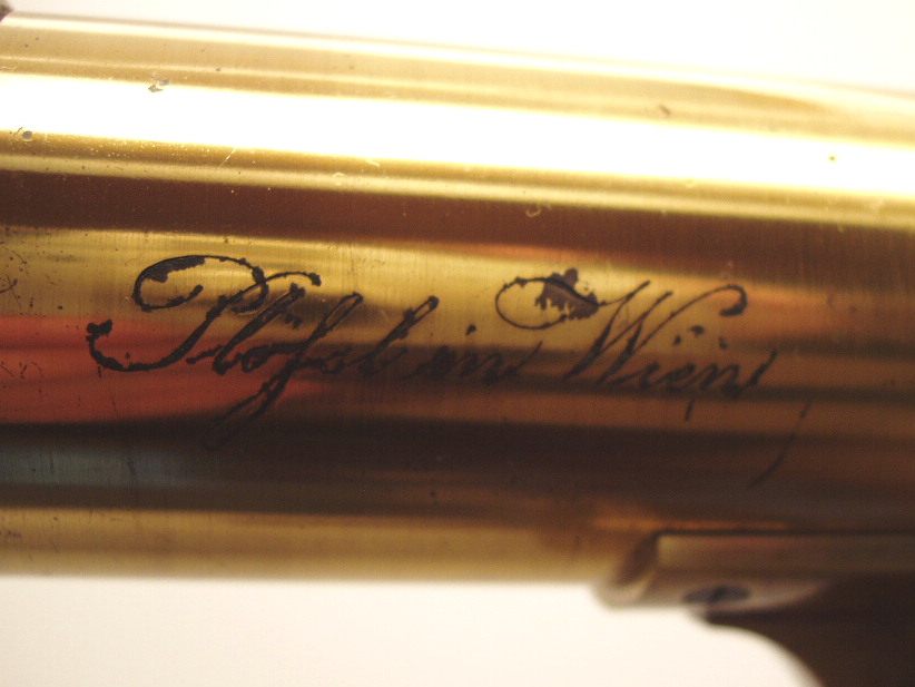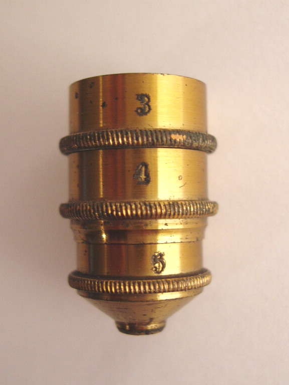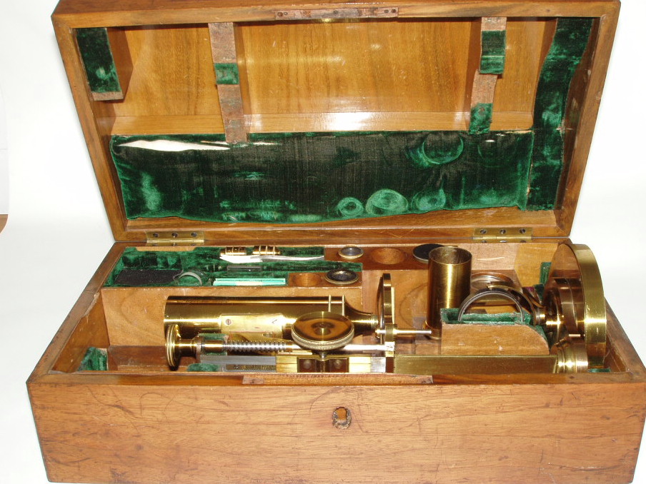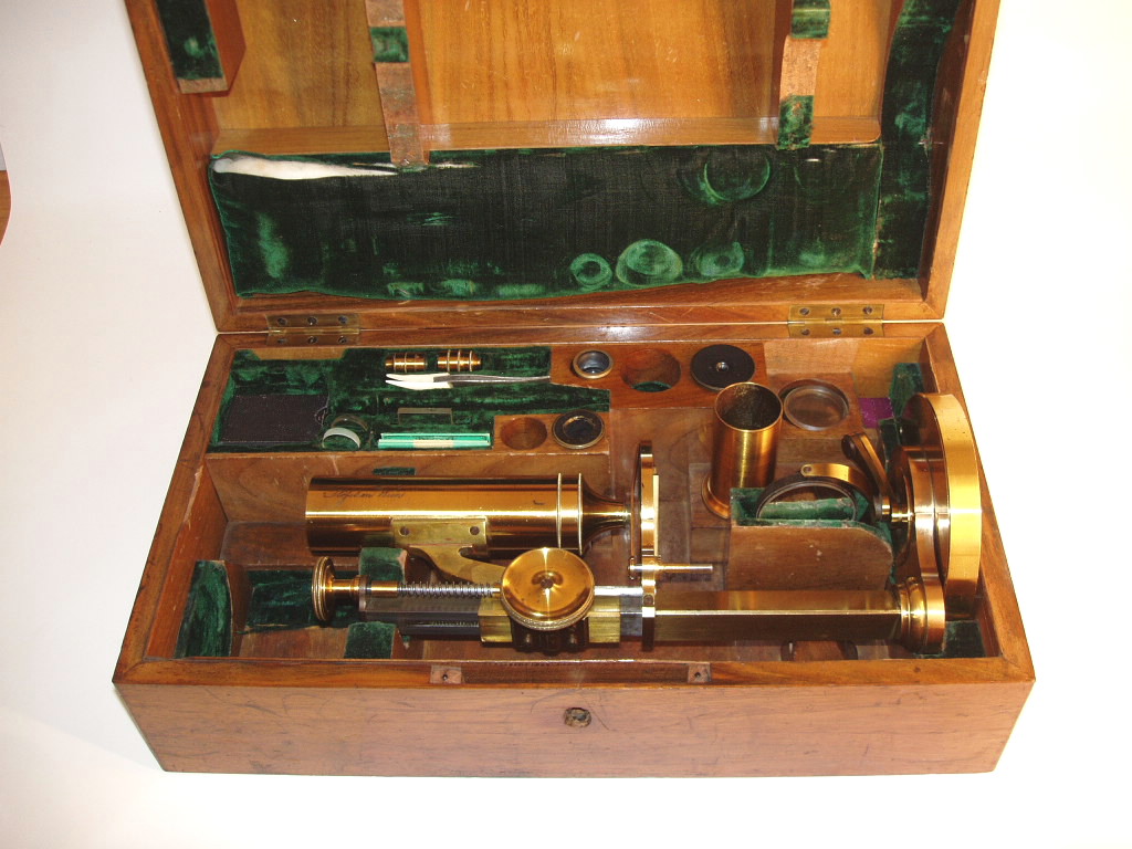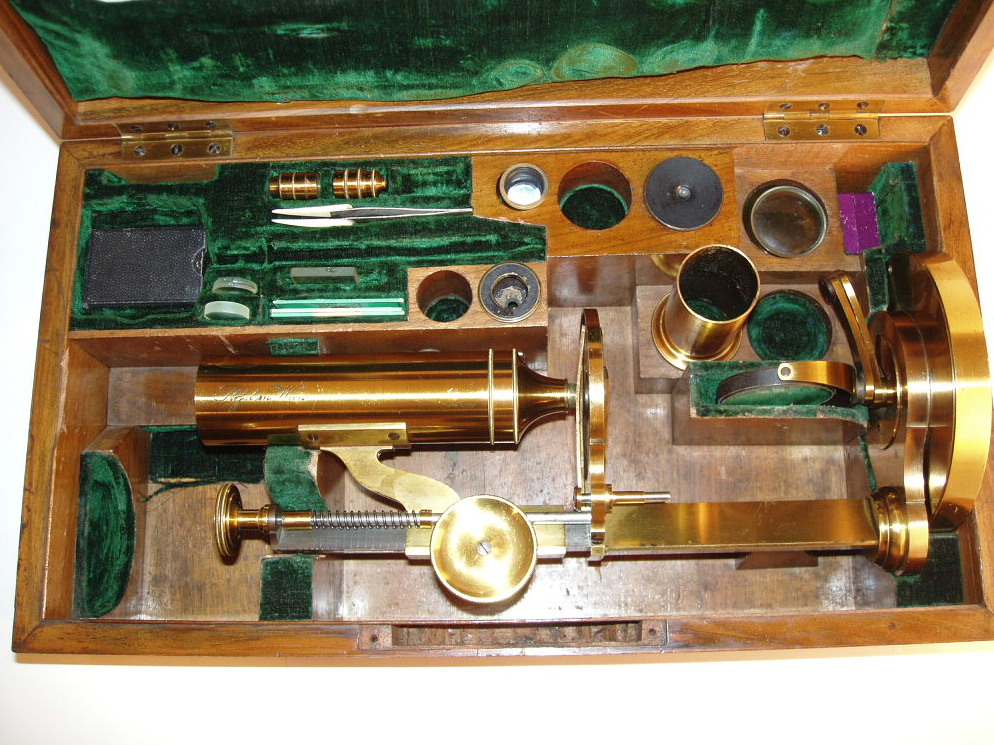 Großes Rundfuß-Mikroskop von Plössl in Wien, voll Messing, original zaponiert, ca. 1856; Höhe 44 cm; 1 nummeriertes Okular (Nr. 3), 2 Sätze von miteinander verschraubbaren nummerierten Objektiven (einmal Nr. 1, 2 und 3 und dann Nr. 3, 4 und 5); Dreikantstativ auf einem runden um die optische Achse drehbaren Fuß (Durchmesser 13 cm); Grobeinstellung per Zahn und Trieb über die Dreikantsäule des Stativs; die Feineinstellung hebt den Tisch mit Hilfe der senkrechten Rändelschraube; der Spiegel ist 4fach gelagert; der Mikroskoptisch hat eigentlich eine Auflage aus schwarzem Mattglas (diese Auflage fehlt); das große - in den Fuß einsteckbare - Selliguesche Prisma fehlt ebenfalls; 2 Tischklemmen, 3 alte Glaspräparate, mit der typischen Signatur auf dem Tubus "Plössl in Wien"; mechanisch und optisch gut, Erhaltung gut, wenn auch nicht ganz komplett; sehr großer original Kasten (Maße 42 X 24 X 14,5 cm) mit dem typischen grünen Samt; an einer Stelle ist der samt eingerissen; das Schloss fehlt. A big microscope from Plössl with round foot, fully made of brass, original laquered, ca. 1856, hight 44 cm, 1 numbered ocular, 2 sets of objectives (No. 1, 2 and 3 and No. 3, 4 and 5); rotating foot, diameter of the foot 13 cm; coarse focusing by rack and pinion, fine focusing by the perpendicular long screw moves the stage; the prism is missing, signature on the tube "Plössl in Wien"; mechanics function correctly, optical good, some smaller parts missing, the big with green velvet lined box (42 X 24 X 14,5 cm) is very good but without lock, there is one tear in the velvet.