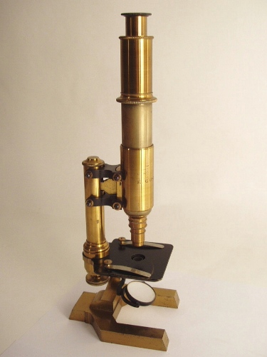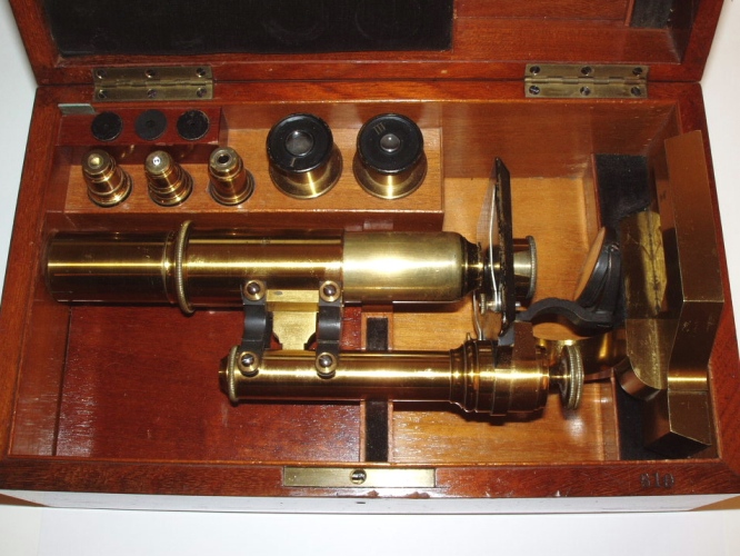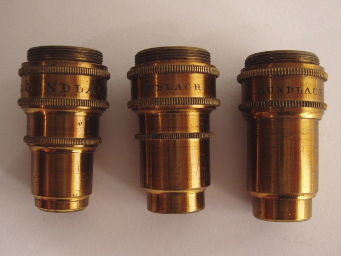 Seltenes Mikroskop von Gundlach in Berlin, voll Messing, original zaponiert, ca. 1868. Höhe 29 cm, 2 nummerierte Okulare (I und II), 3 signierte und nummerierte Objektive (II, III und IV), Grobeinstellung, Feineinstellung hinten unter der Säule (sichelförmiges Stativunterteil); dieses Bauprinzip hat die Firma Seibert später fortgeführt; Kondensorhülse mit 3 Lochblenden; schöne Signatur auf dem Tubus "E. Gundlach"; mechanisch und optisch gut, Erhaltung gut bis sehr gut, sehr schöner Kasten mit der eingestanzten Nummer "811"; dieselbe Nummer befindet sich auf der originalen Vergrößerungstabelle. Aus dieser geht hervor, dass das Mikroskop noch alles Zubehör wie am Tag des Verkaufs besitzt! Very rare compound microscope from Gundlach, Berlin; fully made of brass, original lacquered, hight 11,5 " ( 29 cm), 2 numbered oculars, 3 signed and numbered objectives, rack and pinion coarse focusing, fine focusing beneath the pillar; mechanical and optical very good, condition good (the microscope retains all its original lacquer, some minor spotting on the base,), mechanics work well, a rare instrument with all accessories in a beautiful fitted mahogany box numbered "811". E. Gundlach produced less than 1.000 microscopes; because of economic problems he sold his firm in 1872 and went to the USA; he worked some time Bausch & Lomb Rochester N. Y.