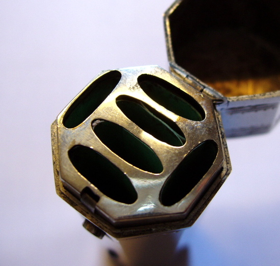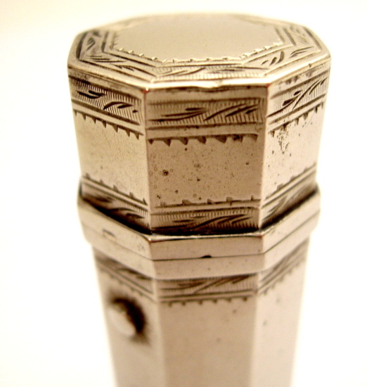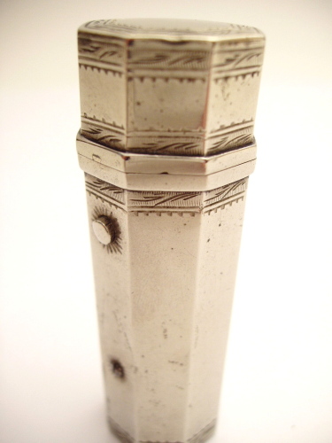 Sehr altes Etui aus Silber mit 6 Lanzetten; ca. 1760 bis 1780; Höhe des achteckigen Etuis 7 cm; der Lanzettenbehälter ist schön verziert; 3 Lanzetten sind signiert "Lüer a Paris", "Charriere" und Sollin & ?" (nicht lesbar); alle 6 Lanzetten haben Griffe aus Schildpatt und sind sehr alt, stammen aber nicht aus derselben Zeit; guter bis sehr guter zustand; ein seltenes und sehr schönes komplettes Instrument! Fine antique silver etui containing 6 lancets in tortoise-shell guards; ca. 1760 - 1780, octagonal shape of the silvered etui; height 2 " (7 cm); etui with nice decoration, 3 of the lancets are signed "Lüer a Paris", "Charriere", Sollin & "; all lancets are very old but differ in their producing date; complete and very rare!