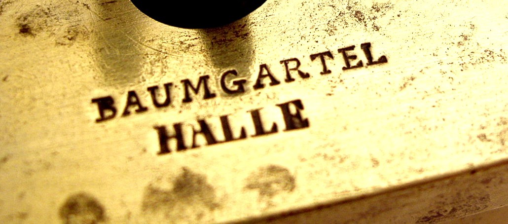 Schöner signierter Aderlaßschnepper aus Messing von Baumgartel in Halle, Blockform, ca. 1860, Maße 4,5 x 3,5 x 3,5 cm; Signatur "Baumgartel Halle"; diese Schnepper sind sehr selten signiert; funktionsfähig, eine von 12 Klingen fehlt; ansonsten guter Zustand. Single-bladed scarificator, ca. 1860; brass, measures 1 3/4 x 1 ½ x 1 ½", rare signature "Baumgartel Halle"; good overall condition, in working order.