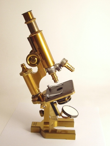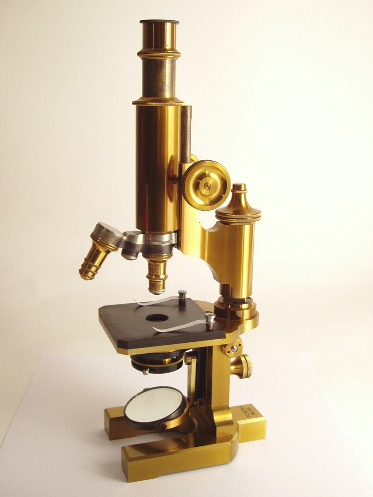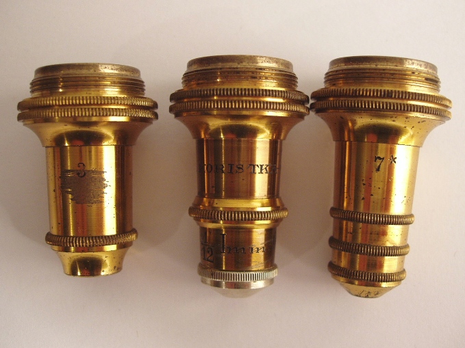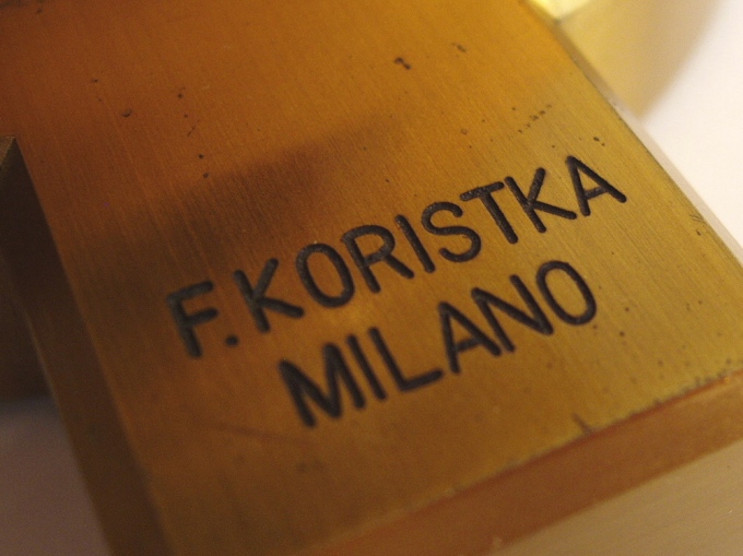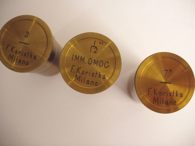 voll Messing, original zaponiert, ca. 1860 - 1870, Höhe 32 cm, bestens ausgestattet mit 3 signierten Objektiven (3, 7 und 1/12 Öl-immersion), alle in ebenfalls signierten Messingdosen, 3 Okulare (Nr. 2, 4 und ein Kompensationsokular), 2fach-Revolver, Grobeinstellung, Feineinstellung, abfahrbarer Kondensor, Kippstativ, Signatur auf dem schweren Fuß "F. Koristka Milano"; mechanisch und optisch sehr gut, Erhaltung sehr gut (der Zustand ist kaum zu übertreffen!). Ein wenig benutztes Mikroskop. Sehr schöner Kasten mit der Nummer "5.783". Ein seltenes italienisches Mikroskop in einem Spitzenzustand!.