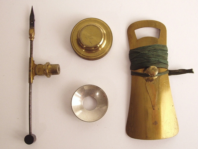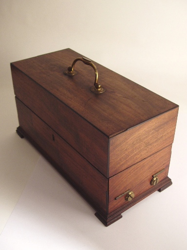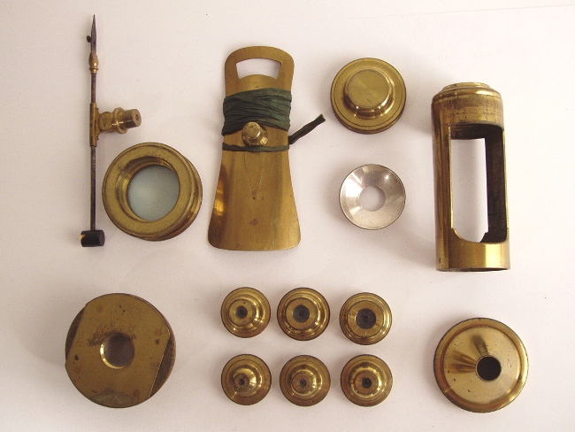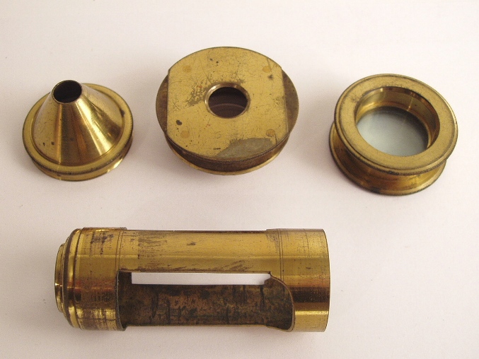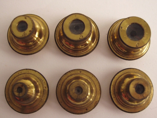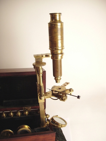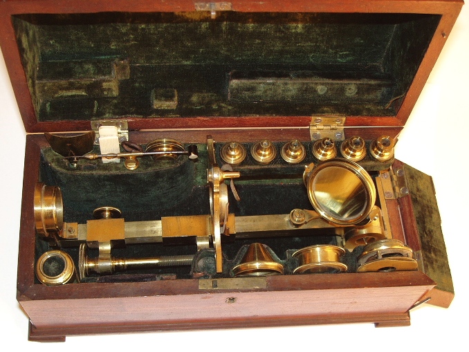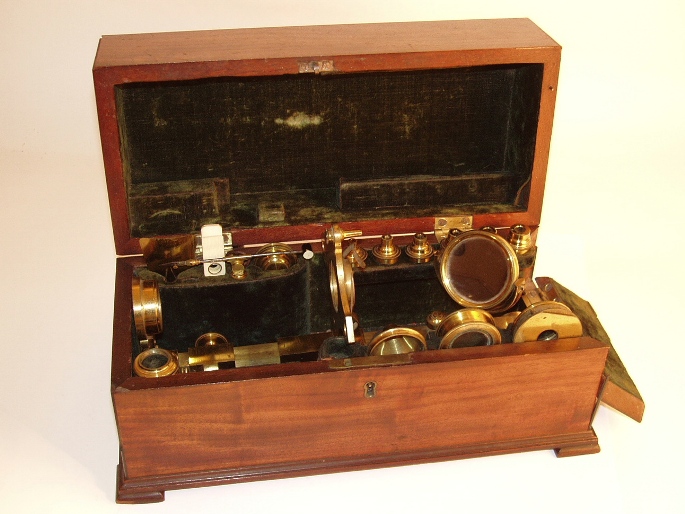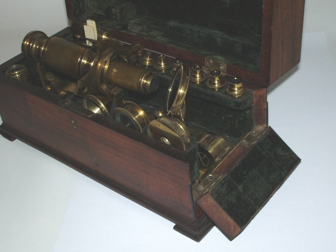 voll Messing, original zaponiert, ca. 1780 - 1800; Arbeitshöhe wie abgebildet 38 cm, 1 verschraubtes Okular, 6 nummerierte Objektive (alle mit Linse!); Grobeinstellung durch Verschieben und Fixieren des Tisches, Feineinstellung durch die lange senkrechte Rändelschraube rechts neben der Vierkantsäule; das Mikroskop ist bestens ausgestattet mit einer Fischplatte, einem Bonnani-Tisch, großer Tischblende, Lieberkühnspiegel in Messingbox, Tubusverlängerung, Pinzette, Life-box, 3 Elfenbeinobjektträgern (ohne Präparate); mechanisch und optisch gut bis sehr gut, Erhaltung für ein Gerät dieses Alters gut, schöner mit grünem Samt ausgeschlagener Original-Kasten (Maße 29 x 13 x 15 cm), in den das Mikroskop nach gebrauch hineingeklappt wird. – Auch wenn das Instrument keine Signatur trägt, weisen Stilelemente von Mikroskop und Kasten auf ein englisches Erzeugnis hin. Ein so komplettes und gut erhaltenes Mikroskop dieser Art ist kaum noch zu finden! Very rare english chest-microscope; fully made of brass, original laquered, end of 18th C or beginning 19th C, height 15". 1 ocular, 6 numbered objectives (all with lens!), coarse and fine adjustment; Lieberkühn, fishplate, spring stage, life-box, 3 bone specimen, tweezers; plano-concave mirror, original green velvet linned wooden case (11 ½ x 5 x 6"). There is no signature, but it seems to be a very rare and early microscope made in England.