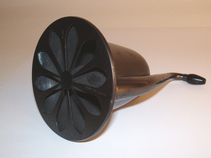 ungewöhnliche Form, auch als Hördose oder "London Dome" bezeichnet, ca. 1910 – 1920, vorne eine Rosette als Öffnung; Länge 15 cm; Durchmesser vorne 9,5 cm; Signatur "R. J. Dowling London"; sehr guter Zustand.