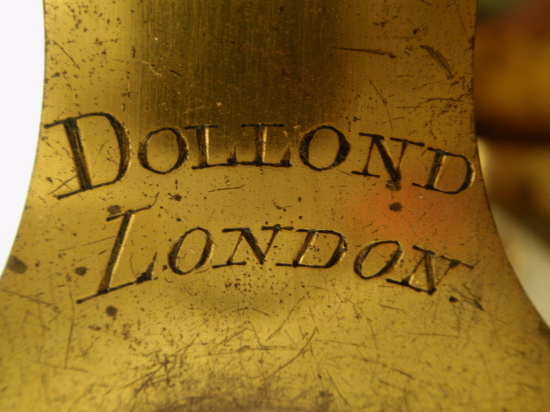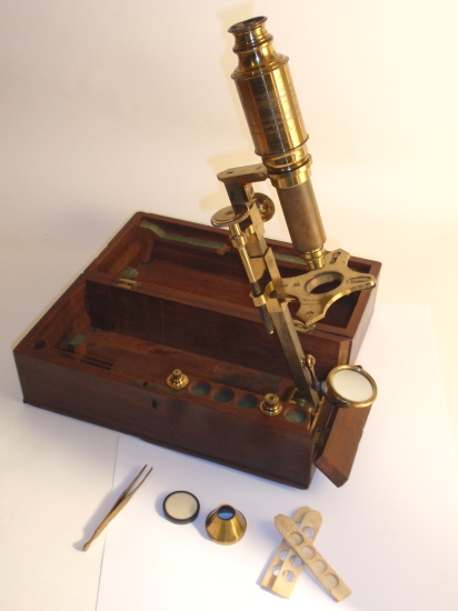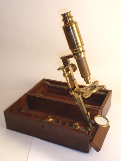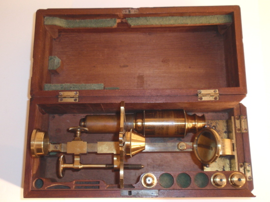 voll Messing, original zaponiert, ca. 1780 - 1800; Arbeitshöhe wie abgebildet 37 cm, 1 verschraubtes Okular (mit Zwischenlinse), 3 (von 6) nummerierten Objektiven (alle mit Linse!); Grobeinstellung durch Verschieben und Fixieren des Tisches, Feineinstellung durch die lange senkrechte Rändelschraube rechts neben der Vierkantsäule; das Mikroskop ist leider nur karg ausgestattet mit einer großer Tischblende, Pinzette, 3 Elfenbeinobjektträgern (ohne Präparate), Hell-Dunkel-Platte aus Elfenbein; Signatur auf dem Tisch "Dollond London"; mechanisch und optisch gut, Erhaltung für ein Gerät dieses Alters gut, schöner teilweise mit grünem Samt ausgeschlagener Original-Kasten (Maße 28 x 13 x 14 cm), in den das Mikroskop nach gebrauch hineingeklappt wird;. Very rare english chest-microscope; fully made of brass, original laquered, end of 18th C or beginning 19th C, height 15". 1 ocular, 3 numbered objectives (all with lens!), coarse and fine adjustment; 3 bone specimen, tweezers; plano-concave mirror, original green velvet linned wooden case (11 ½ x 5 x 6"). Signature "Dollond London"; it is a very rare and early microscope made in England.