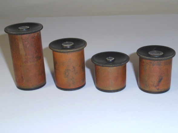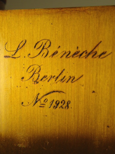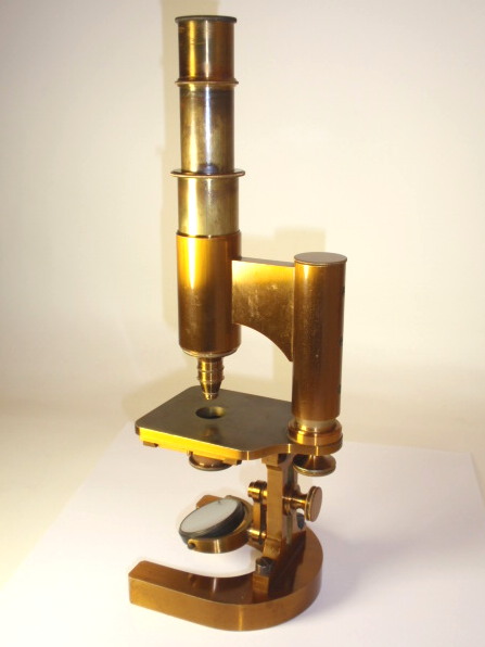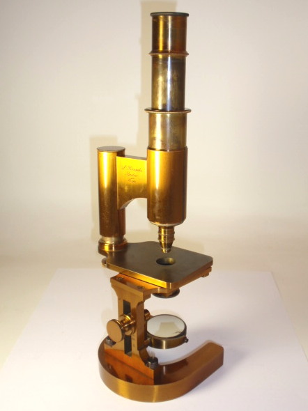 voll Messing, original zaponiert, ca. 1870 - 1875. Höhe 33 cm, 4 Okulare (Nr. 1, 3, 4 und 5), 1 zweiteiliges Objektiv, Grobeinstellung per Tubus, Feineinstellung hinter dem Tisch unter der Säule; das Mikroskop ist um die optische Achse drehbar; der Spiegel ist abfahrbar; Kondensorhülse mit Lochblendenkondensor in Schwalbenschwanzführung unter dem Tisch, schöne Signatur in Schreibschrift seitlich auf dem Steg zwischen Tubus und Säule "L. Bénèche Berlin No. 1.928"; mechanisch und optisch sehr gut, Erhaltung sehr gut (extrem schöne Zaponierung, Spitzenzustand!), schöner Kasten.