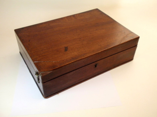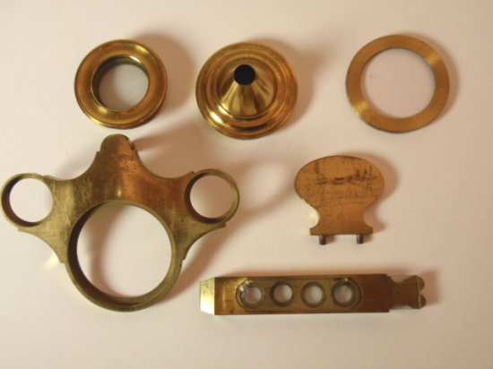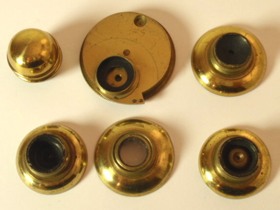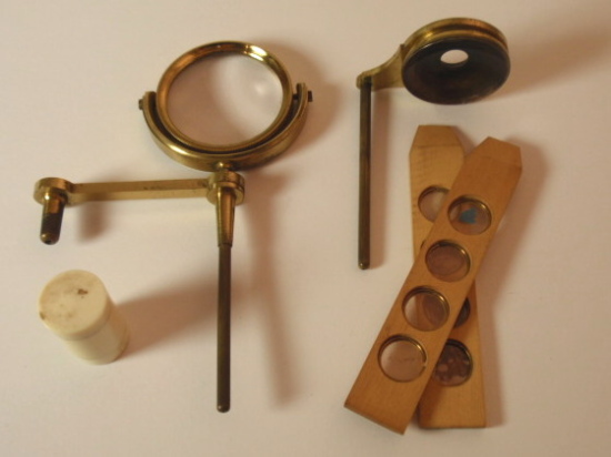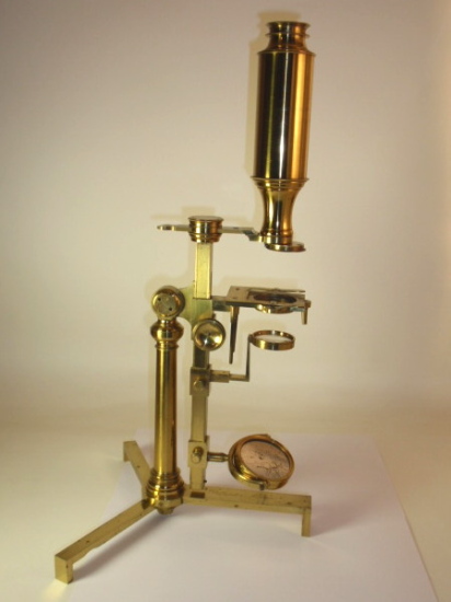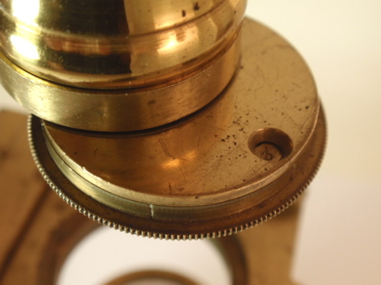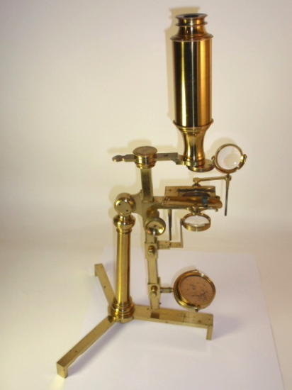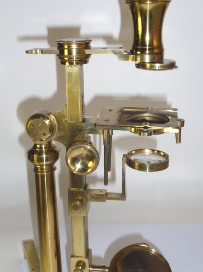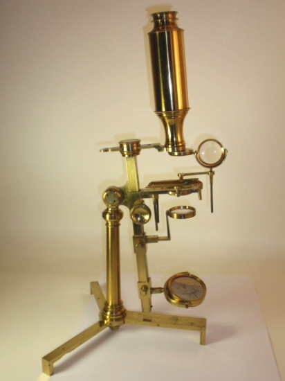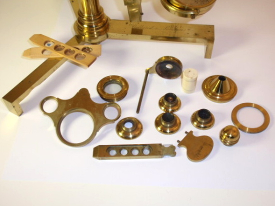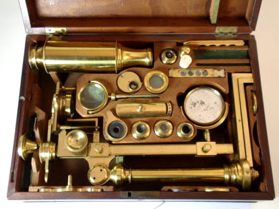 voll Messing, original zaponiert, ca. 1790 - 1810; Arbeitshöhe 55 cm (!); absolut komplett und hervorragend ausgestattet; 5 Objektive zur Benutzung als Einfach-Mikroskop (3 davon mit versilbertem Lieberkühn, in einem fehlt die Linse), eine Messingscheibe mit 6 nummerierten und drehbar gelagerten Objektiven (frühe Form eines Revolvers), 1 fest eingebautes Okular, Grobeinstellung und Feineinstellung durch einen Trieb, Kippstativ, Pinzette, Fischplatte, Blendenvorsatz, Life-box, Auflichtlupe, verschiebbare Kondensorlupe, Elfenbeindose für Sprengringe und Glimmerplättchen, schwenkbarer Tischaufsatz, 2 alte Holzpräparateträger, 1 Messingpräparateträger, kleines Werkzeug zum Feststellen des Kippgelenks; das ganze Zubehör ist vollkommen original! Signatur auf dem Fuß "Dollond London"; mechanisch und optisch sehr gut bis gut, Erhaltung sehr gut; die Zaponierung ist hervorragend erhalten; schöner Mahagoni-Kasten (Maße 34 x 23 x 11 cm). – Mikroskope dieser Art und Ausstattung tauchen kaum noch am Markt auf! A fine Jones-most-improved compound and simple microscope, original lacquered brass, early 19th century or before, coarse and fine adjustment via rack and pinion; complete with rotating 6-lens objective plate, 5 objectives for using as a simple microscope (3 with silver plated Lieberkühn, one without lens), tweezers, condenser lens, focusing magnifier, life-box, fish plate, cone for the substage, 2 wooden specimen slides, brass specimen slides, and some more accessories, signed on folding tripod "Dollond London"; the instrument disassembling into a fitted mahogany box with minor damage to exterior. Mechanical and optical very good, condition over all very good!