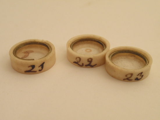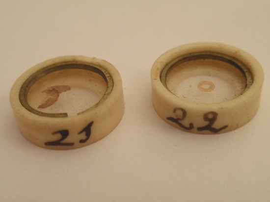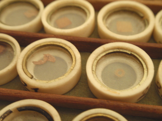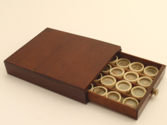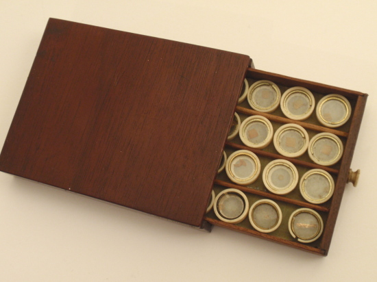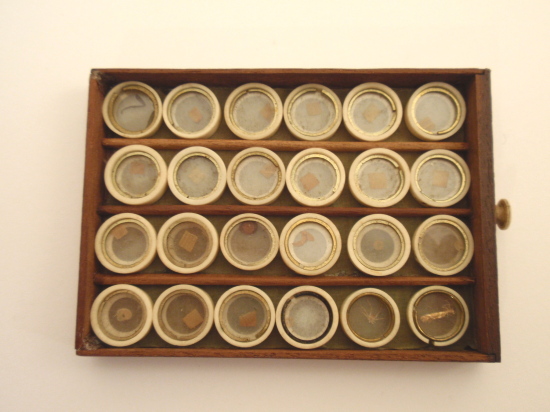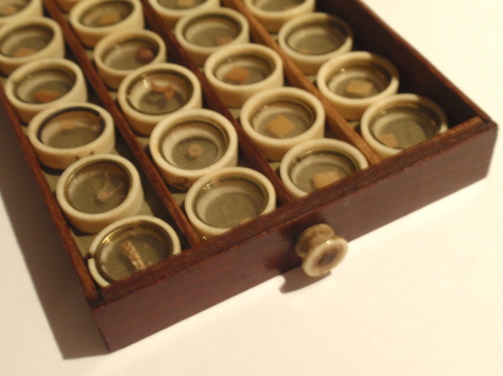 ca. 1790; Maße 8 x 6,3 x 1,5 cm, original Holzkasten mit Elfenbeingriff, Inhalt: 24 nummerierte Einzel-Präparate (Elfenbeinzellen); 4 Nummern sind abgegriffen und nicht mehr zu erkennen; vorhanden sind: 1 – 6, 8 – 10 12, 13, 16 – 19, 21 – 25 und die 4 unleserlichen Präparate; in jeder Elfenbeinzelle befindet sich ein Präparat; erstaunlich guter Zustand von Kasten und Präparaten. Eine absolute Rarität!