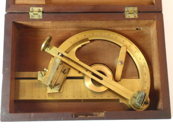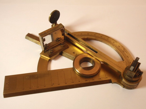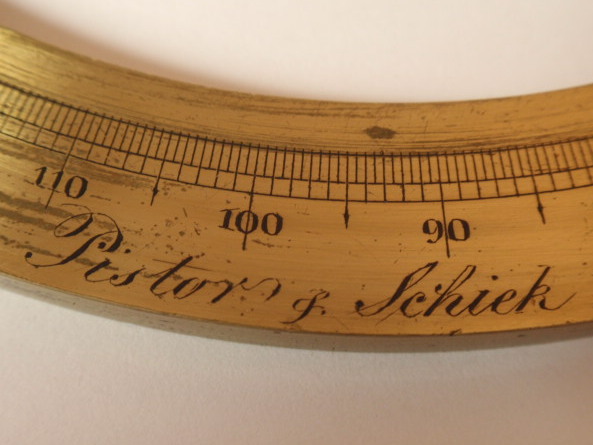 ca. 1824 - 1830, voll Messing, original zaponiert, Länge 15 cm, Durchmesser des Halbkreises 11,5 cm, mit Diopter und 2 Spiegeln; Signatur auf dem Halbkreis "Pistor & Schiek Berlin No. 123"; voll funktionsfähig, guter bis sehr guter Zustand, schöner Originalkasten (Maße 17 x 11 x 4,5 cm). Pistor stellte seit 1804 in eigener Werkstatt geodätische und astronomische Instrumente sowie Mikroskope her und verband sich 1824 mit Schiek als Werkstattleiter. 1836 trennten sich Pistor und Schiek wieder. Schiek fertigte in seiner Firma optische und andere Instrumente, während Pistor zunächst mit Hirschmann sen. zusammenarbeitete. Später nahm er seinen Stiefsohn und seinen Schwiegersohn Carl Martins in die Firma auf: "Pistor & Martins". - Ein frühes und seltenes Instrument eines berühmten Berliner Herstellers!