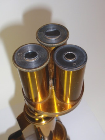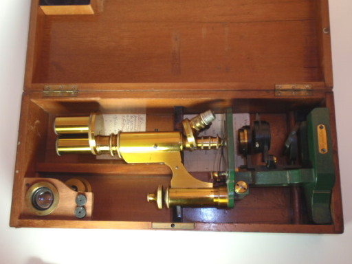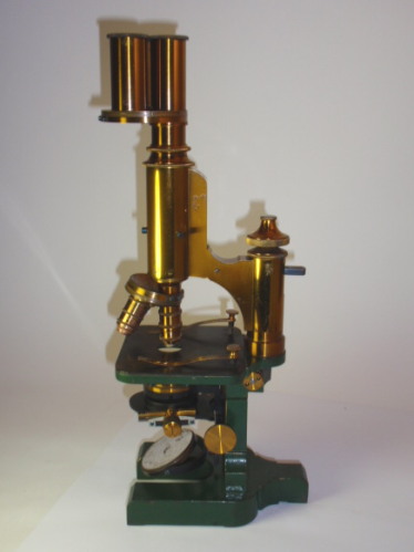 Messing mit grünem Eisenfuß, original zaponiert und grün lackiert, ca. 1870, Höhe 38 cm, 3 Okulare (Nr. 1, 3, 4 – Nr. 4 stammt von Leitz), 3 Objektive (4, 8 und 1 Ölimmersion), 3fach-Objektivrevolver, 3fach-Okularrevolver, ohne Grobeinstellung, ungewöhnliche Feineinstellung durch die Rändelschraube und mit Hilfe des Hebels hinter der Säule, Kippstativ, abfahrbarer und schwenkbarer Kondensor, auf dem Messingschild am Fuß steht "ges. geschützt"; obwohl nicht signiert, stammt das Instrument aus der Werkstatt von Edmund Meester aus Berlin; mechanisch und optisch gut bis sehr gut, Erhaltung sehr gut, schöner Kasten.