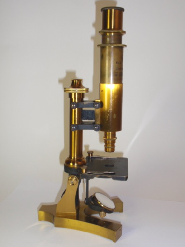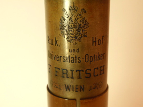 voll Messing, original zaponiert, ca. 1870 - 1880, Höhe 26 cm, 1 Okular, 1 signiertes Objektiv, Grobeinstellung durch Verschieben des Tubus, Feineinstellung, Kippstativ, Lochblendenscheibe unter dem Tisch, Signatur auf dem Tubus "K. u. k. Hof und Universitäts-Optiker F Fritsch Wien"; mechanisch und optisch sehr gut, Erhaltung gut bis sehr gut, kein Kasten.