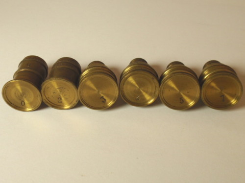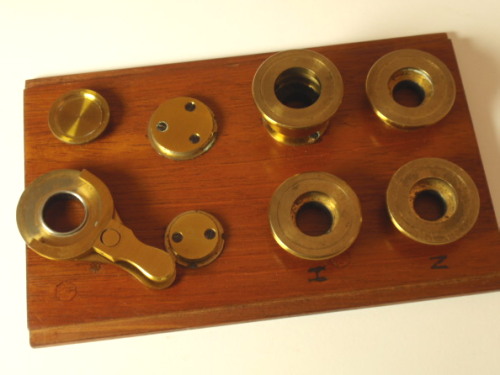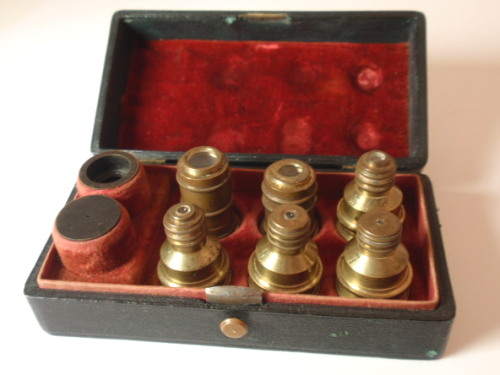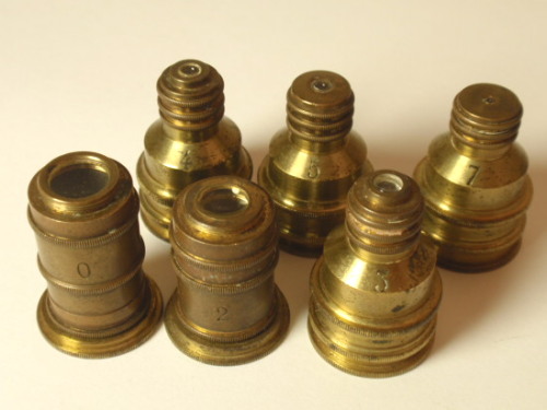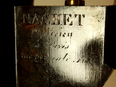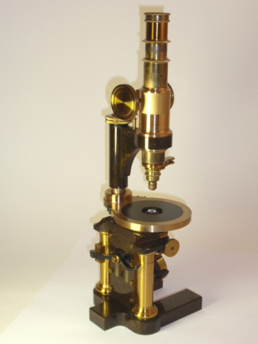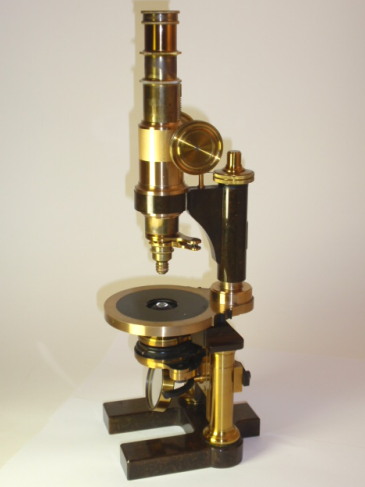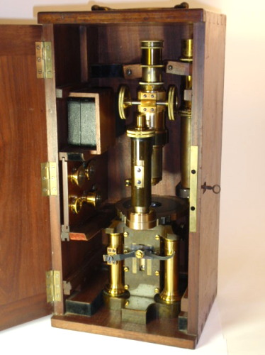 voll Messing, teilweise - wie der Fuß - changierend bräunlich original lackiert, ansonsten original zaponiert, ca. 1853, Höhe 35 cm, 1 Okular (Nr. 2 ), 6 Objektive (Nr. 0, 2, 3, 4, 5 und 7) in einem extra kleinen Lederkasten, alle Objektive haben nummerierte Staubschutzkappen; Schellwechseleinrichtung für die Objektive, Grobeinstellung, Feineinstellung mit Mikrometereinteilung, abfahrbarer und schwenkbarer Kondensor (der Kondensor wird mit Hilfe des großen Bügels hinter den beiden Säulen auf und ab bewegt); das Mikroskop ist um die optische Achse drehbar; sehr kleine Signatur auf dem Steg zwischen Tubus und Säule oben "NACHET Opticien a Paris rue Serpente 16"; zusätzlich gibt es einen weiteren Staubschutzdeckel und 4 auf ein Brett geschraubte Gewinde, die für die Schnellwechseleinrichtung der Objektive vorgesehen sind; es sind auch andere Objektive als die mit Nachet-Gewinde verwendbar; im Kasten befindet sich ein zweiter Tubus; auf ihn passen die Objektive; allerdings bleibt unklar, wie der Tubus bei diesem Gerät Verwendung findet; mechanisch und optisch gut bis sehr gut, Erhaltung gut bis sehr gut, Kasten.