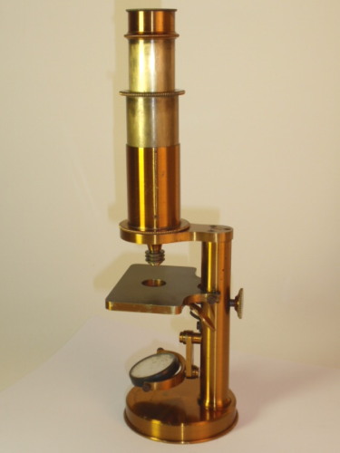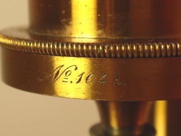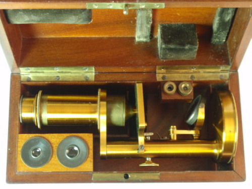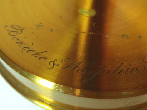 voll Messing, original zaponiert, ca. 1855, Höhe 23 cm; 2 aus 3 Segmenten bestehende Objektive, 3 Okulare (1, 2 und 4, schwer zu lesen), Grobeinstellung durch Verschieben des Tubus, Feineinstellung durch asymmetrisches Kippen des Tisches mit der Rändelschraube hinter der Säule; 2fach verstellbare Lochblende, schöne Signatur auf dem runden Fuß "Bénèche & Wasserlein, Berlin", auf dem Tubusträger steht die Nummer "No. 1.043"; mechanisch und optisch sehr gut, Erhaltung sehr gut (ausgezeichnete gold-gelbe Zaponierung), extrem schöner Kasten! – Charles Louis Bénèche und Rudolph Wasserlein haben zwischen 1850 und 1860 in Berlin gemeinsam Mikroskope hergestellt. Nach Auflösung ihrer gemeinsamen Firma fertigen beide Beteiligte unter ihrem eigenen Namen weiter Mikroskope und andere optische Instrumente.