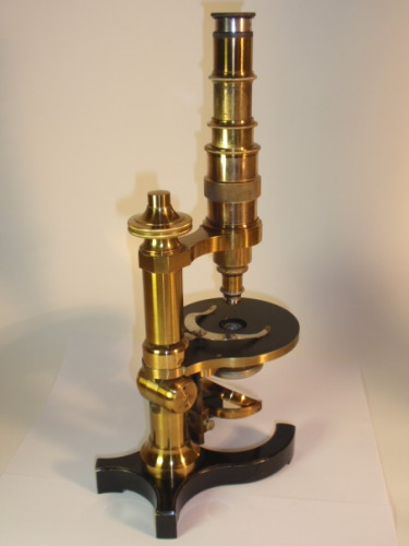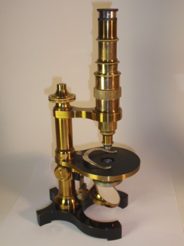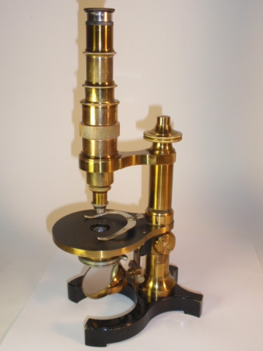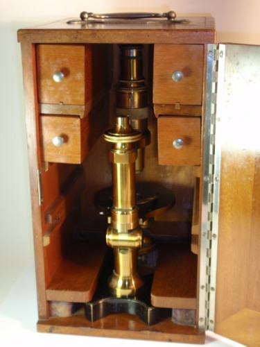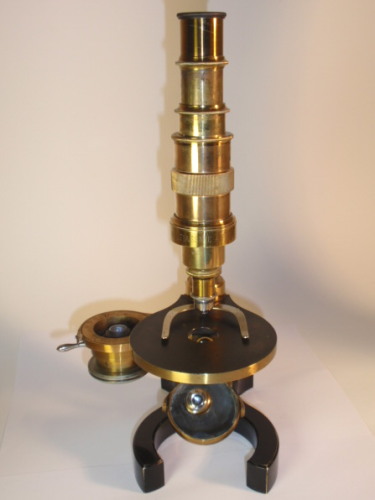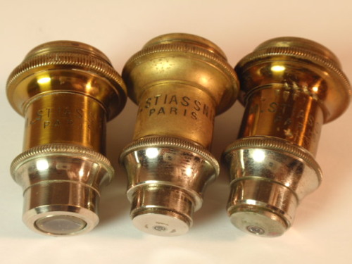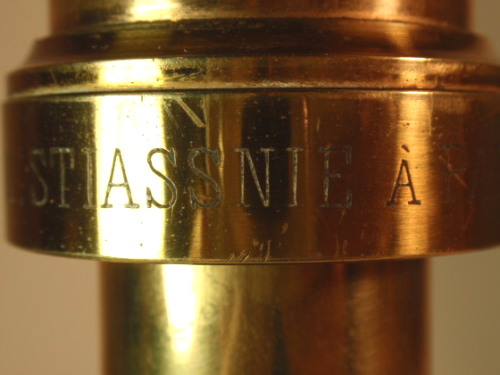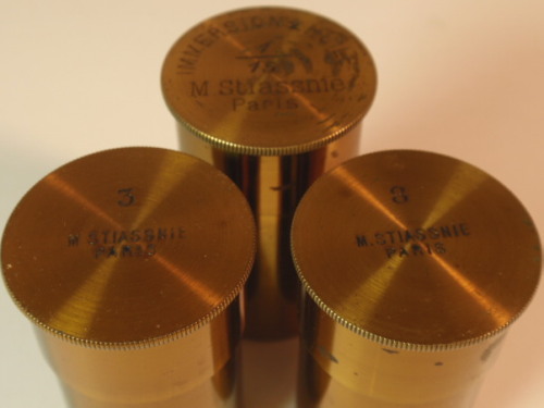 vollMessing, geschwärzter Fuß, original zaponiert und geschwärzt, ca. 1885, Höhe 33 cm, 3 signierte Objektive (Nr. 3, 8 und 1/5 Ölimmersion) in ebenfalls signierten Messingdosen, 3 Kompensationsokulare (Nr. 6, 9 und 18), Grobeinstellung durch den gerändelten – oberen - Tubusring; durch diese in dieser Zeit seltene Art der Fokussierung fährt der Tubus zoomartig auf und ab; Feineinstellung, abfahrbarer und schwenkbarer Kondensor, Kippstativ, Signatur auf dem unteren Tubusring "M. Stassnie à Paris"; mechanisch und optisch gut bis sehr gut, Erhaltung gut; schöner Kasten mit der eingestanzten Nummer "9.573". - Maurice Stiassnie war der Schwiegersohn von M. C. Verick und übernahm dessen Werkstatt in Paris im Jahr 1882.