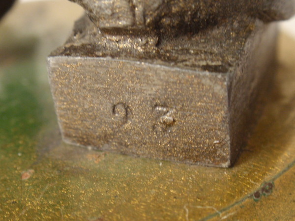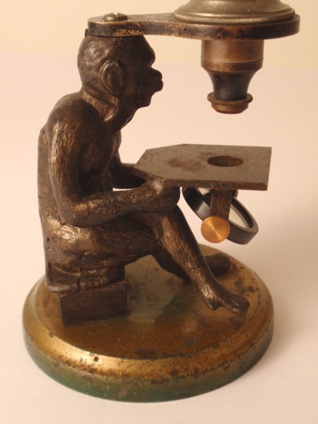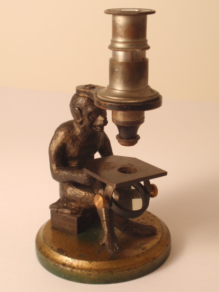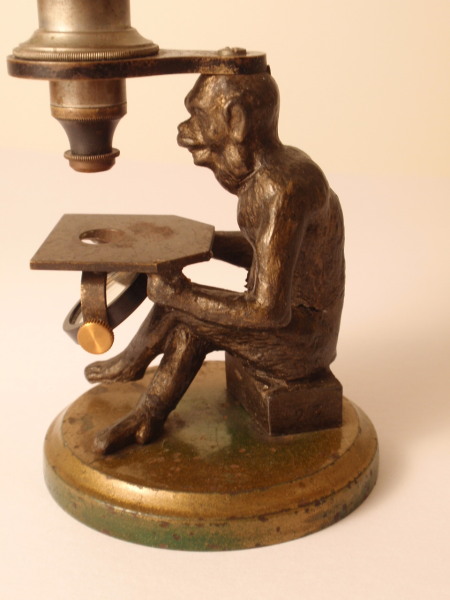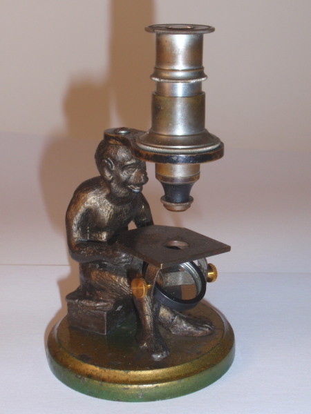 aus Bronze, Stahl und vernickeltem Messing, original Zustand, ca. 1871 – 1880 (im Billings wird ein früheres Datum genannt). "Arbeits"-Höhe 10,6 cm; 1 Okular, 1 Objektiv, Grob- und Feineinstellung durch Verschieben des Tubus; der Hersteller ist Moreau aus Paris, auch wenn das Gerät nicht signiert ist; unter dem grün-gold lackiertem Sockel (Durchmesser 6,2 cm) befindet sich die Nummer 123; auf dem Bronzesitz des Affen befindet sich die Nummer 23; die Ziffer 1 ist dabei weggelassen worden wie bei anderen Mikroskopen dieser Art auch; gleiches Instrument wie in Billings, S. 46 (Fig. 86); mechanisch und optisch gut, Erhaltung gut (der vernickelte Tubus ist etwas abgegriffen), kein Kasten. - Es handelt sich um eine Karikatur auf die Darwinsche Theorie zur Abstammung des Menschen (1871); böse Zungen behaupteten, der Kopf des Affen ähnele dem von Darwin (1809 – 1882). - Der kleine Hersteller Moreau fertigte dieses Modell ab 1871 nur wenige Jahre lang. Die bisher größte bekannte Baunummer ist 158. Es existieren vermutlich nur noch 2 bis 3 Dutzend dieser Mikroskope. Small and rare 19th century microscope – "monkey microscope", ca. 1871 – 1880, made of steel, brass and .nickel; high 4. ¼", focussing the sliding body tube by hand, original condition, the maker is Moreau of Paris, no signature but a number underneath "123", on the seat another number "23", it is known from other monkey microscopes that the number of the seat misses the "1" of one hundred; similar instrument in Billings, Page 46 (Fig. 86); mechanical and optical good, condition good, but the body tube is a little bit worn, no box., The small maker, Moreau, produced this type of microscope since 1871 for some years only. The highest known number of 13 known microscopes is 158.