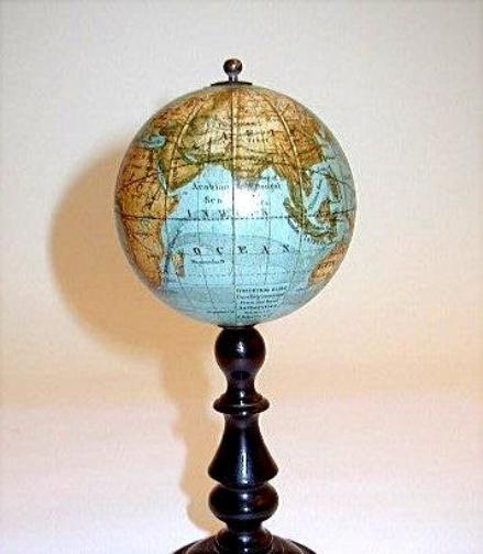 ca. 1850 - 1860, sehr schöner schwarz lackierter Holzfuß (7 cm Durchmesser), Höhe 18 cm, Kugel aus mit Papier beklebter Pappe (Durchmesser ca. 8 cm); Herstellerangabe "Terrestial Globe Carefully compiled from the best Authorities Berlin, E. Schotte & c. Lith. of P. Mohrir"; Zustand von Fuß und Holzteilen sehr gut, von. Kugel ( klare und kräftige Farben ) gut bis sehr gut. Fine early German terrestrial globe fort he English market, ca. 1850 - 1860, very good and original condition. Turned lacquered black wooden foot (diameter 7 cm), height of the globe 18 cm, diameter of the globe 8 cm; 12 gores and 2 polar calottes; the globe is in a mint overall condition; clear and bright colours.