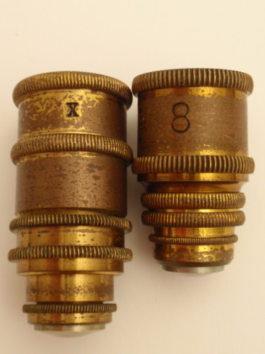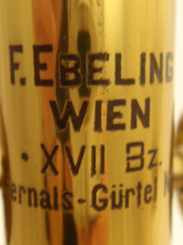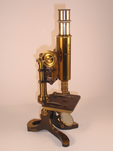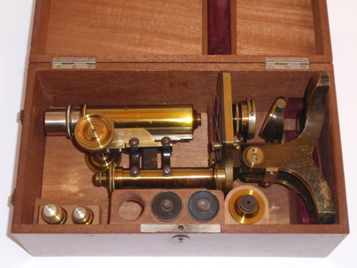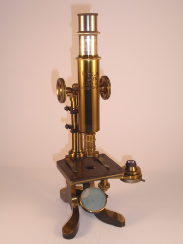voll Messing, original zaponiert, ca. 1880. Höhe 30 cm, 2 Okulare (Nr. 3 und 4), 2 Objektive (Nr. 9 und X), Grobeinstellung, Feineinstellung durch Parallelogramm-Mechanik, abfahrbarer und schwenkbarer Kondensor, zusätzlicher Lochblendeneinsatz, Kippstativ, Signatur auf dem Tubus "F. Ebeling Wien XVII Bz. Hernals-Gürtel No. 2"; mechanisch und optisch gut bis sehr gut, Erhaltung gut; schöner Kasten.