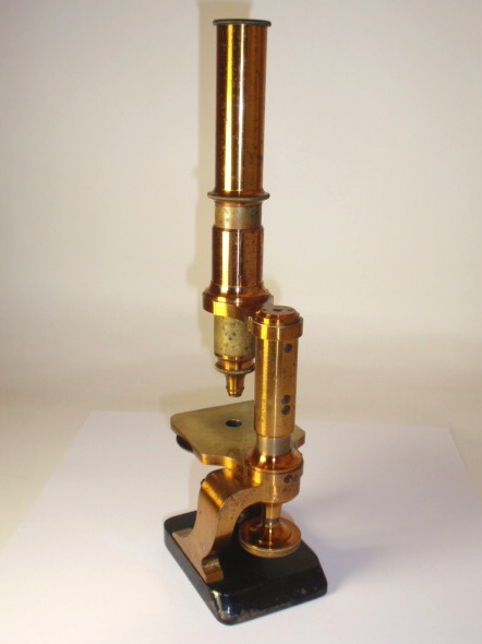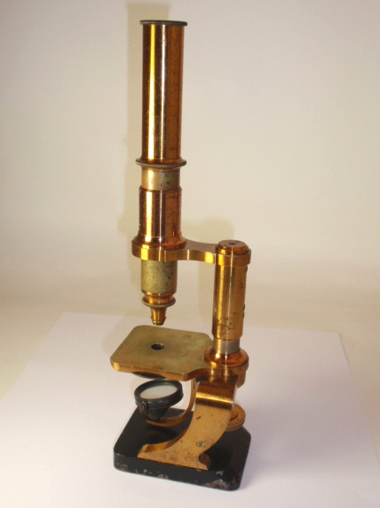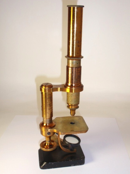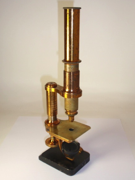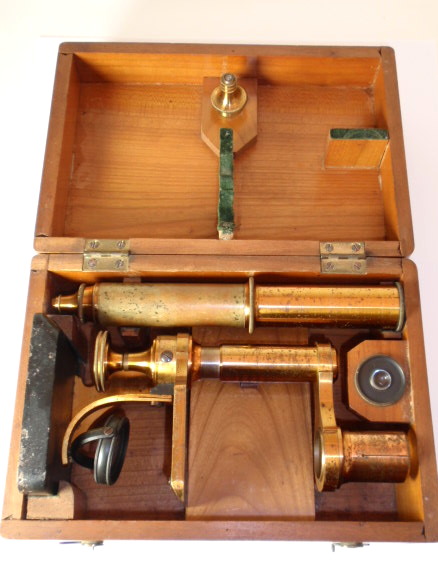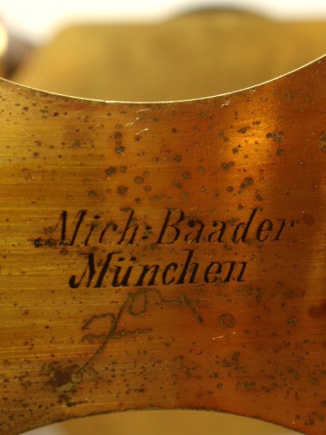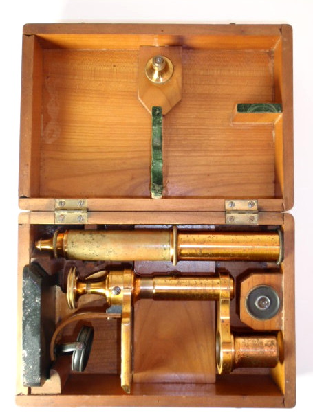 Messing mit geschwärztem Eisenfuß, ansonsten original zaponiert, ca. 1845 - 1855, Höhe 29 cm, 2 Okulare, 2 Objektive; Grobeinstellung per Tubus, Feineinstellung, Lochblendenscheibe unter dem Tisch, Signatur auf dem Steg zum Tubus "Mich. Baader München"; mechanisch und optisch gut, Erhaltung gut bis befriedigend (die Zaponierung ist in sich etwas fleckig); schöner Kasten.