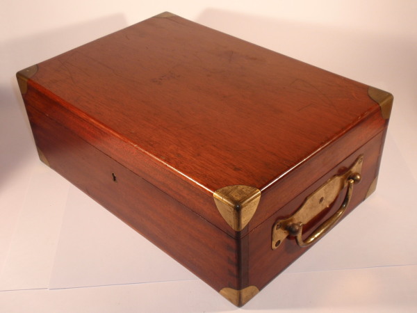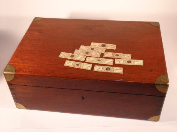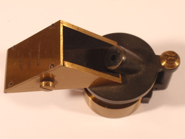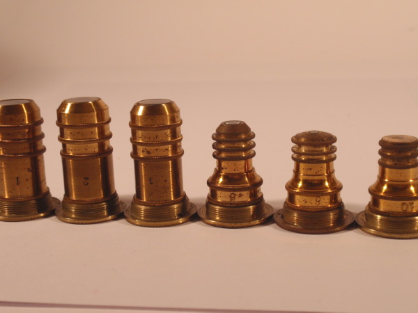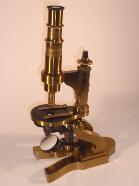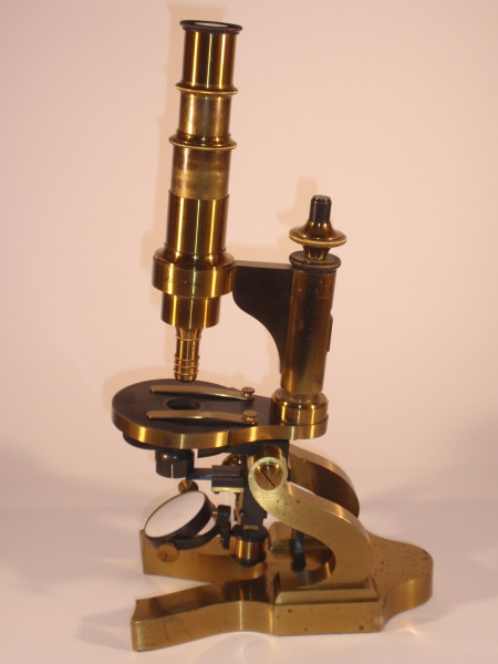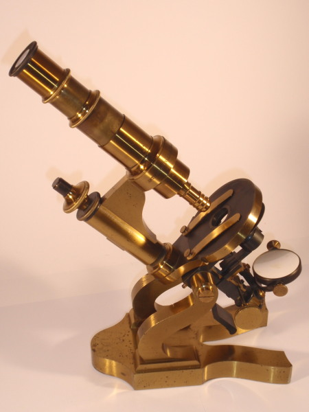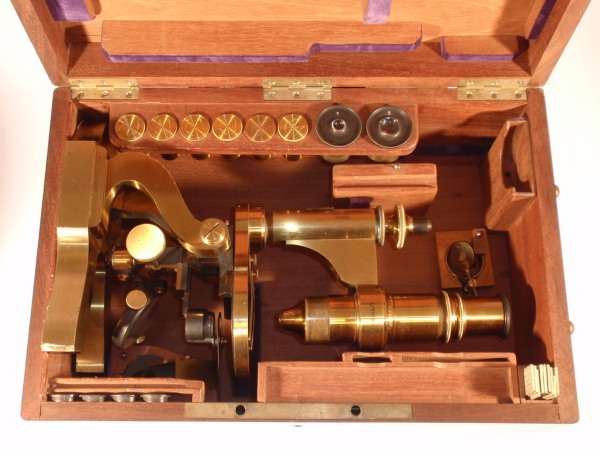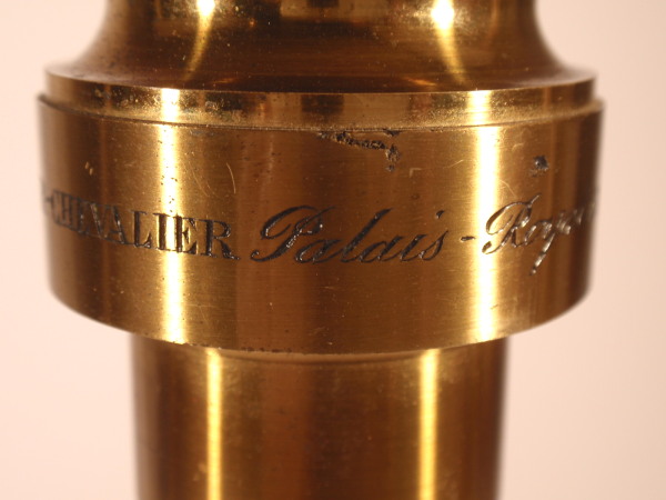 vollMessing, original zaponiert, ca. 1875, Höhe 33 cm; 6 nummerierte Objektive (Nr. 1, 2, 3, 5, 8 und 10) in jeweils signierten Messingdosen ("Arthur Chevalier Palais Royal"); 3 Okulare (Nr. 1, 2 und 3; beim letzten fehlt eine Linse), Grobeinstellung durch Verschieben des Tubus, Feineinstellung; das Mikroskop ist um die optische Achse drehbar; Lochblendenscheibe und ein Lochblendenkondensor in Schwalben- schwanzführung zum Hochfahren unter dem Tisch, 4 Lochblendeneinsätze; Spiegel mit mehrgliedrigem Arm; zusätzlich 2 Camera Lucidas (eine mit der Signatur "Arthur Chevalier Palais-Royal"), 9 kleine Glaspräparate von "Jh. Bourgogne"; schöne Signatur auf dem Tubusring "Arthur Chevalier Palais-Royal 158, Paris"; mechanisch und optisch sehr gut, Erhaltung gut bis sehr gut, sehr schöner Kasten mit 8 Messingecken und Messinggriff.