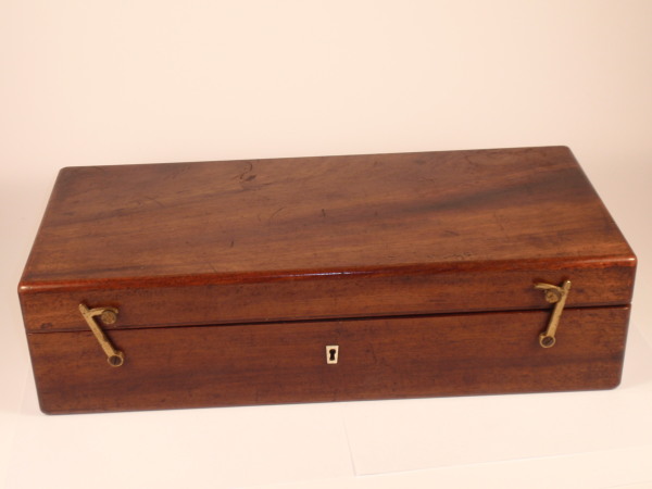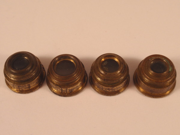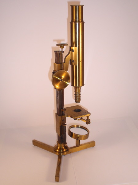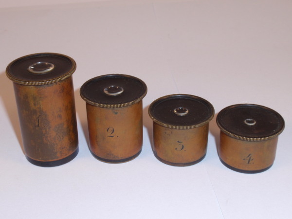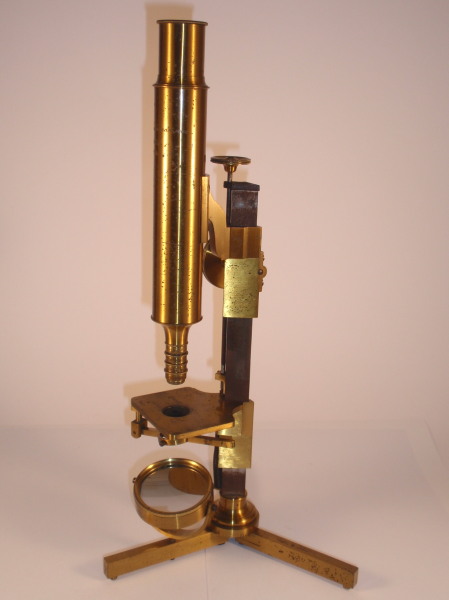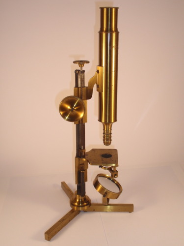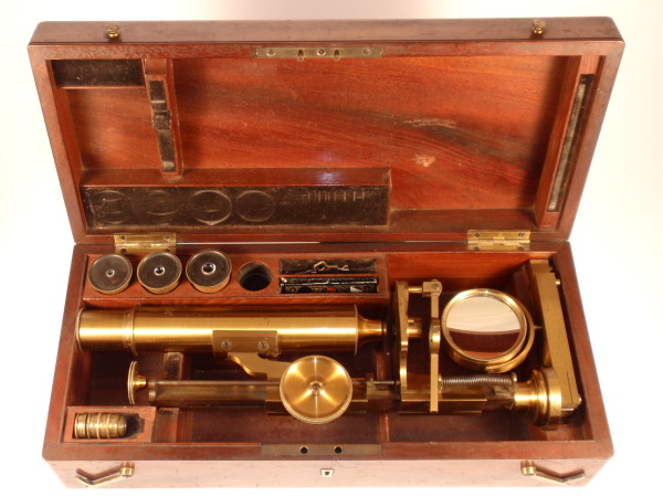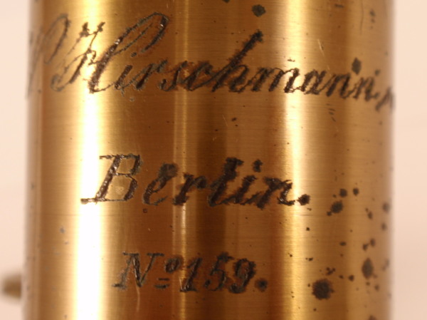 voll Messing, original zaponiert, ca. 1835 - 1845; Höhe 37 cm; 4 nummerierte Okulare (1, 2, 3 und 4), mit 4 miteinander verschraubbaren und nummerierten Objektiven (Nr. 1, 2, 3 und 4); Grobeinstellung per Zahn und Trieb über die Dreikantsäule des Stativs; die Feineinstellung hebt den Tisch über die lange Rändelschraube parallel zur Dreikantsäule; per Hand verstellbare Kondensorhülse (ohne Lochblenden) unter dem Tisch; 2 Glaspräparate der Zeit; typische Signatur auf dem Tubus "W. Hirschmann sen. Berlin. No. 159"; mechanisch sehr gut, optisch gut, Erhaltung befriedigend bis gut (auf dem Tubus befinden sich hunderte von dunklen Punkten im Messing, die Objektive sind teilweise abgegriffen). - Sehr schöner Kasten (Maße 38 x 16 x 9 cm). – Wilhelm Hirschmann (ca. 1780 – 1847), arbeitete zunächst für F. W. Schieck und hatte seit 1826 eine eigene Werkstatt, in der er Mikroskope fertigte. Damit ist die verblüffende Ähnlichkeit der Produkte dieses kleinen Herstellers mit den Mikroskopen Schiecks geklärt.