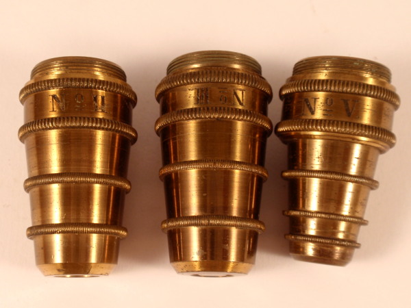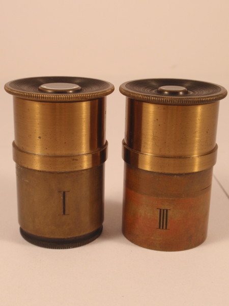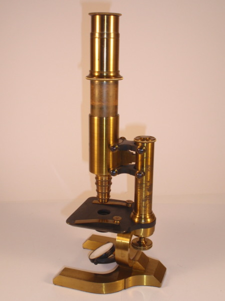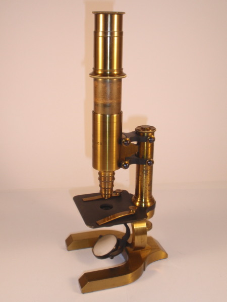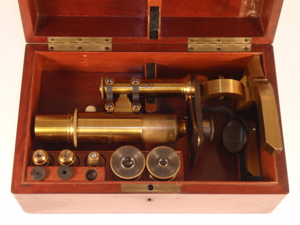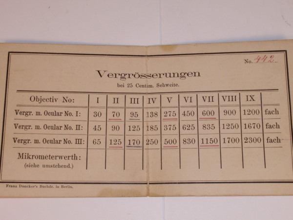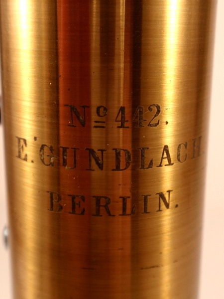 vollMessing, original zaponiert, ca. 1869 - 1870, Höhe 28 cm; 3 nummerierte Objektive (Nr. II, III und V), 2 Okulare (Nr. I und III), Grobeinstellung durch Verschieben des Tubus, Feineinstellung mit der Rändelschraube unter der Stativsäule; Lochblendeneinsatz mit 2 Lochblenden unter dem Tisch; mit originaler nummerierter Vergrößerungstabelle, die die vorhandene optische Ausstattung ausweist; Signatur auf dem Außentubus "E. Gundlach Berlin No. 442."; mechanisch und optisch gut bis sehr gut, Erhaltung gut bis sehr gut, schöner Kasten. – Ein recht seltenes Mikroskop dieses Herstellers, der nur knapp über 1.000 Mikroskope mit seiner Signatur fertigte!