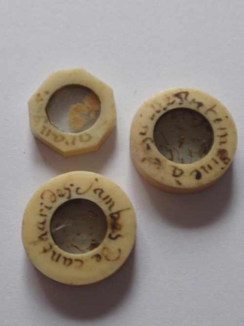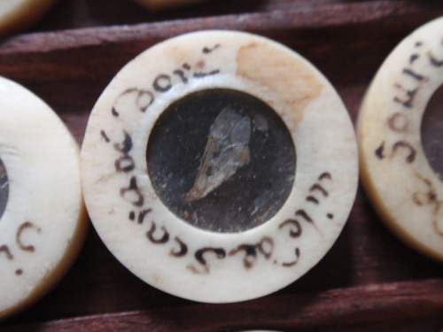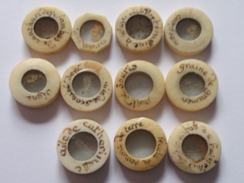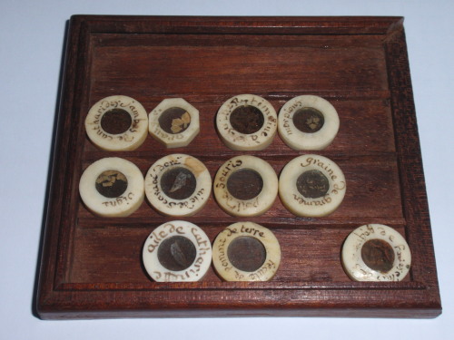 Maße 8,5 x 7,5 x 1,2 cm, original Holzkasten, Inhalt: 11 in französischer Sprache beschriftete Einzel-Präparate in einem Elfenbeinring (Durchmesser der Elfenbeinzellen 1,5 cm); einige sind schwer lesbar; in jeder Elfenbeinzelle befindet sich ein Präparat; eine Präparatezelle hat eine achteckige Form; erstaunlich guter Zustand von Kasten und Präparaten. Eine absolute Rarität!
