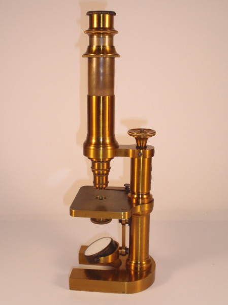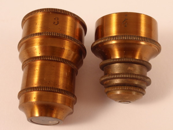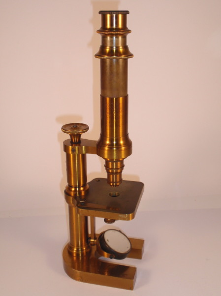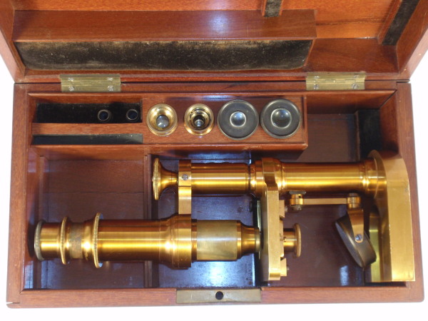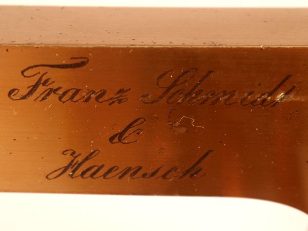 voll Messing, original zaponiert, ca. 1865 - 1870, Höhe 29 cm, 3 Okulare (Nr. 1, 2 und 3), 2 Objektive (Nr. 3 und 4); Grobeinstellung durch Verschieben des Tubus, Feineinstellung, Lochblendenhülse in Schwalbenschwanzführung unter dem Tisch, 2 Lochblenden, Signatur auf dem Fuß "Franz Schmidt & Haensch Berlin No. 291"; mechanisch und optisch gut bis sehr gut, Erhaltung gut bis sehr gut, schöner mit braunem Samt ausgelegter Kasten. - 1864 schlossen sich die beiden Hersteller zusammen, nachdem jeder vorher schon eine Werkstatt unterhielt. Ein seltenes Mikroskop eines Berliner Herstellers, der noch heute Refraktometer und Polarimeter herstellt.