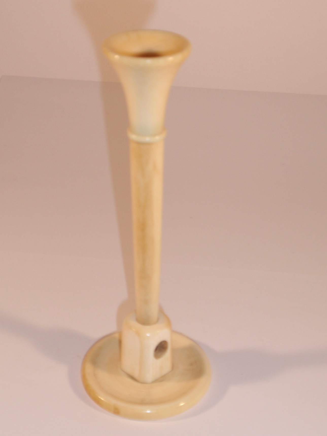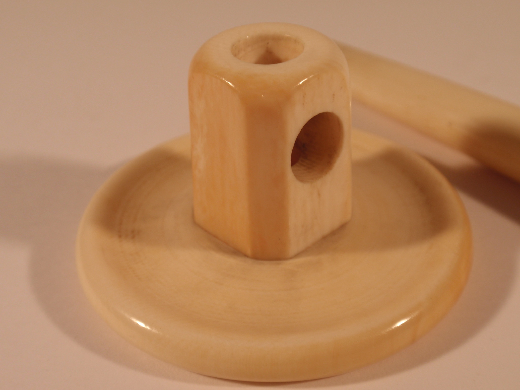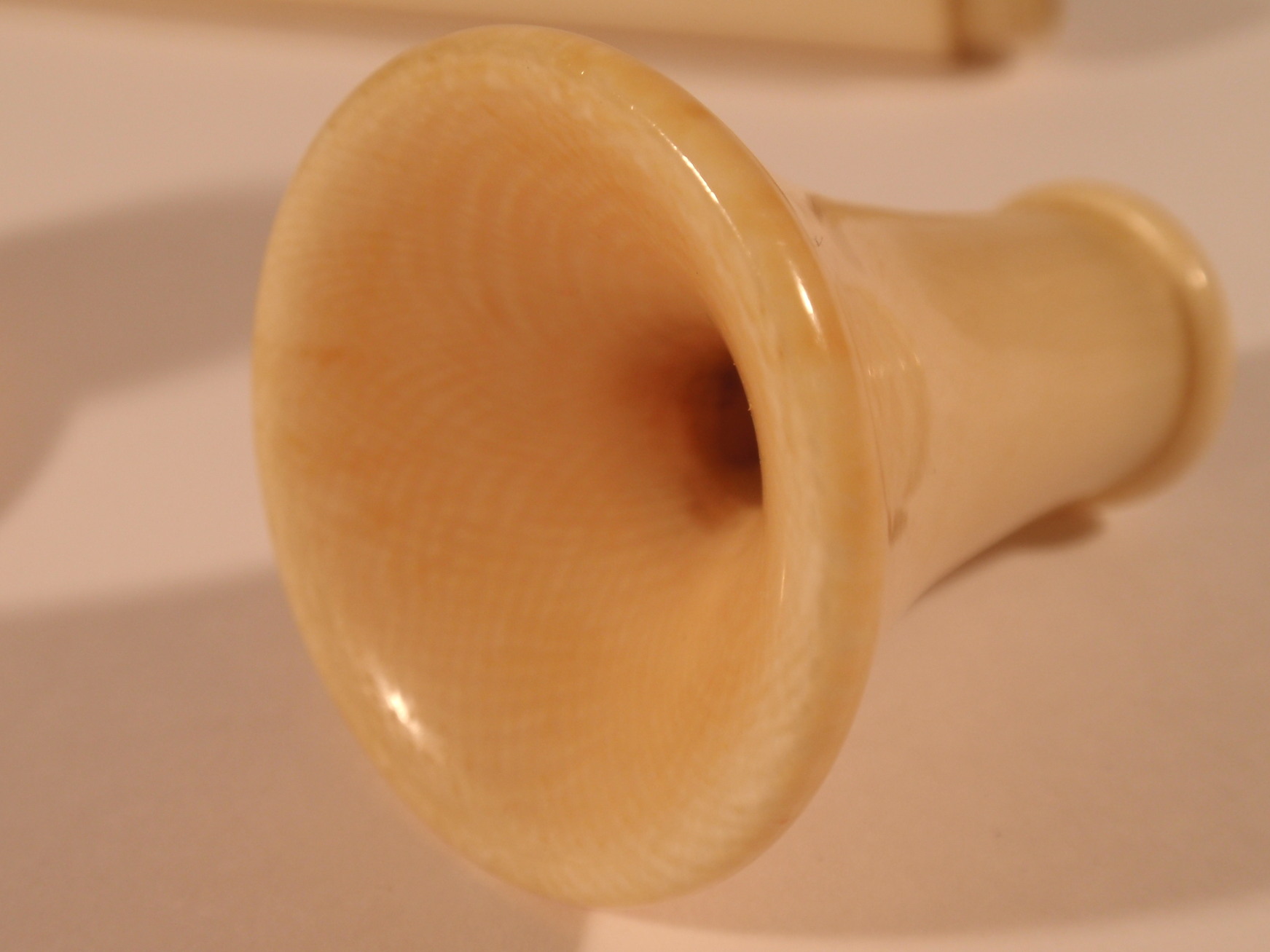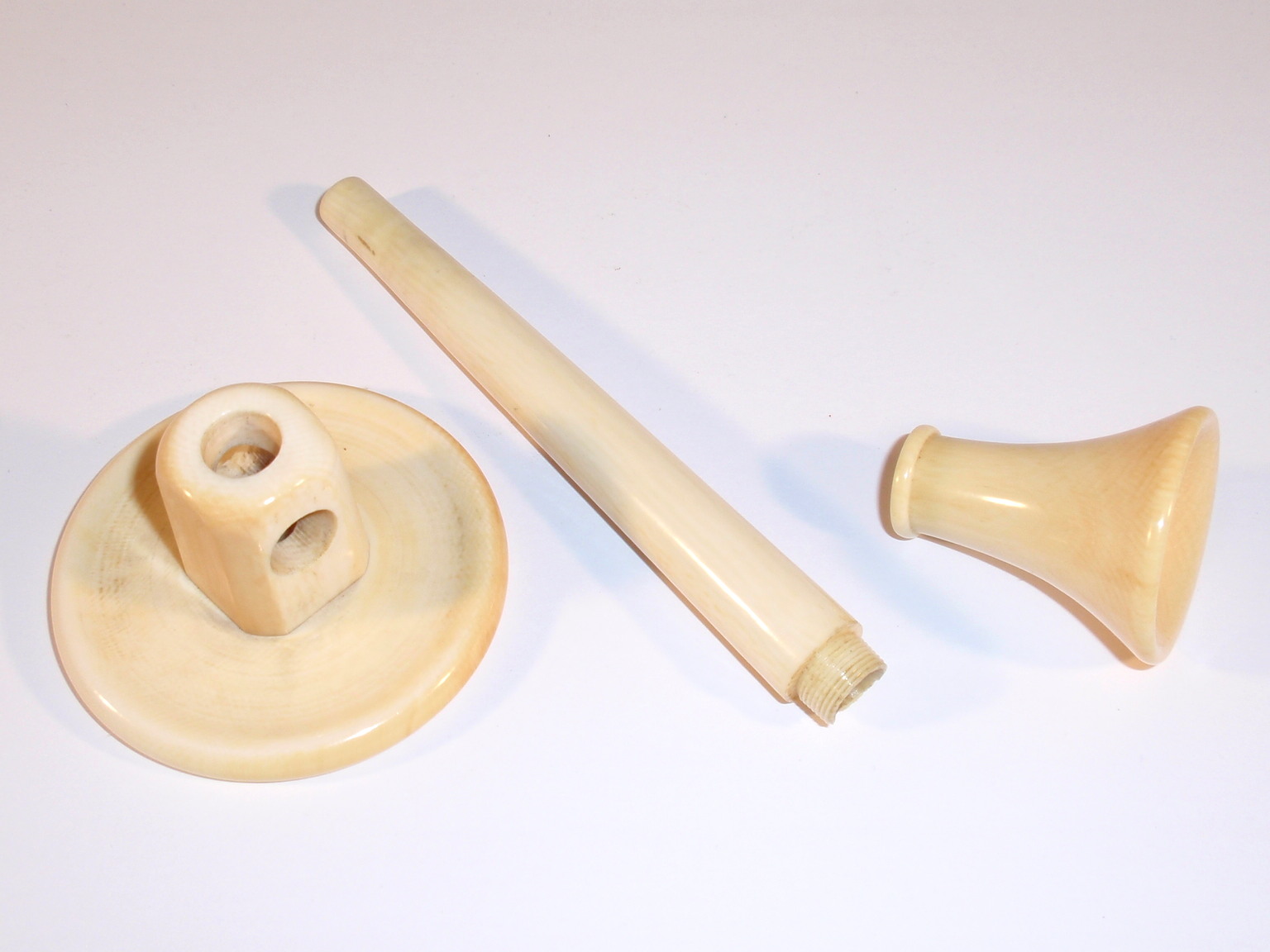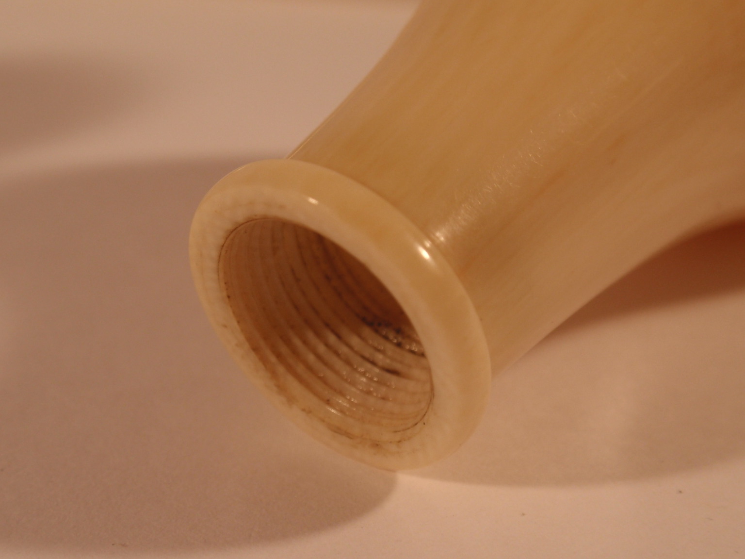 ca. 1880, 3 Teile, Länge 15 cm; größter Durchmesser 5,5 cm, vollkommen aus Elfenbein; guter bis sehr guter Zustand (ein Gewinde im Elfenbein ist leicht beschädigt; die Funktion wird dadurch nicht eingeschränkt); in dieser Ausführung eine Rarität!