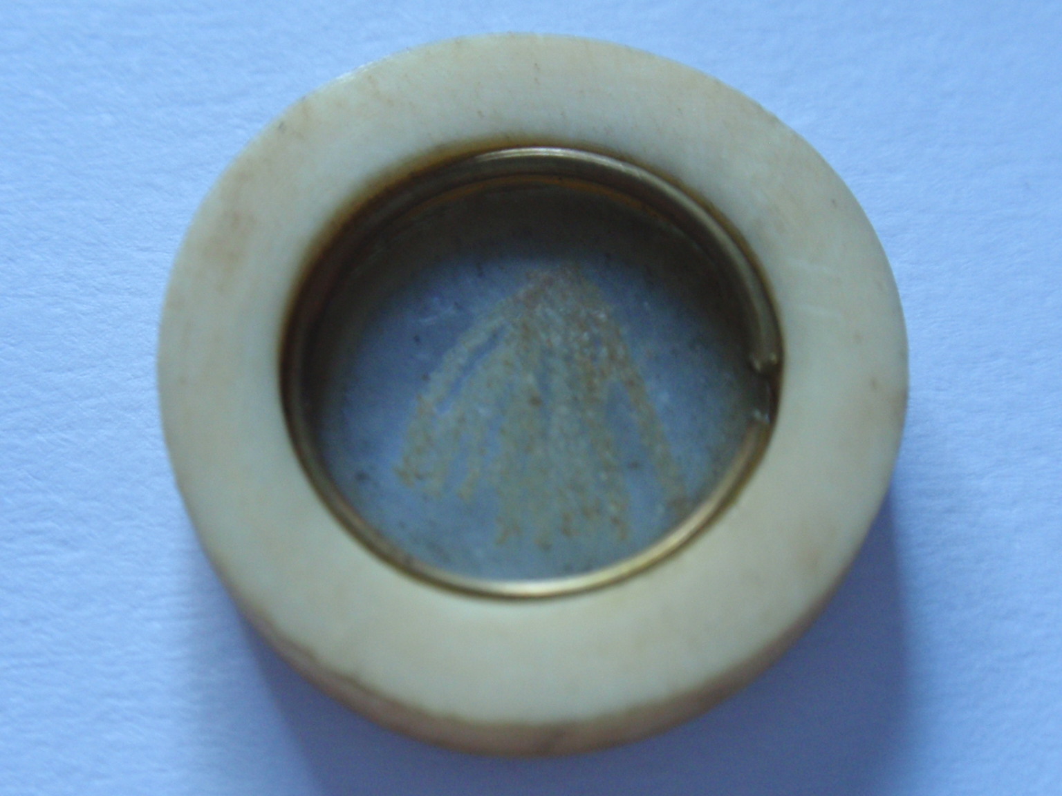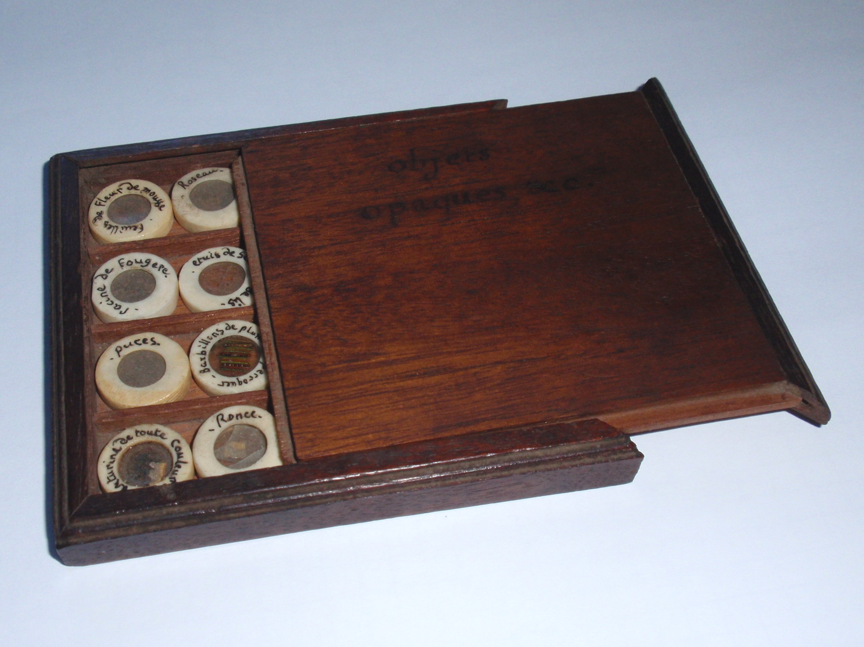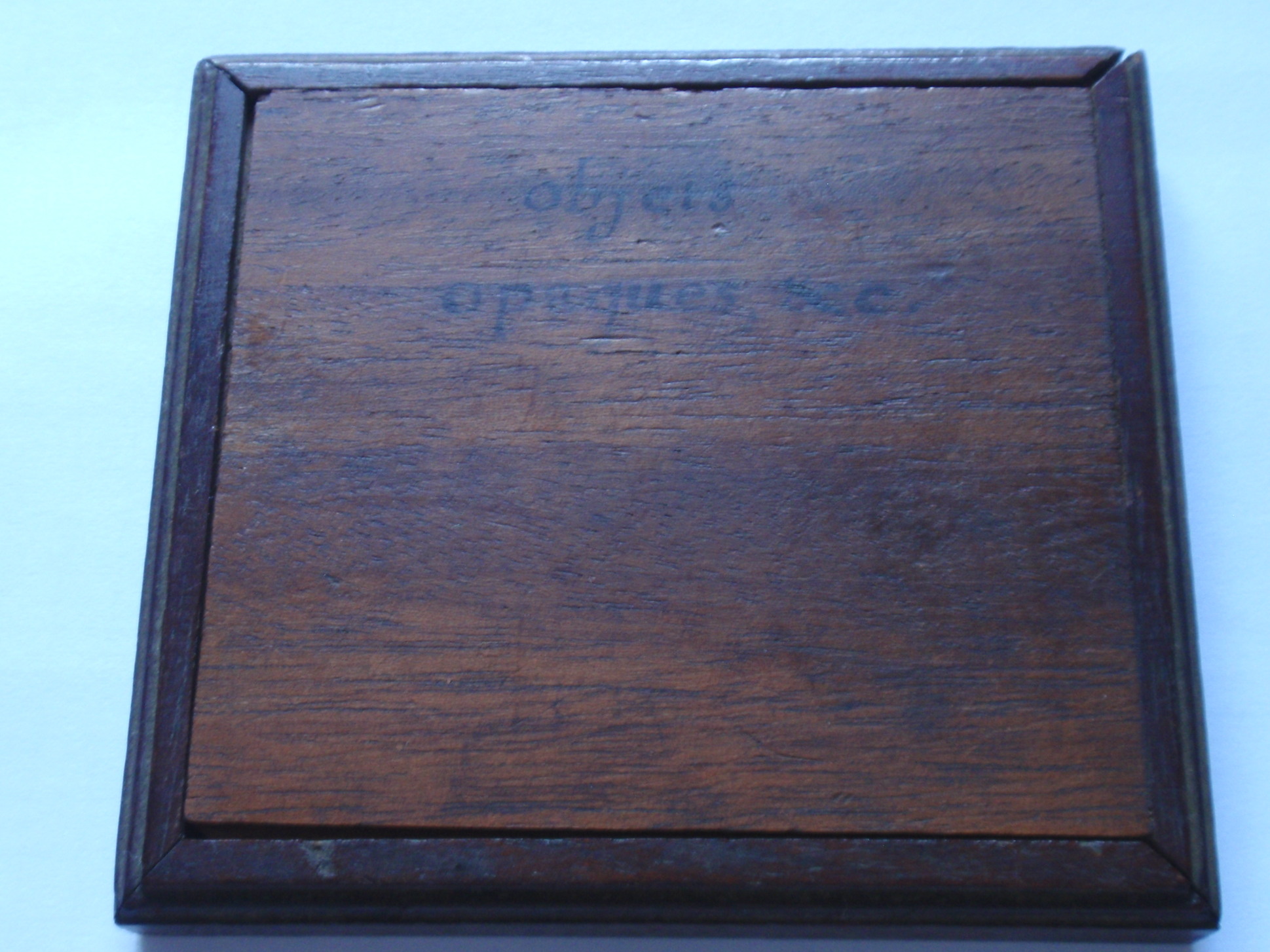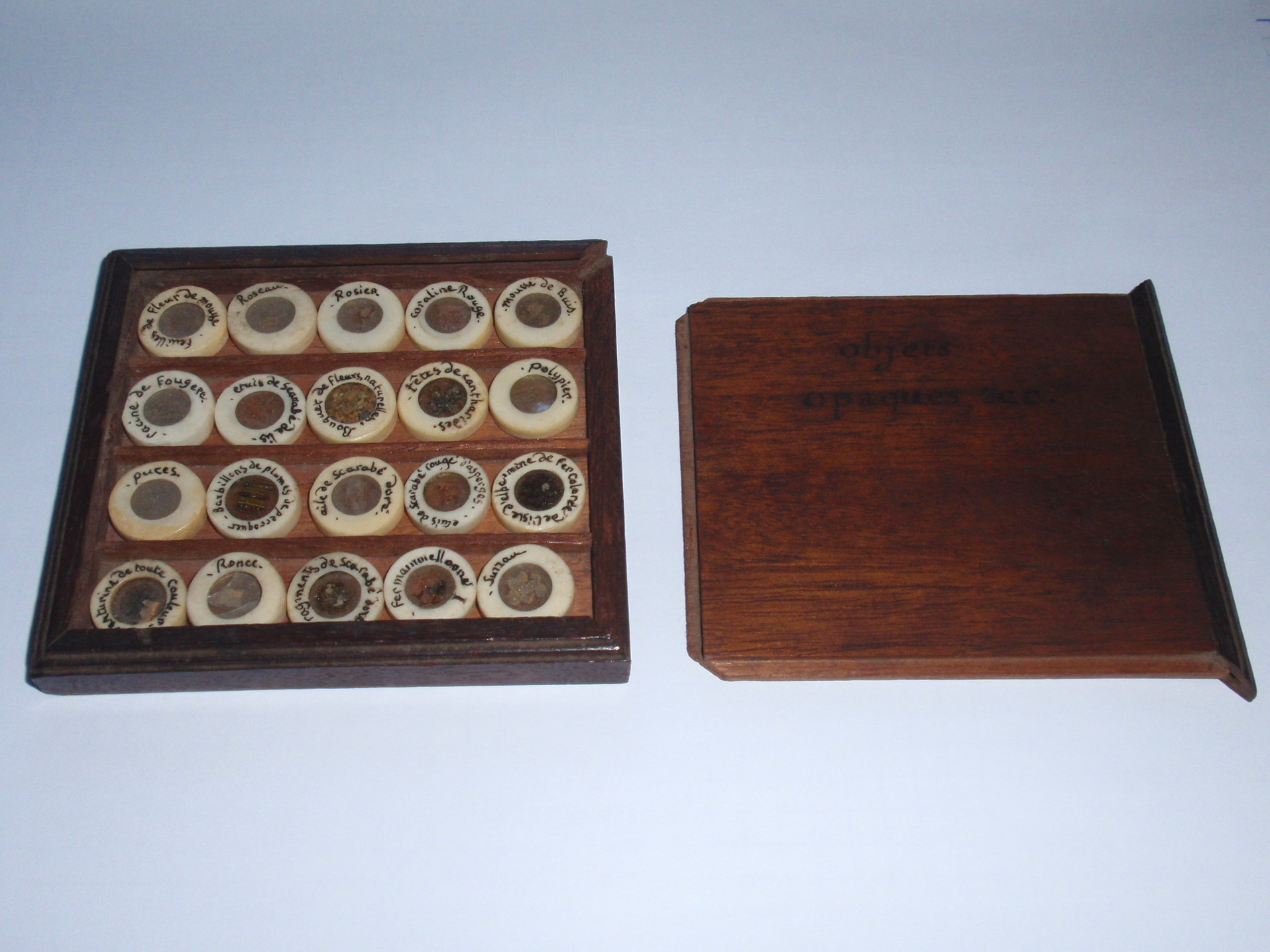 Niederlande, ca. 1790; Maße 8,5 x 8 x 1,0 cm, original Holzkasten, Inhalt: 20 in französischer Sprache beschriftete Einzel-Präparate in dem typischen Elfenbeinring (Durchmesser der Elfenbeinzellen 1,4 bis 1,5 cm); dabei sind botanische, zoologische und mineralogische Präparate (darunter farbenprächtige Präparate von Papageienfedern und einige aus den Eisenminen von Elba); in jeder Elfenbeinzelle befindet sich ein Präparat; erstaunlich guter Zustand (nur ein Glas ist gebrochen) von Kasten und Präparaten; der Kasten ist handbeschriftet "objets opaques, etc.". - Eine gesuchte Rarität! Abraham Ypelaar (1736 – 1811) stellte seit ca. 1780 in Amsterdam Präparate und offenbar auch Einfachmikroskope her. Berühmt wurde er durch seine kunstvollen Einzel-Präparate aus Elfenbein, die in ganz Europa und nach Übersee verkauft wurden.